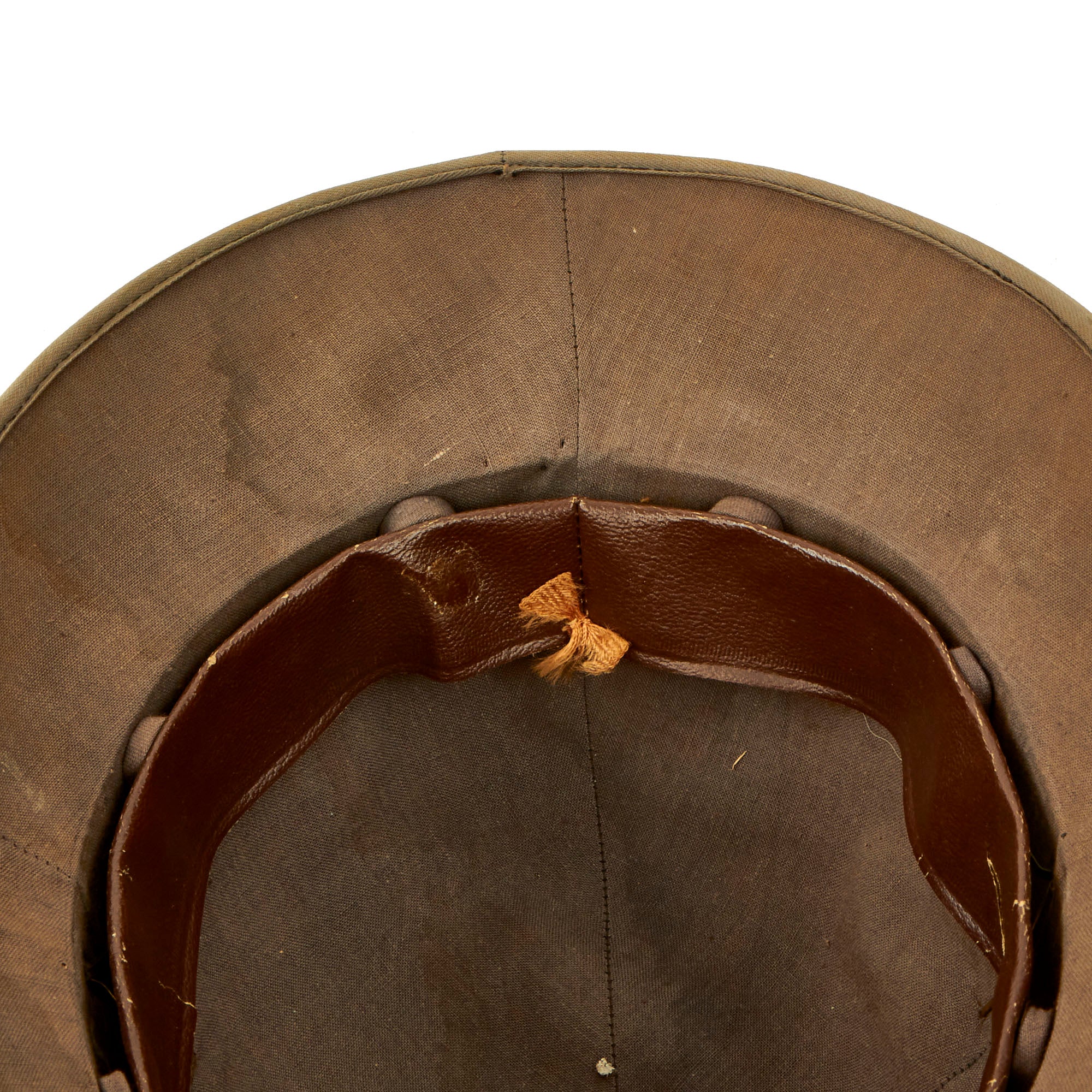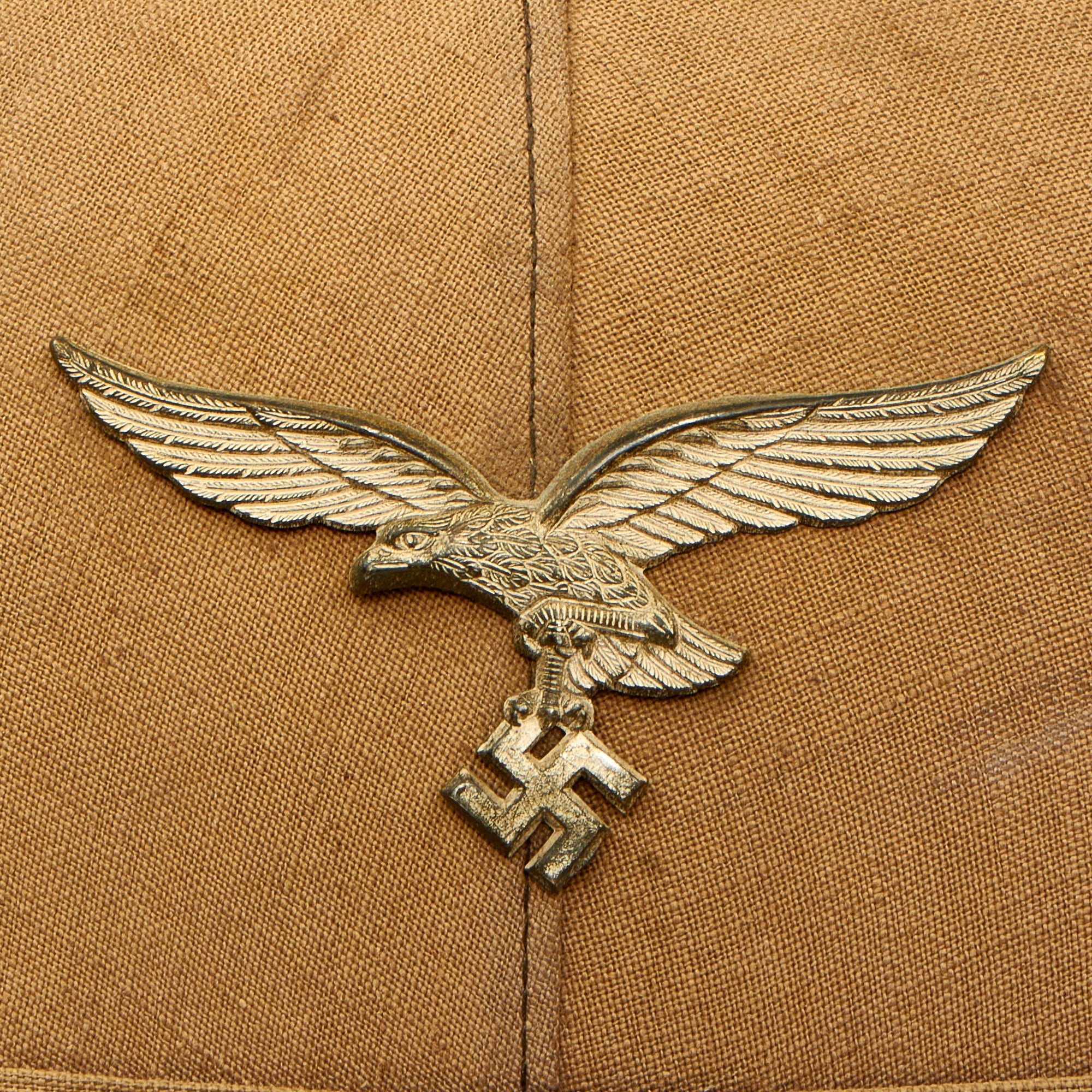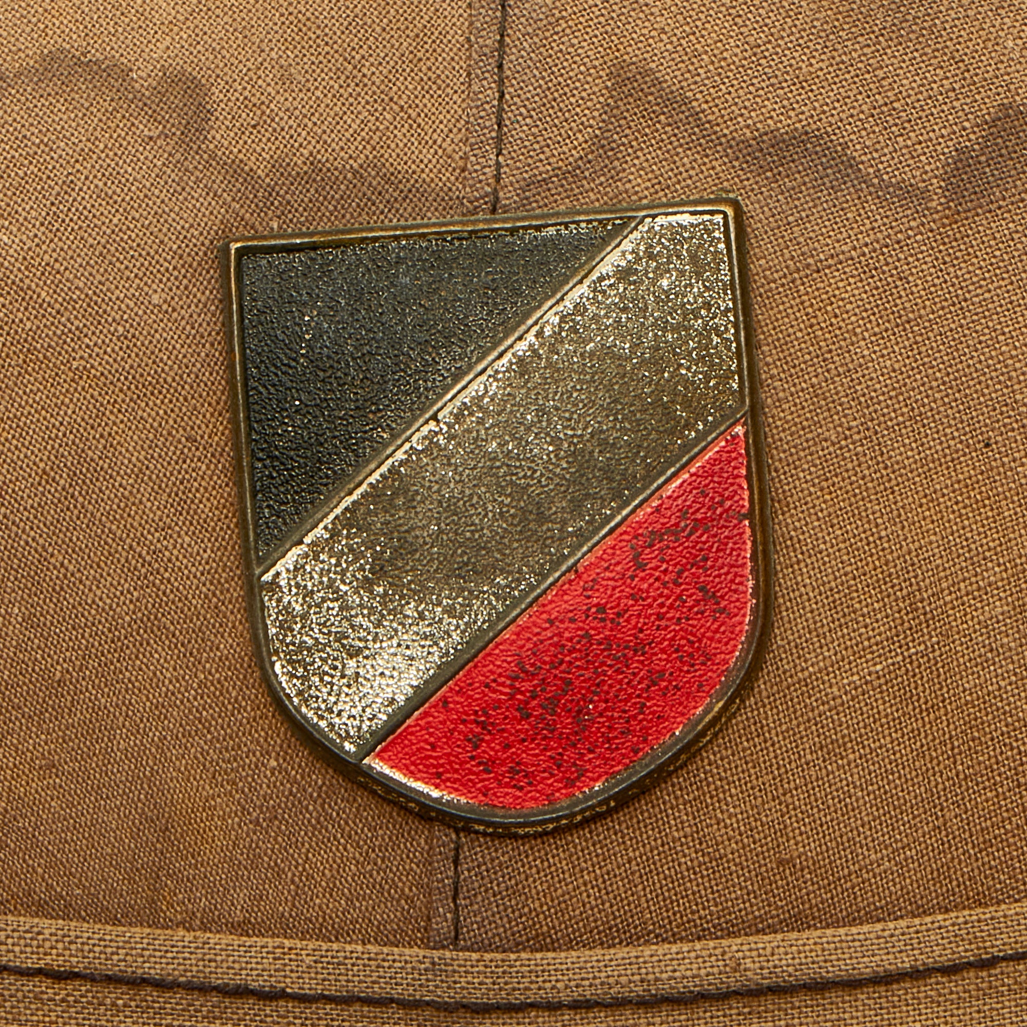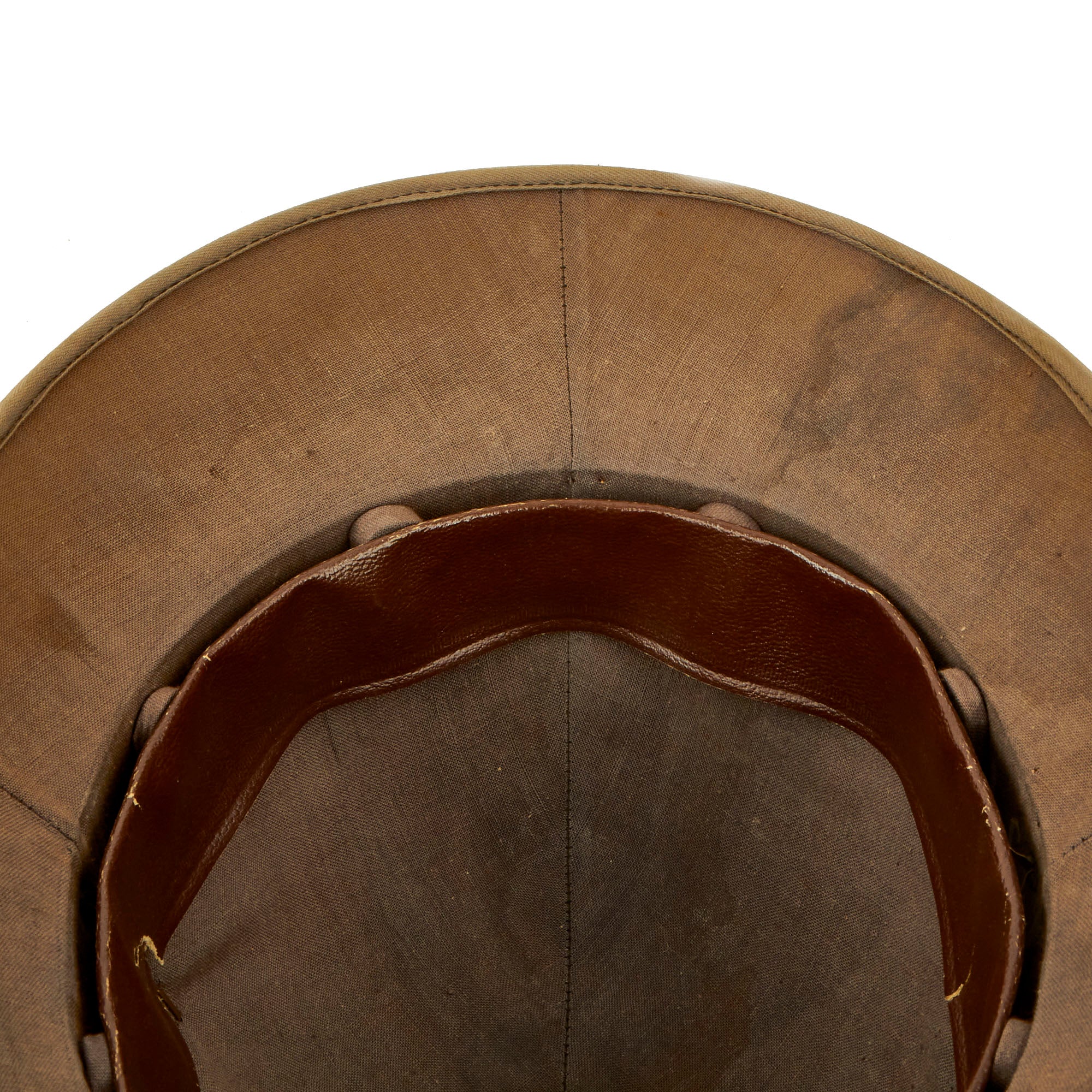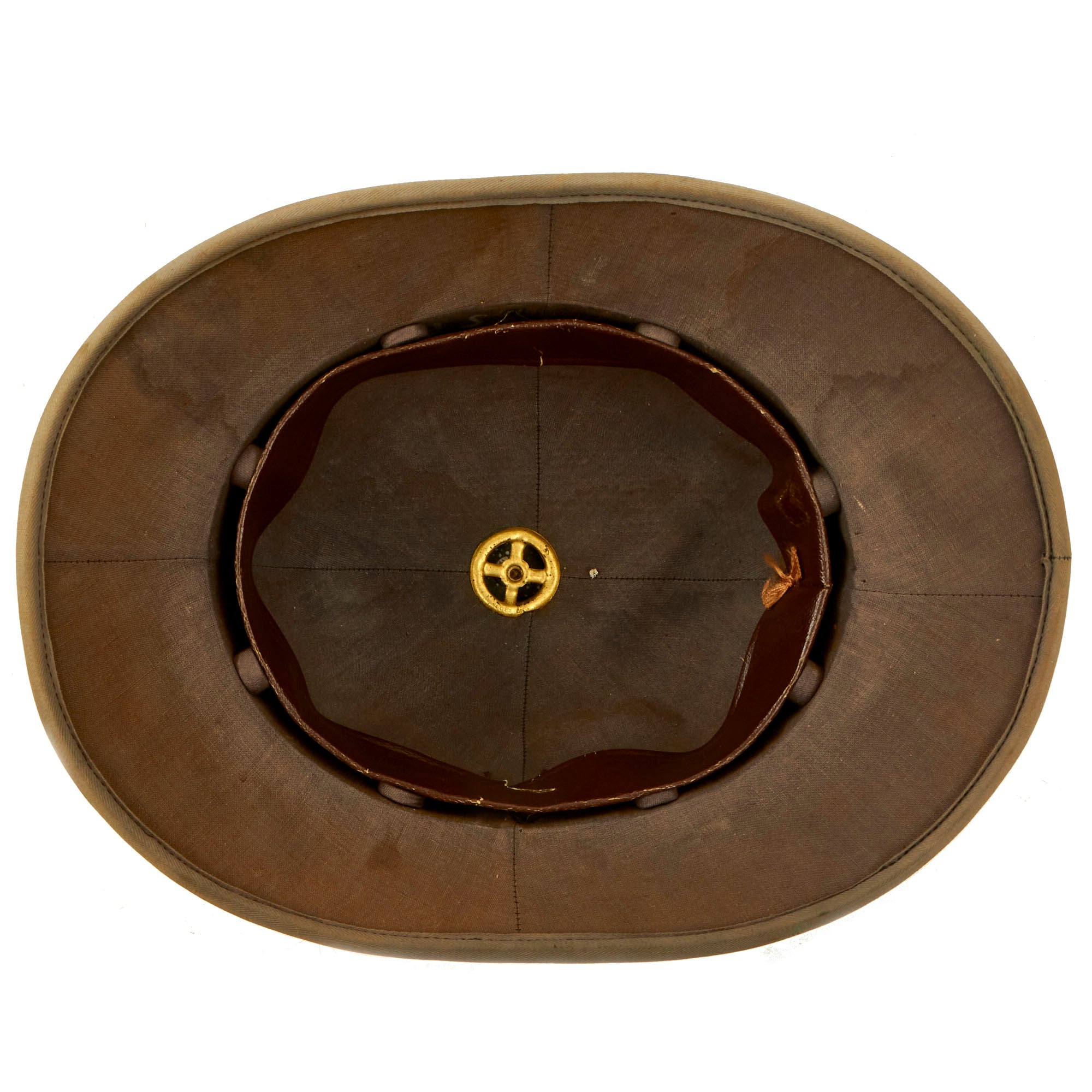 Original Item: On first deployment to North Africa in 1941, Deutsches Afrikakorps (DAK) troops were issued with the traditional European sun helmet known as Tropische Kopfbedeckung, of the type known to the British forces as the solar topi (or topee). In the German case, these were made of pith, were khaki in color and bore two metal shields; on the right the national colors and on the left the German eagle. There were several models made, with the first model having cotton outer covering made of six fabric panels sewn together.