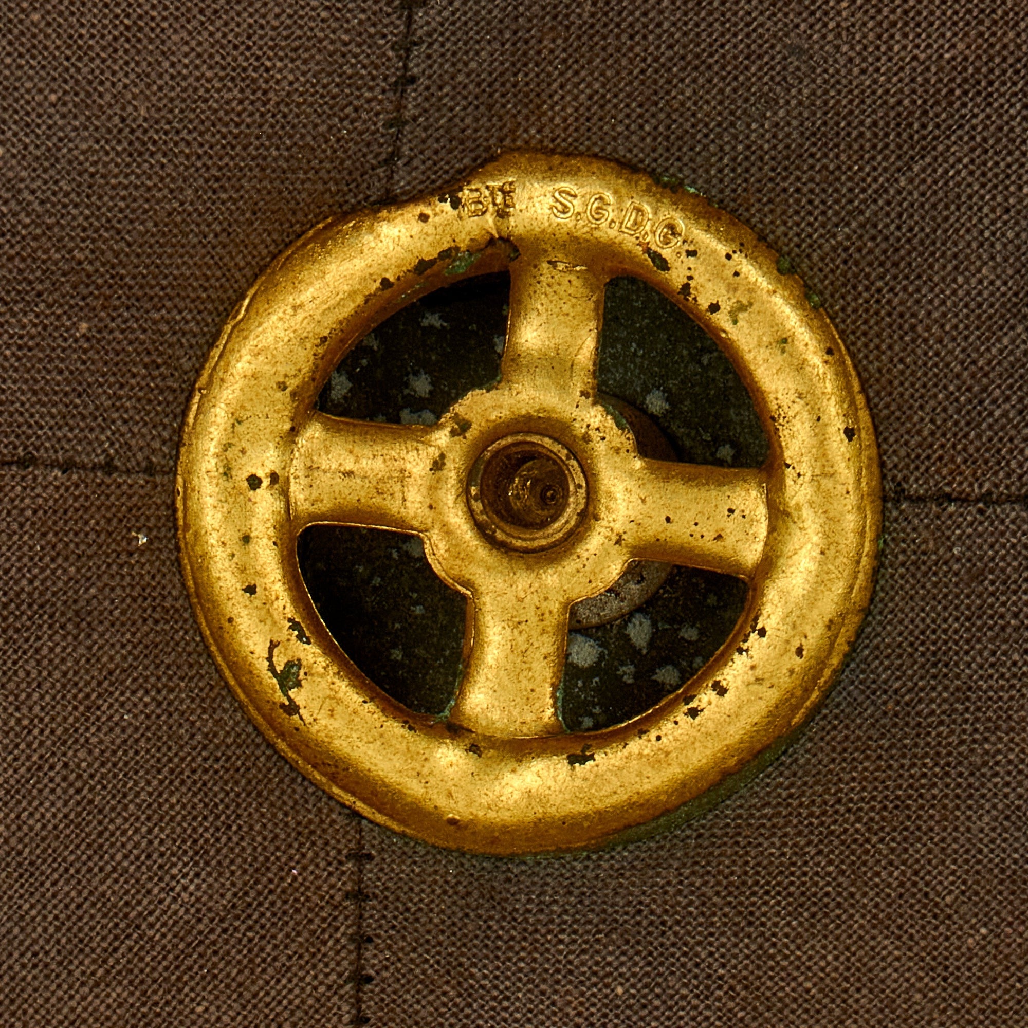 The top crown vent under side is marked B'TE S.G.D.G., which stands for Breveté Sans Garantie Du Gouvernement, or "Patented Without Government Guarantee". This type of marking would only be ween on a French made helmet, and all of the other aspects are completely correct. The metal badges are totally genuine and are in very good condition with a great finish, and a lovely patina. Both look to be made from brass with aluminized paint, and now show the base material in areas due to wear.