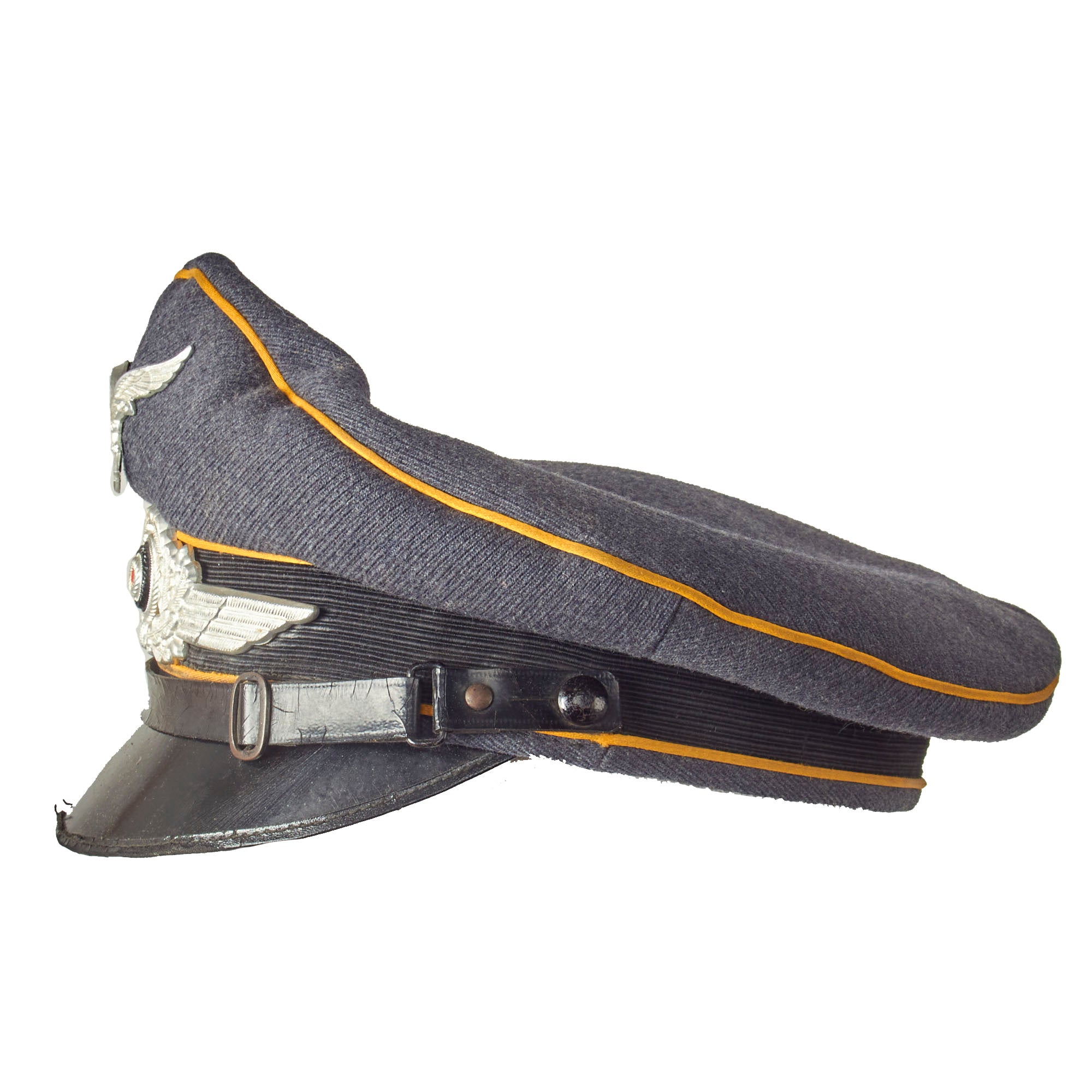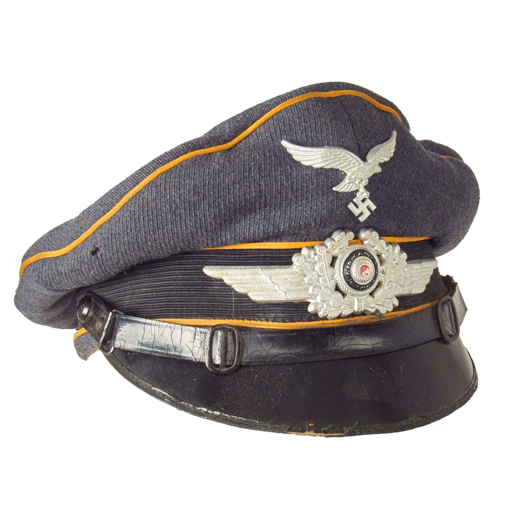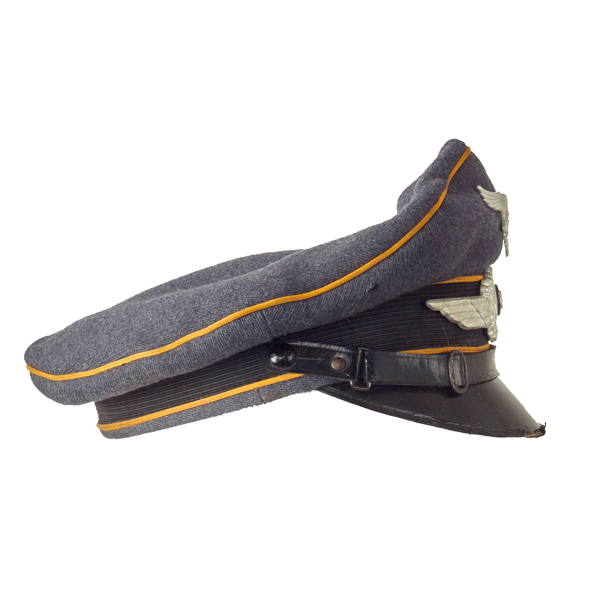 Original Item: Only One available. This is a very nice service worn condition Flight Branch Luftwaffe EM & NCO Visor Cap. A wonderful honest example with a fantastic swept back shape. It has the great "crushed" saddle form appearance which we all love. This excellent wartime EM & NCO Schirmmütze Visor Cap was a high quality manufactured visor. It is fabricated in Luftwaffe fliegerblau (flyer's blue) grey blue "whipcord" woven wool, with wide black wool cap band, plus three rows of goldgelb (Gold-Yellow) color piping for the flight branch (Waffenfarbe) around the circumference. This included Aviator troops such as pilots and ground personnel as well as Fallschirmjäger (parachute troops).