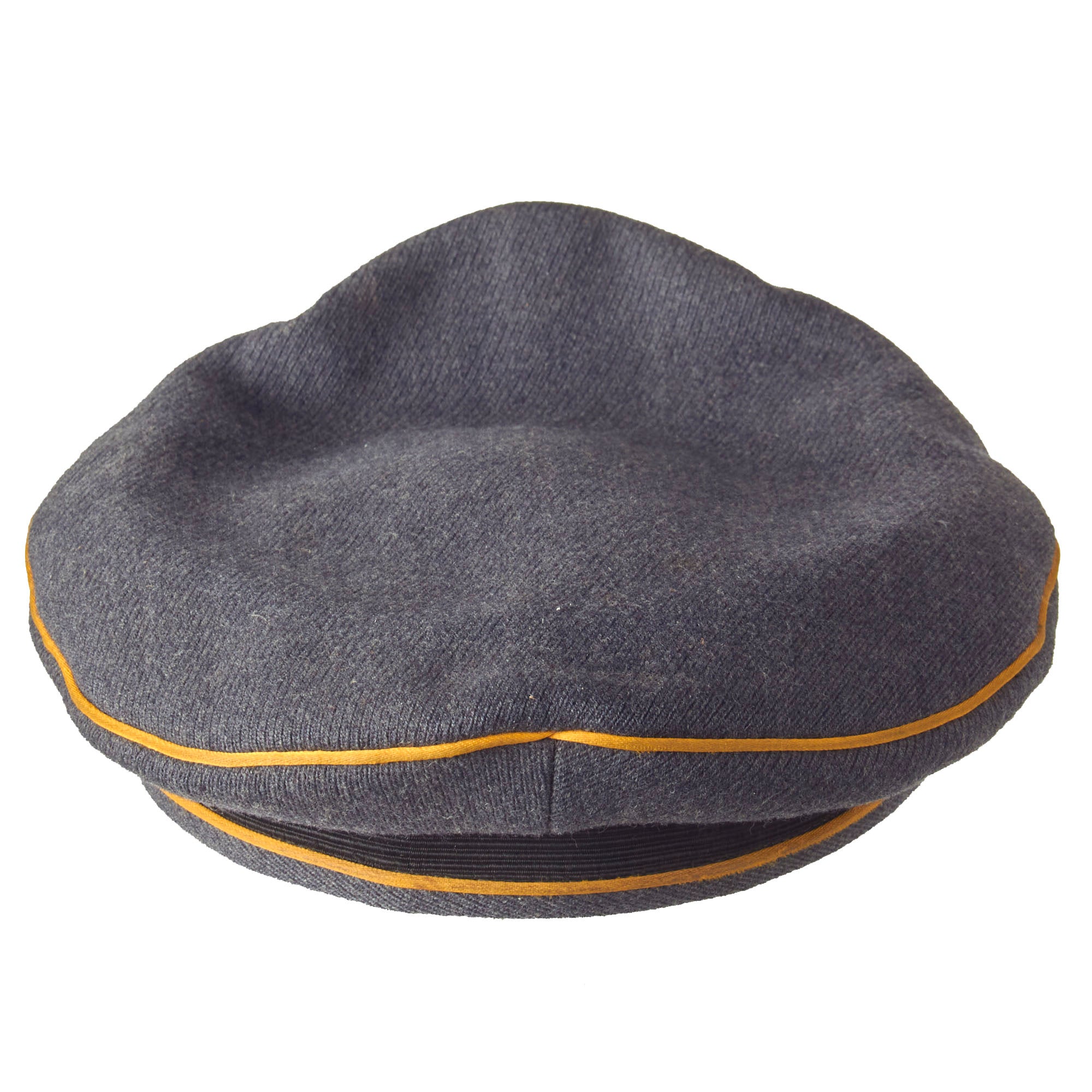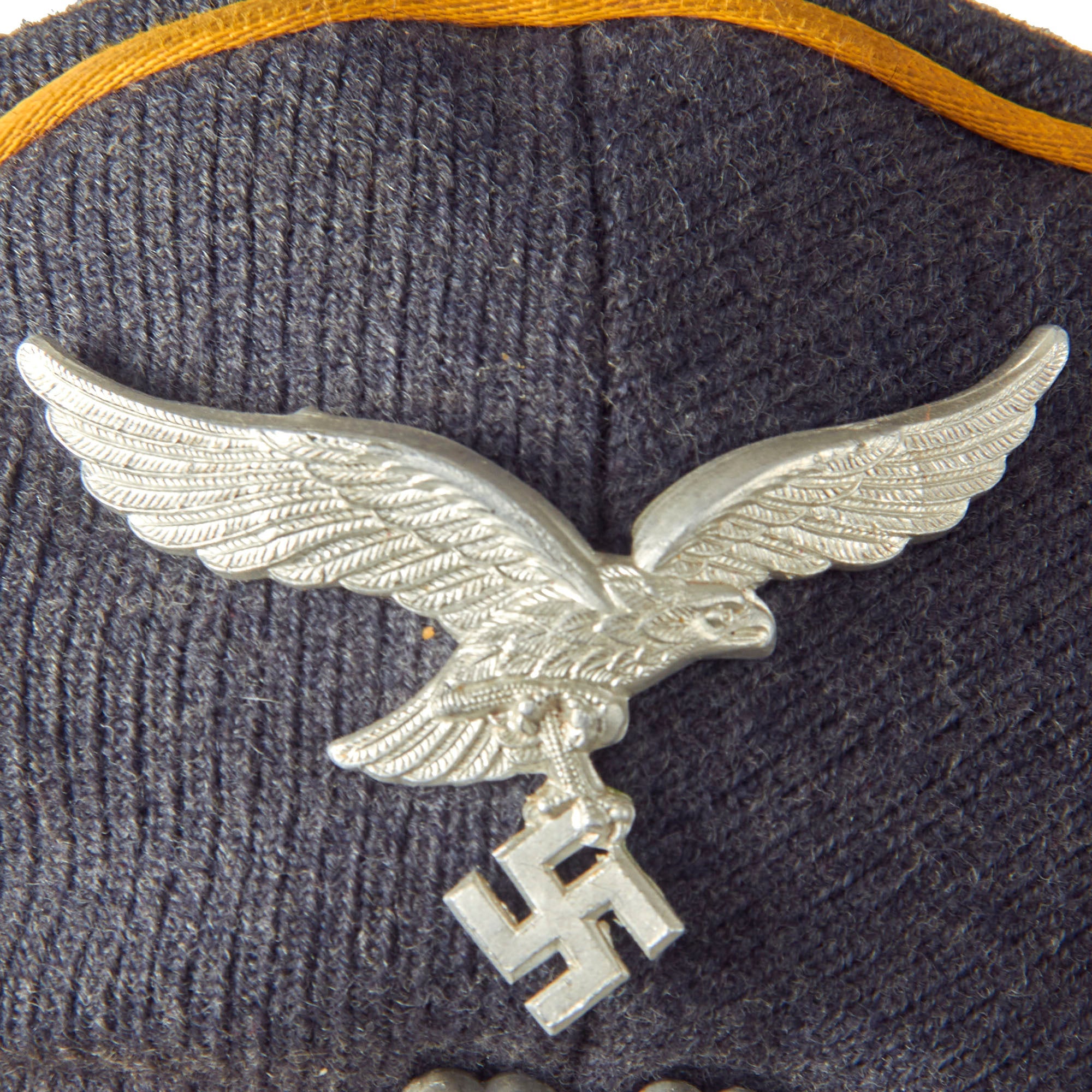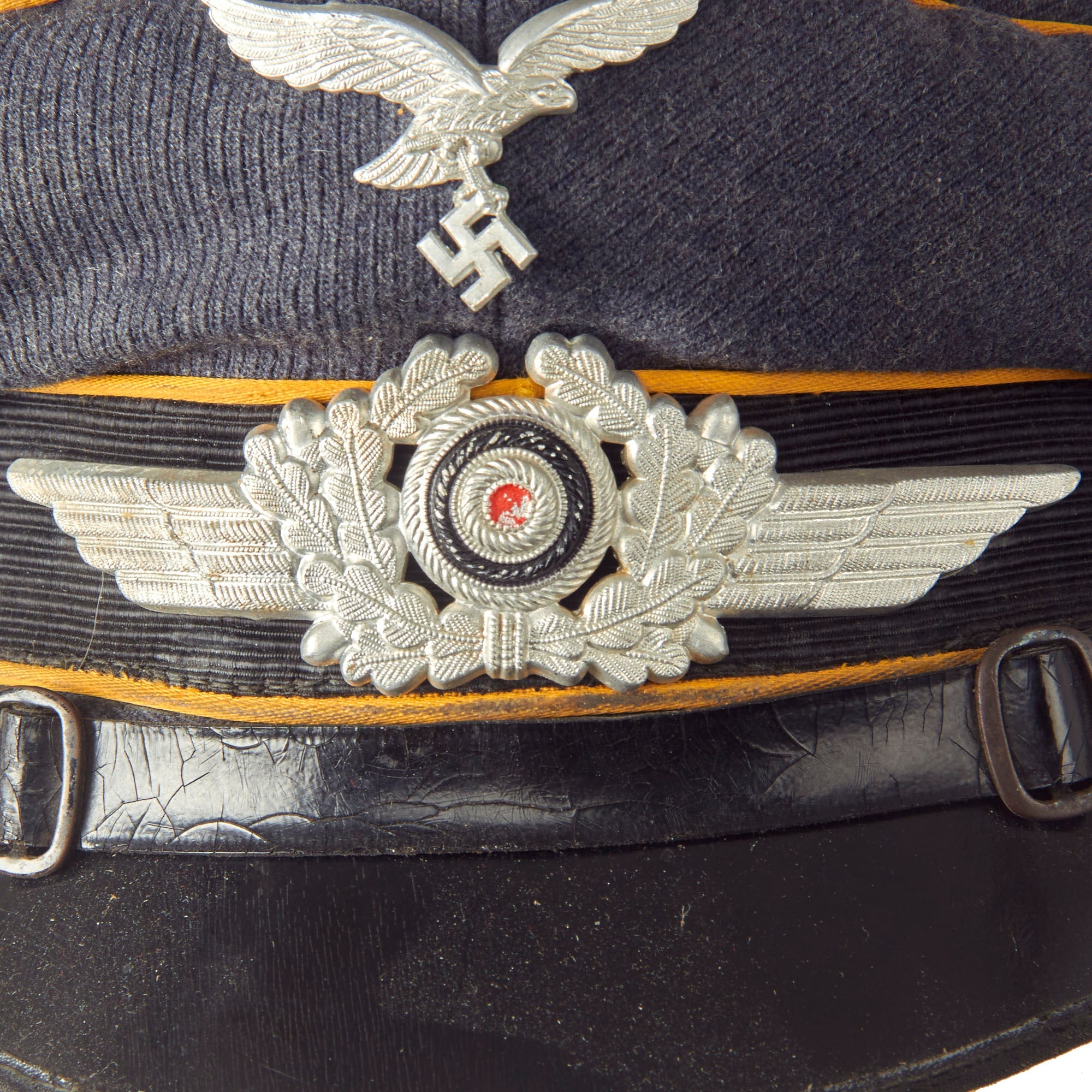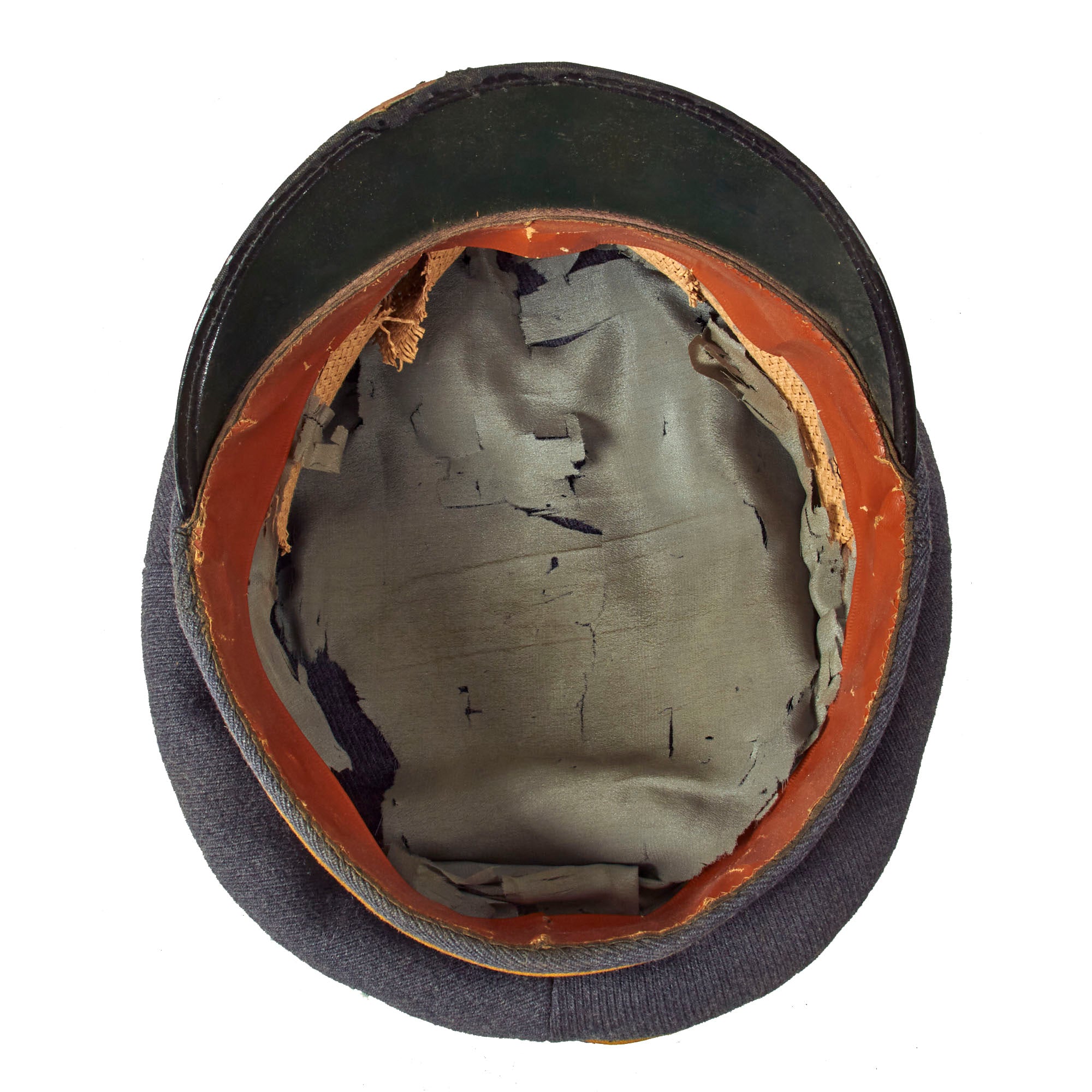 Original Item: Only One available. This is a very nice service worn condition Flight Branch Luftwaffe EM & NCO Visor Cap. A wonderful honest example with a fantastic swept back shape. It has the great "crushed" saddle form appearance which we all love. This excellent wartime EM & NCO Schirmmütze Visor Cap was a high quality manufactured visor. It is fabricated in Luftwaffe fliegerblau (flyer's blue) grey blue "whipcord" woven wool, with wide black wool cap band, plus three rows of goldgelb (Gold-Yellow) color piping for the flight branch (Waffenfarbe) around the circumference. This included Aviator troops such as pilots and ground personnel as well as Fallschirmjäger (parachute troops).