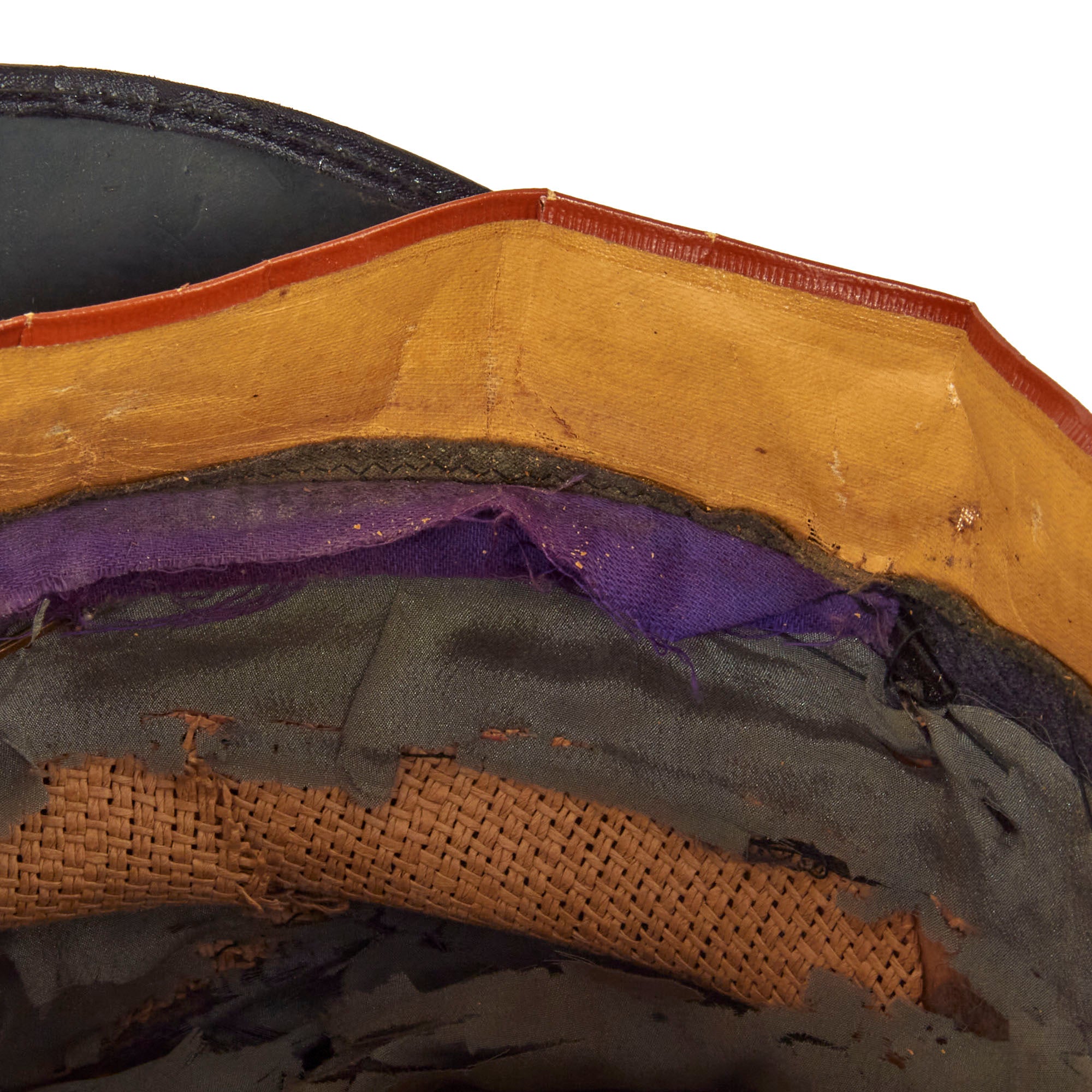 The body with its gold-yellow piping is in very good shape, with just bit of damage on the upper right crown on the exterior. The interior however shows quite a bit of wear, with the light blue gray rayon lining pretty much falling apart due to wear. The wicker under layer can be seen in many areas on the front, as well as the cardboard stiffener for the sweatband, which is made from brown finished oilcloth. The sweatband is mostly intact, but unfortunately has become brittle over time. Size is about a 57-58cm.