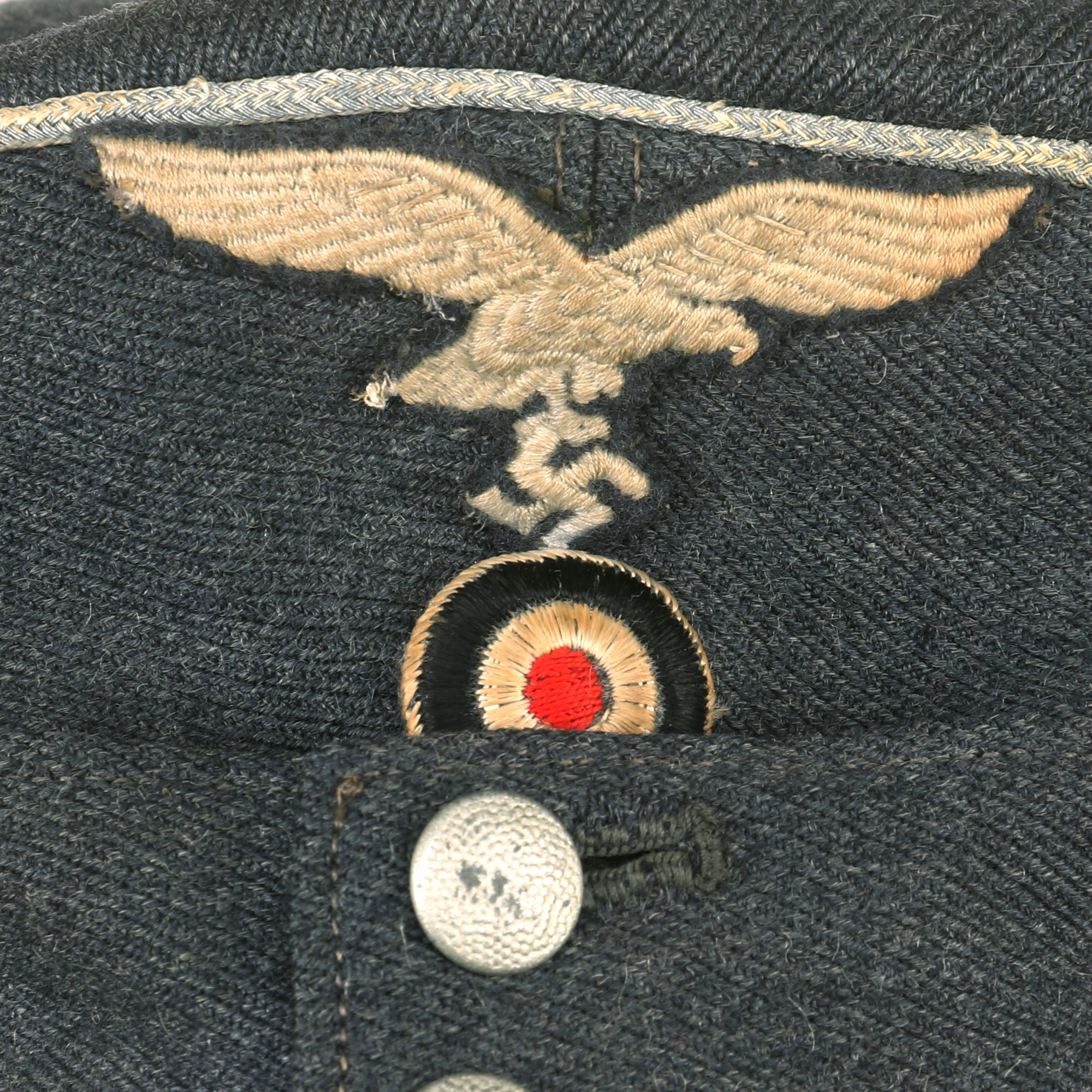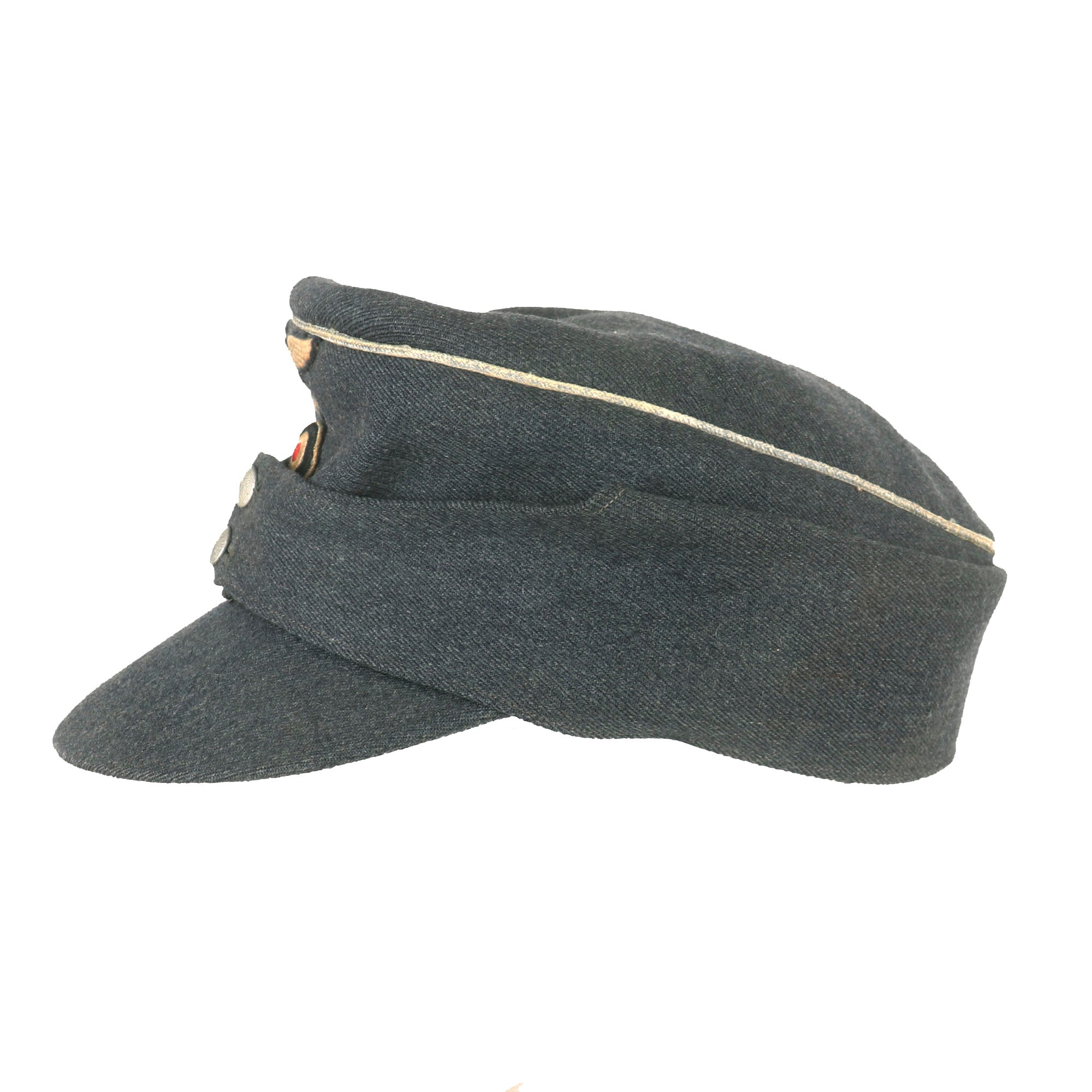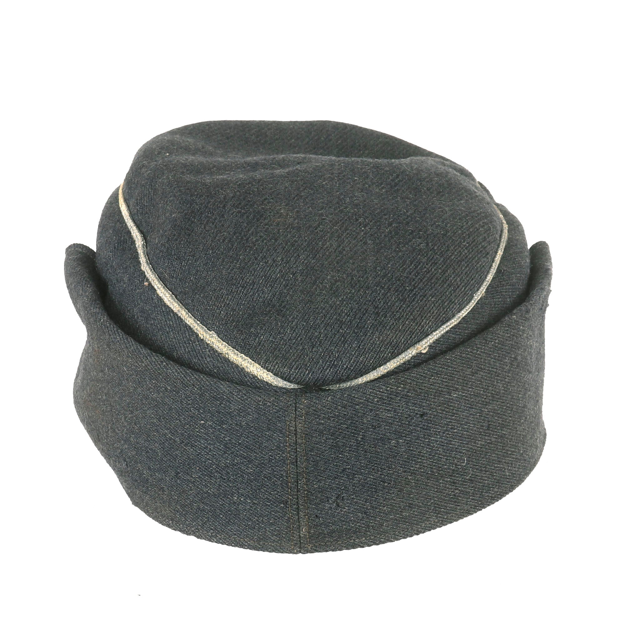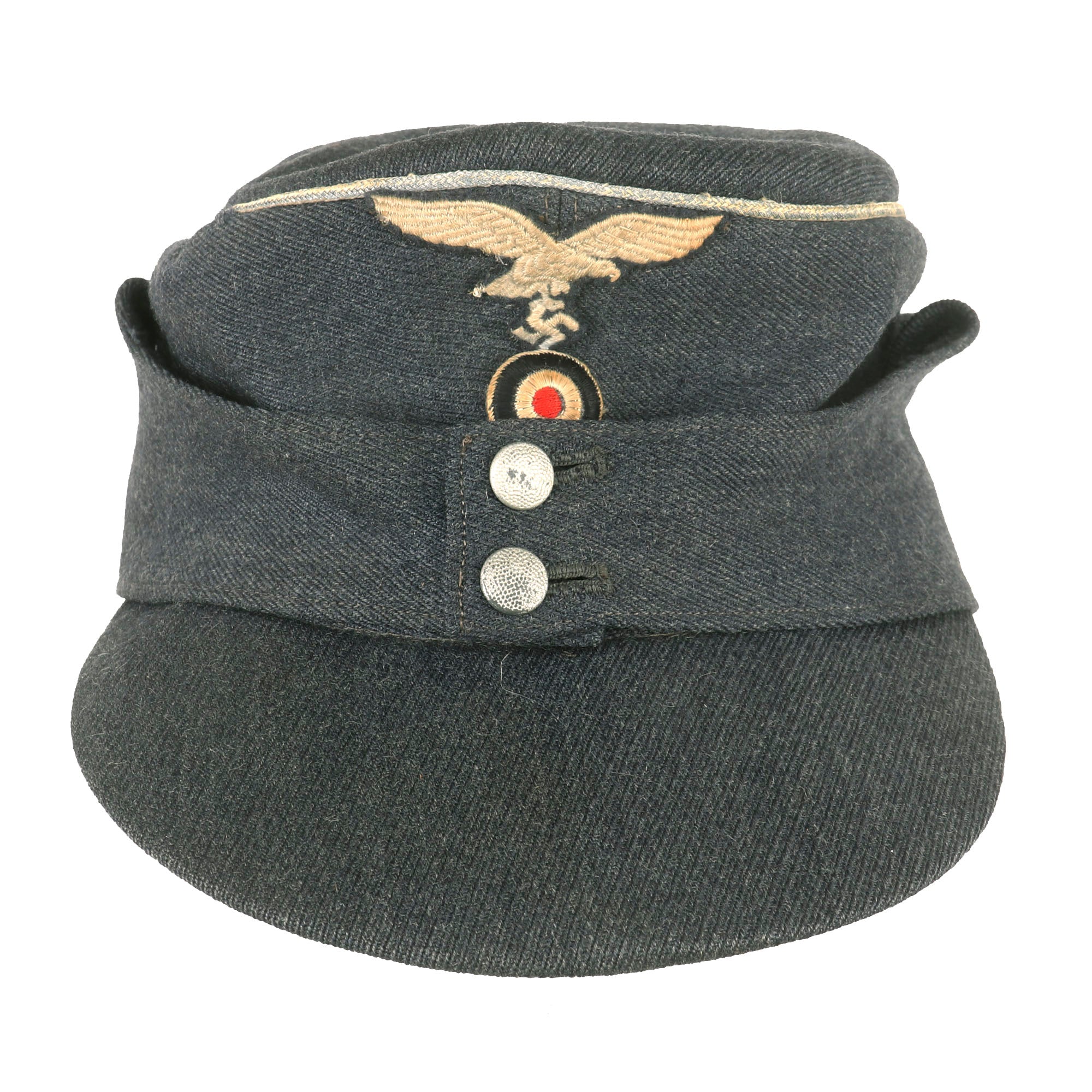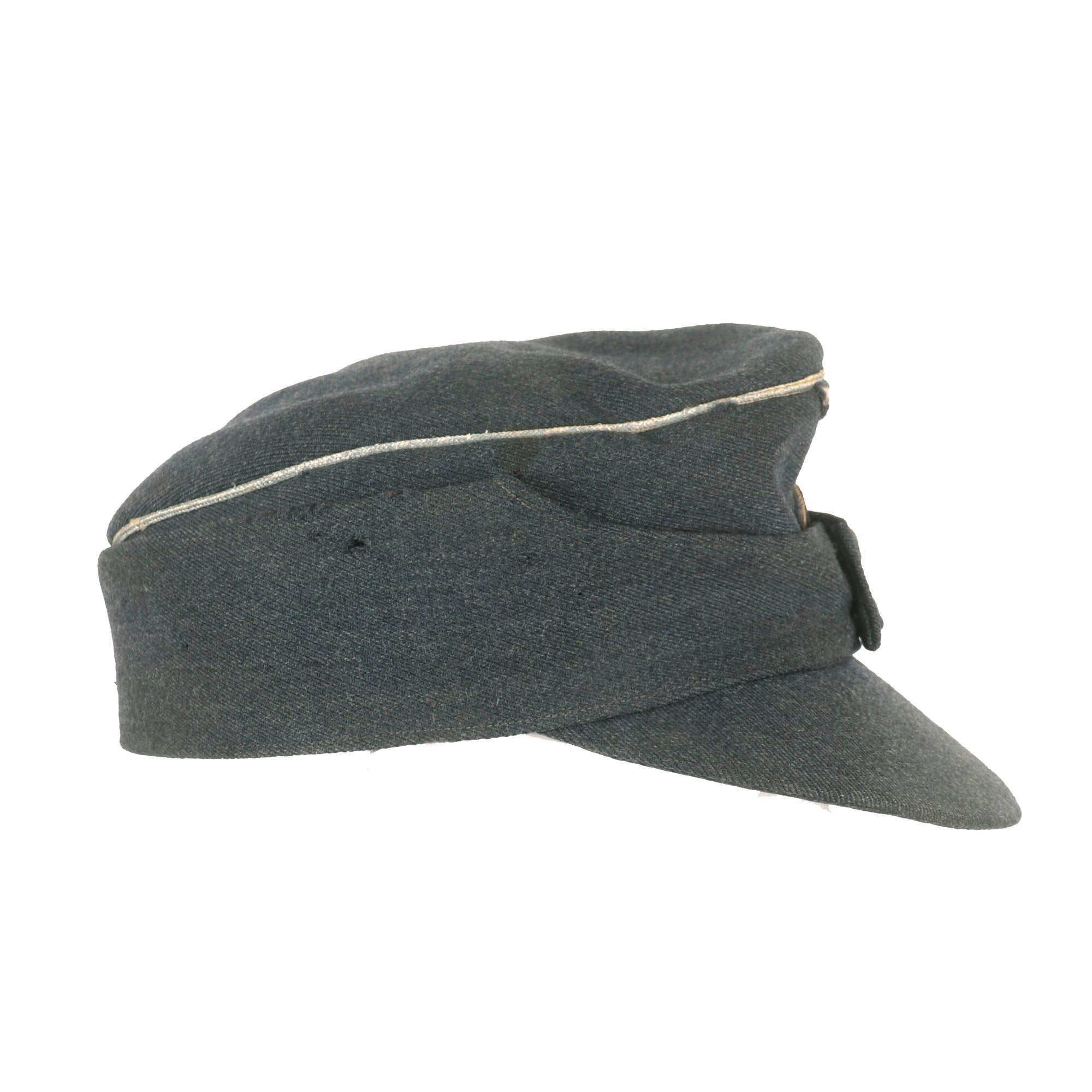 Original Item: Only One Available. This is a very nice example of a Luftwaffe M43 Einheitsmütze Wool field cap, with a great service worn look. The cap is constructed of Luftwaffe blue Fliegerblau (Flyer's Blue) blue/grey wool, and has the correct "fold down" skirt for colder weather. It features two pebbled aluminum buttons to the front, securing the skirt, and has the correct loops on the underside. There is silver bullion piping around the crown of the cap, however much of the bullion has worn away.