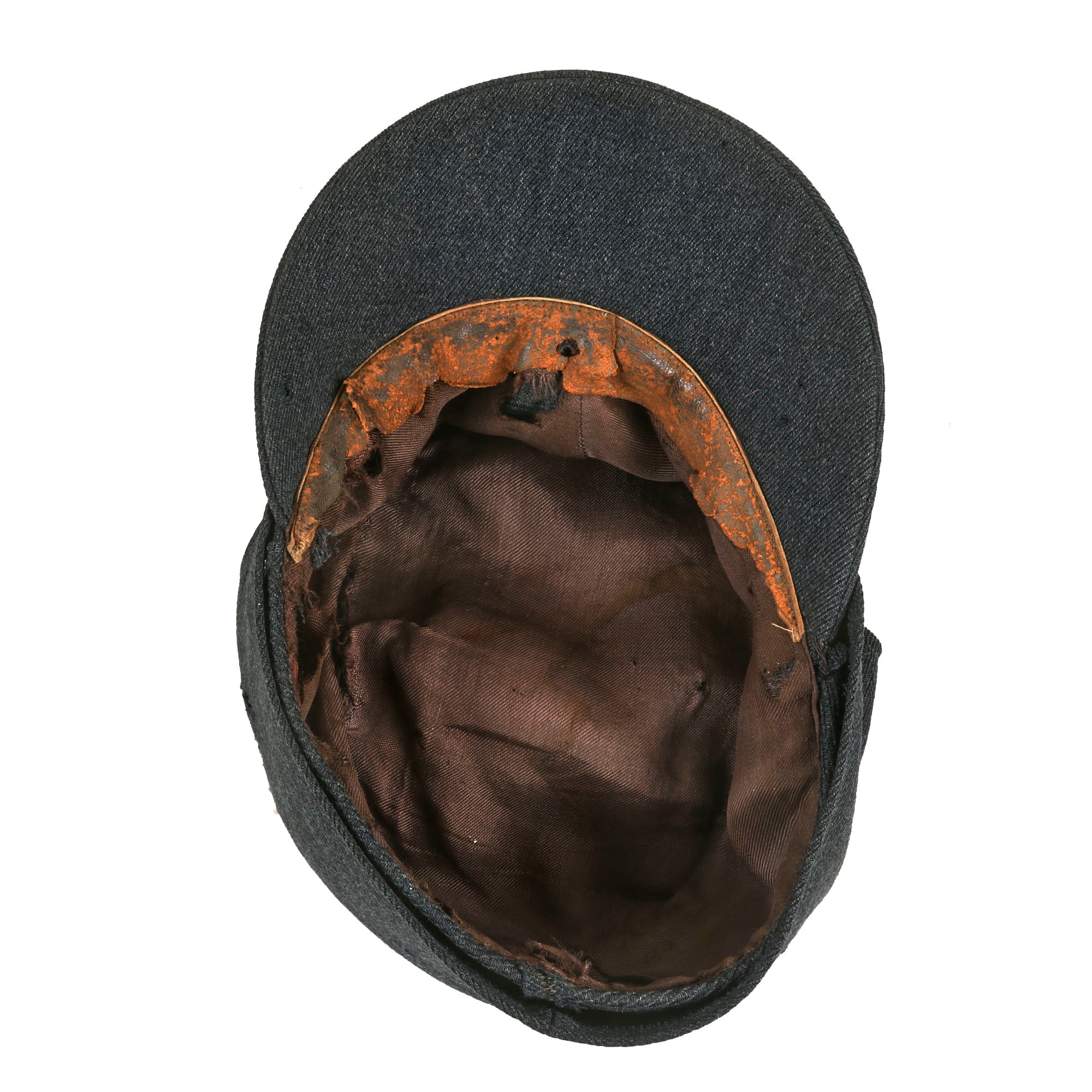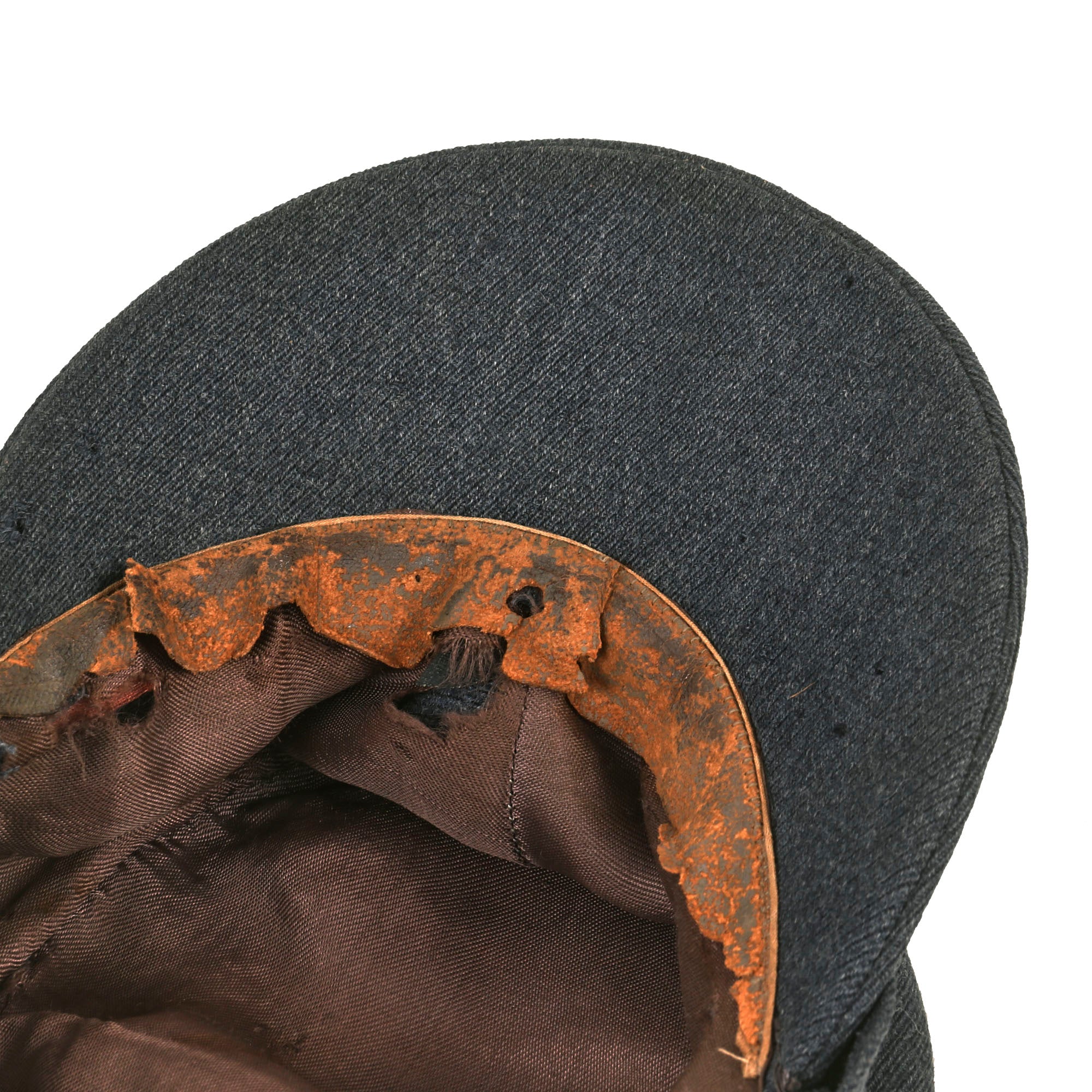 The peak of the cap has a very nice cap eagle with cockade underneath, both hand sewn on. The interior of the cap is a brown rayon material, which is standard for this type of cap. The interior of the cap is very heavily worn, with the sweatband being heavily worn and torn, with much of it gone. It has light sweat stains around the edge, and any markings are completely gone.
