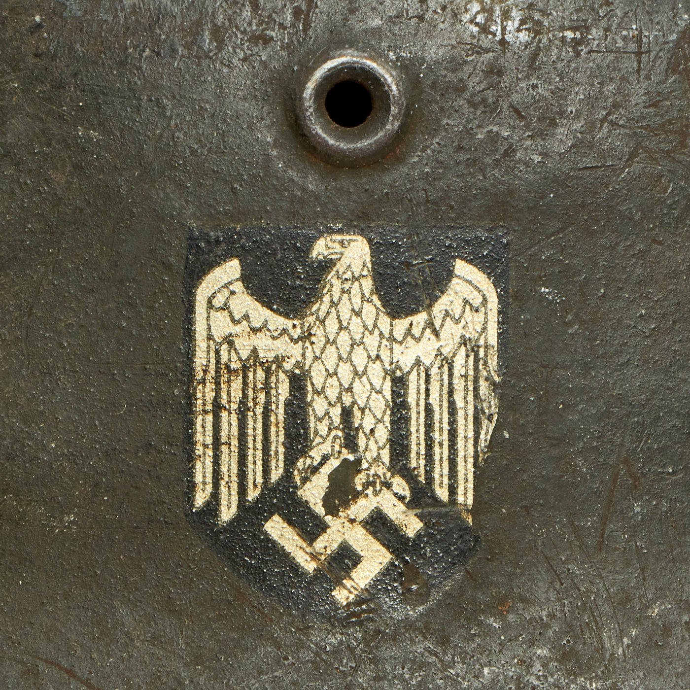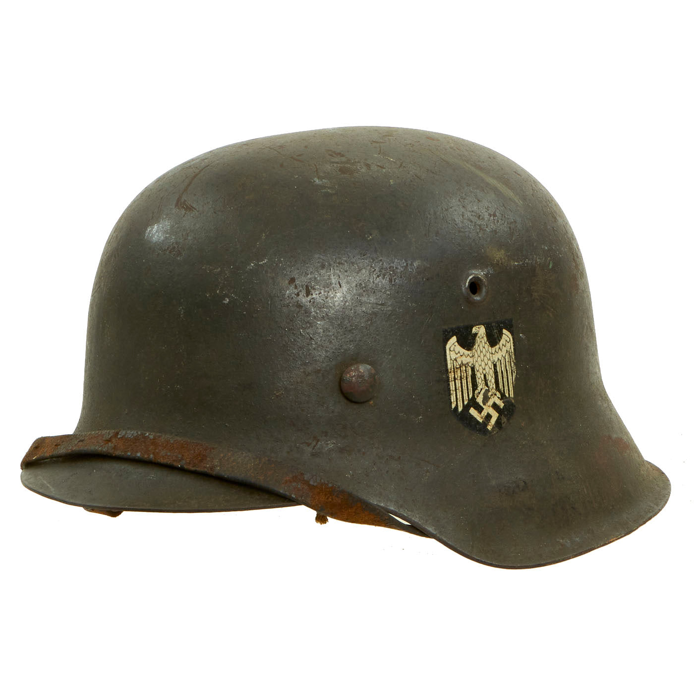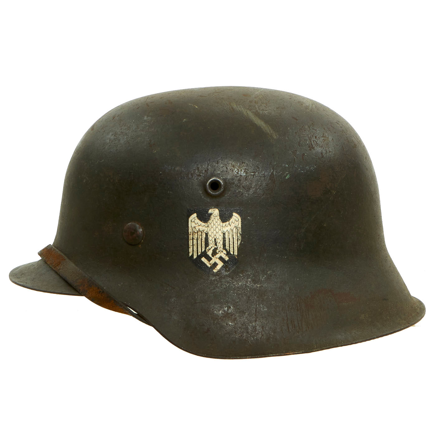 Original Item: Only One Available. This is a very nice all original example of a German Model 42 Steel helmet, as issued to the Wehrmacht Heer (army). This stamped sheet steel construction helmet retains over 80% of its original paint, with overall light wear consistent with use in service. The left side of the helmet features a very nice Heer eagle decal. The decal is retained about 90%, with some small areas chipped out with the paint, however the silver color is still very vibrant. This is a very nice example of the M42 helmet, with great looking decal, and a great look!