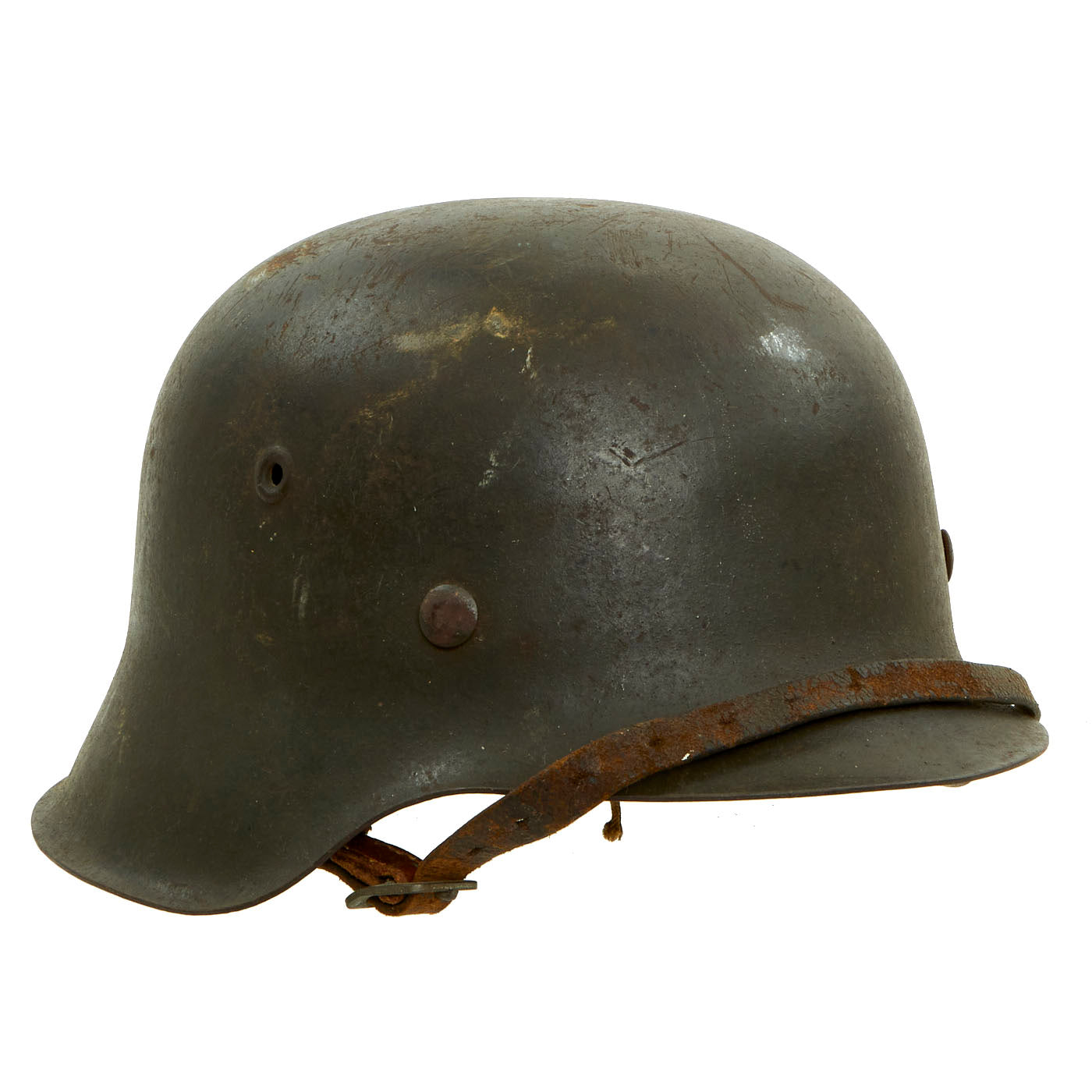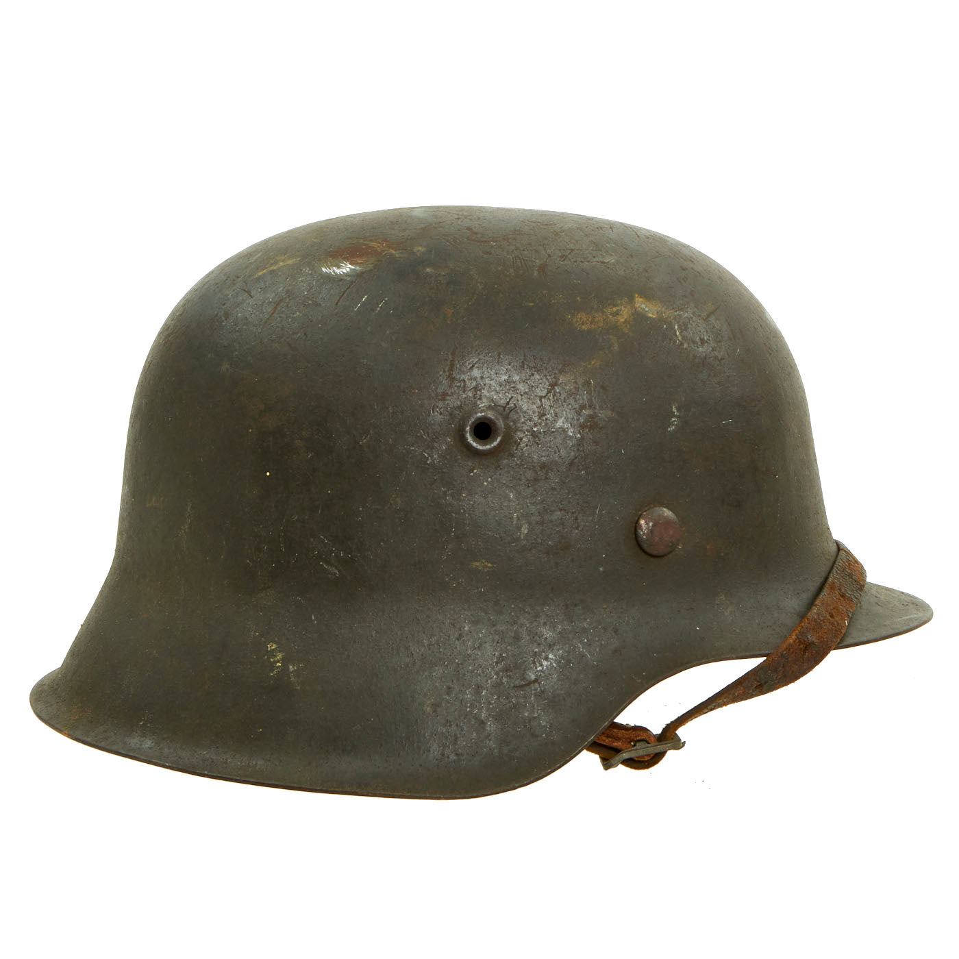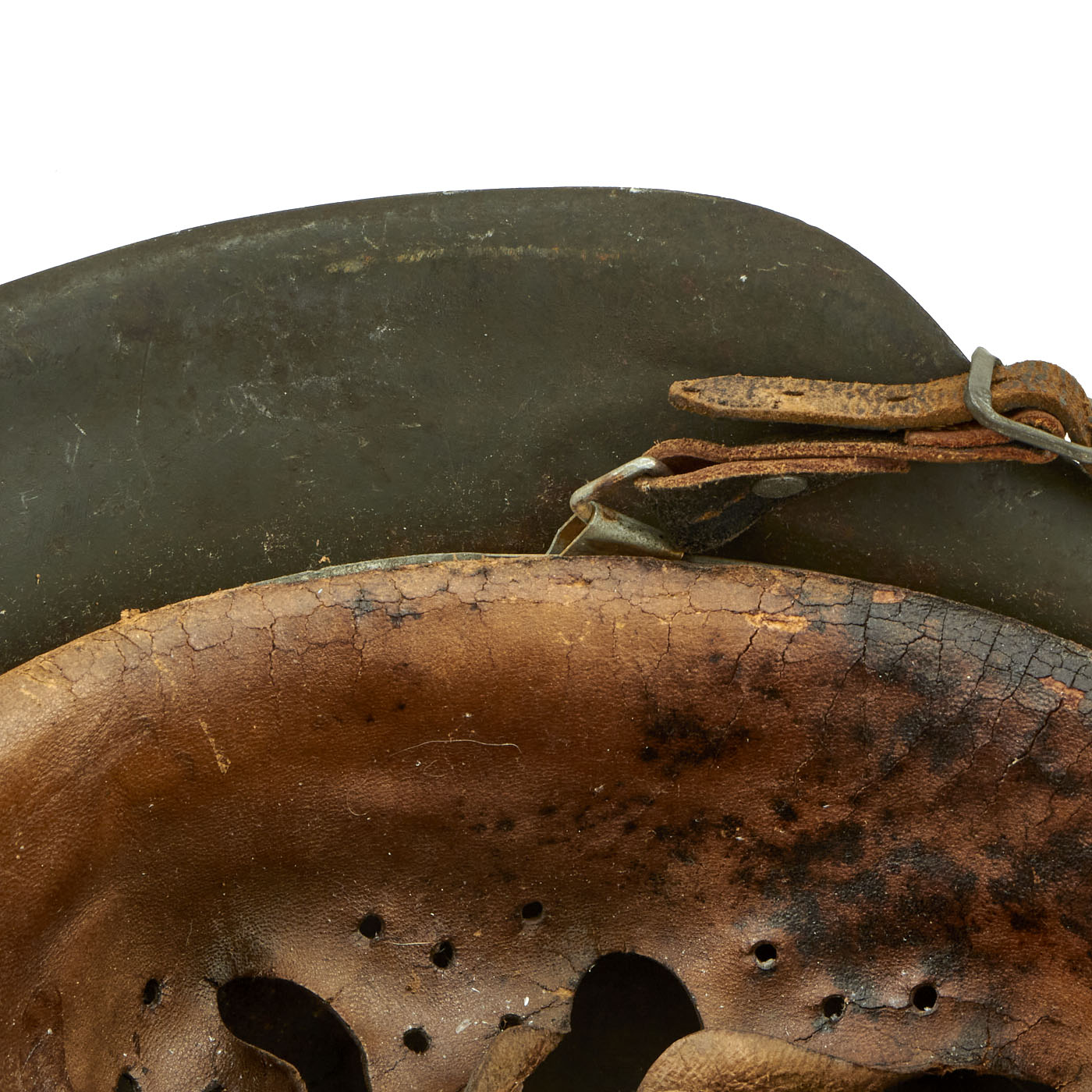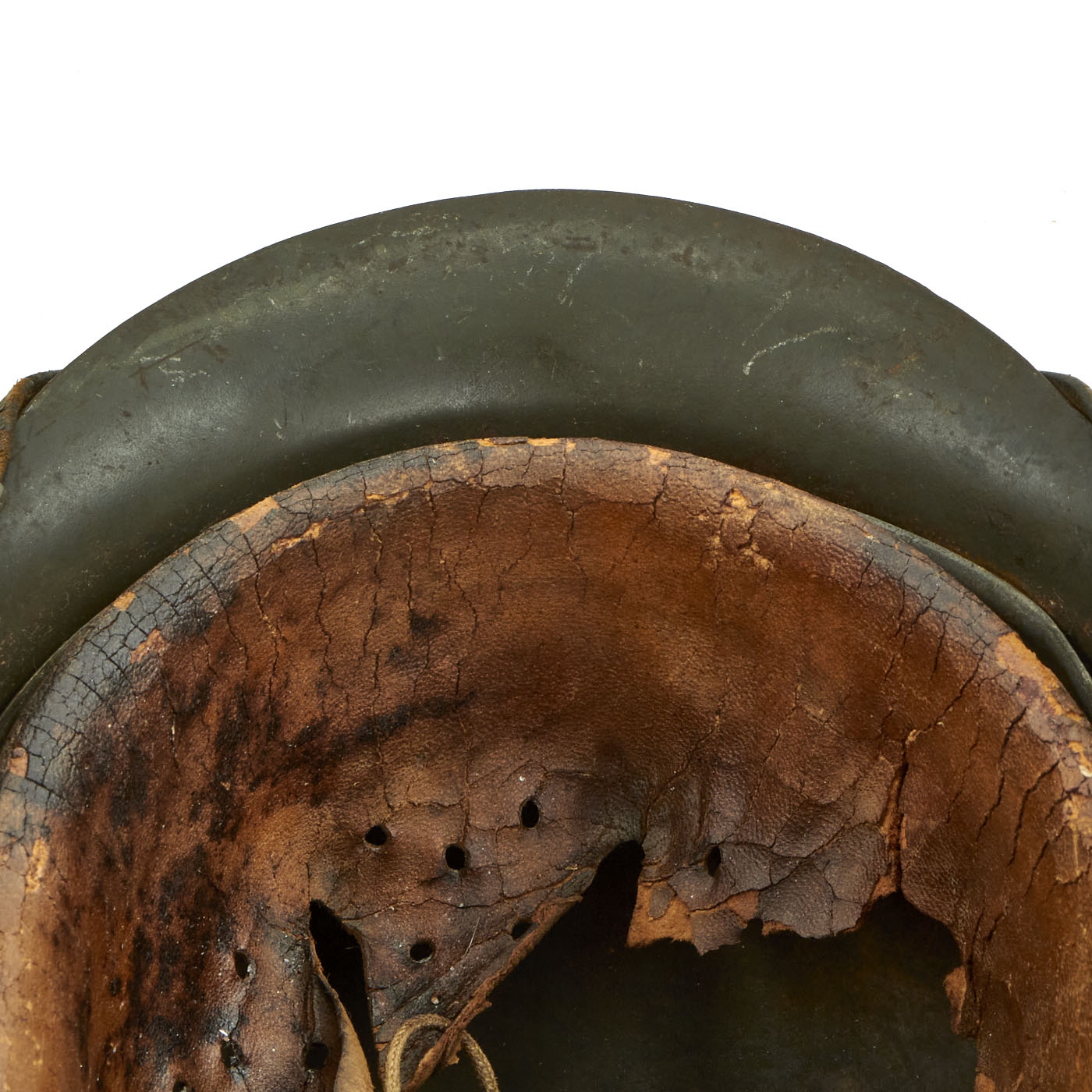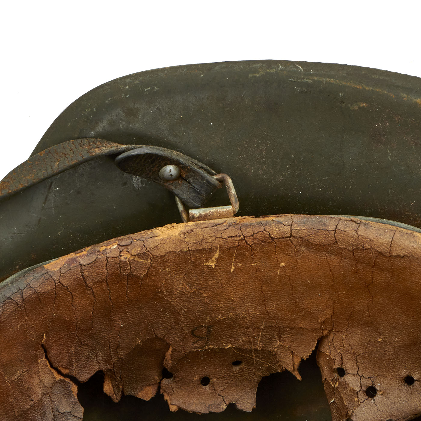 The chinstrap is complete and soft but has deteriorated and stretched slightly due to age. We checked and were not able to find any markings, however it definitely looks to be original to the helmet.