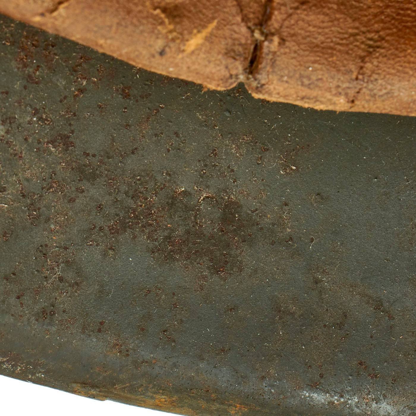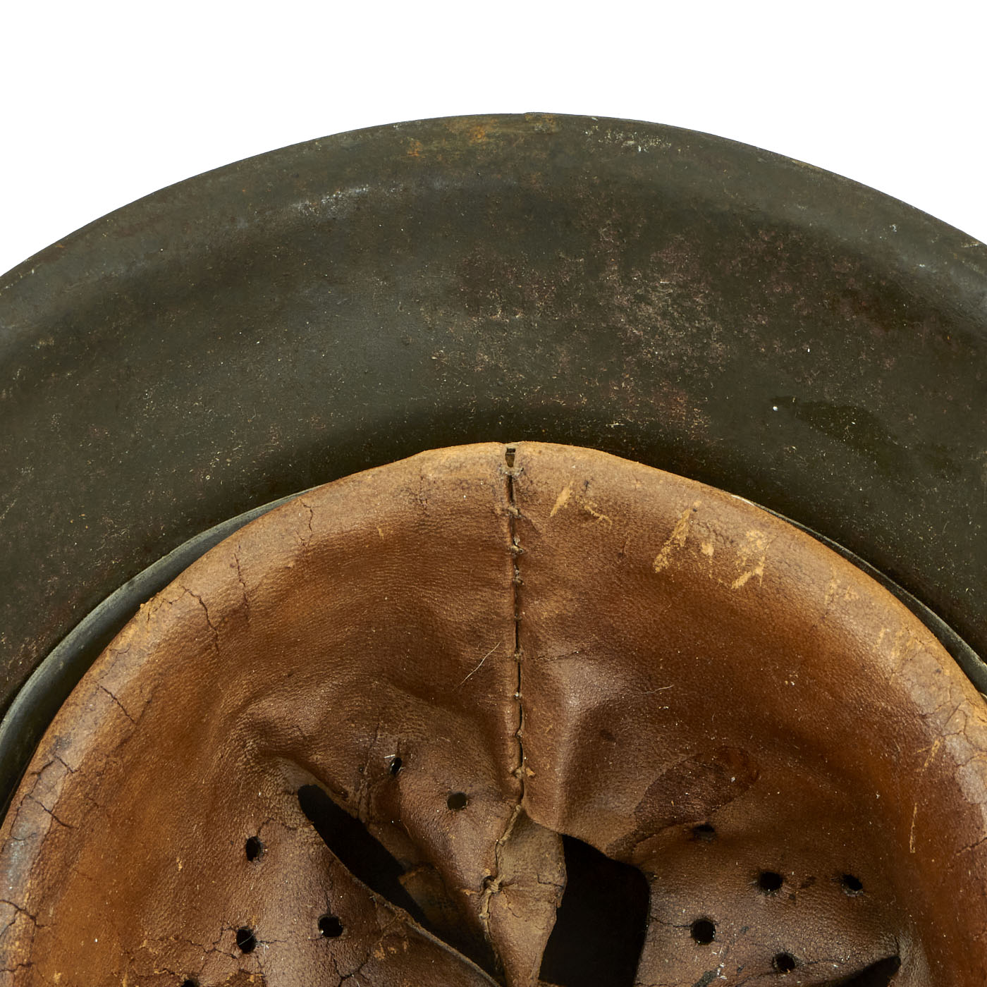 All three liner retaining pins are intact, though they have lost much of their original paint. The interior of the helmet still has the original M31 leather liner present, however the leather is in dark and in delicate condition, with only six of the eight fingers are intact. The other two tore off, and the ends are still attached to the original top tie, which is in good condition. The late war issue galvanized steel liner band is marked on the left outer side with 64 nA / 56, indicating that the liner is a size 56, intended for a 64 shell. The right side displays the full manufacture information (Very faint), as well as a date: