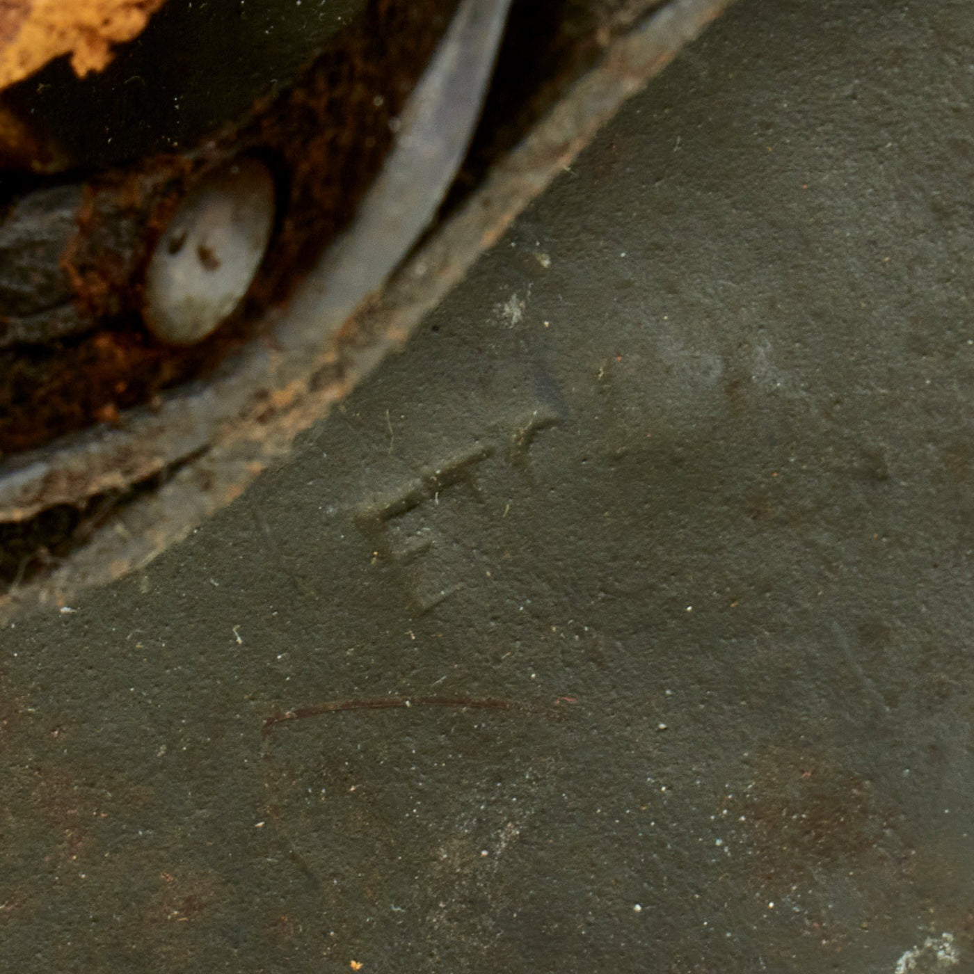 Above the left ear interior of the apron has a stamped manufacturer's code and size ET64 indicating it was manufactured by Eisenhuttenwerk AG, in Thale, Harz. Size 64 is a medium size shell, which can accommodate size 56-57 liners. The larger size makes these harder to find and more desirable to a collector. It is also marked with lot number 1606 on the underside of the rear skirt.