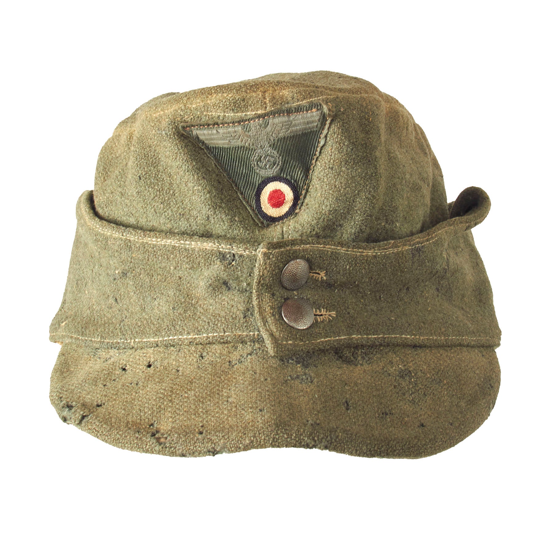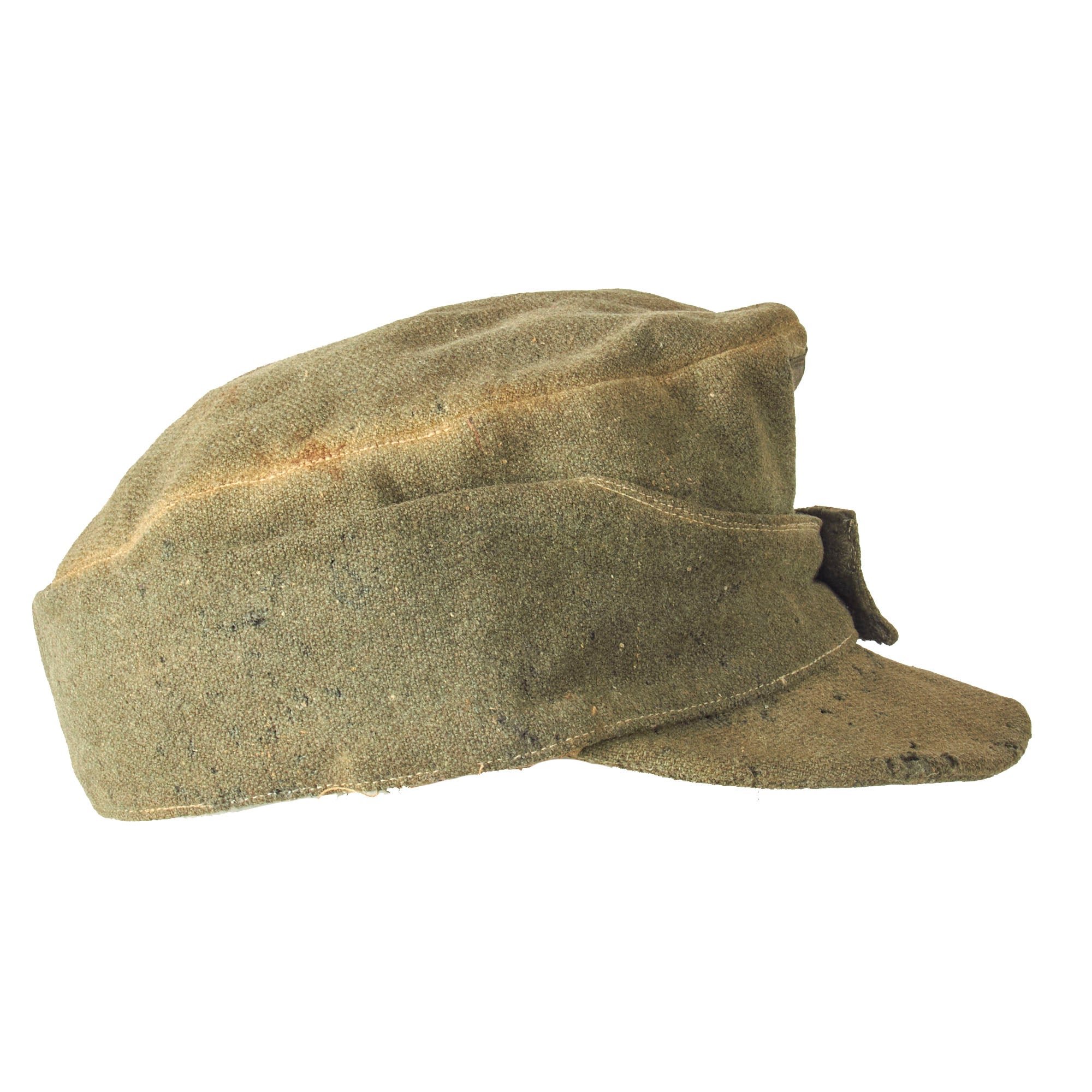 Original Item: Only One Available. This is fantastic "salty" heavily service worn mid war M43 Heer Feldmütze (Army Field Cap), faintly marked 60 on the interior. It is constructed of wool gabardine cloth, with fold-down panels with squared scallops to the front and forward sides, covering the entire neck on the sides and rear when in use. When not in use, the panels are raised with their ends resting upon the visor, being joined together by two magnetic pebbled buttons. The visor is reinforced with cardboard, and covered in matching gabardine cloth, and is now quite "rippled" due to wear and moisture exposure.
