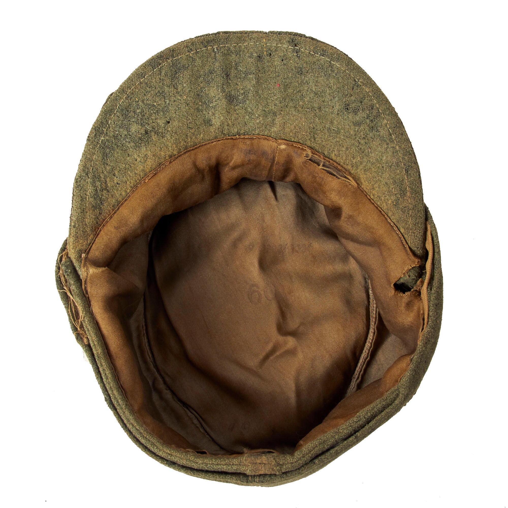 Sewn in place in the front of the cap is a Heer cap insignia trapezoid constructed of BeVo style machine woven grey and green embroidered threading in the shape of a standard eagle over an embroidered cockade. This patch is stitched through to the interior of the cap, so the original badge may have needed replacement due to wear. The interior of the cap looks to be olive rayon, which is now worn. There is a faded size 60 on the top, as well as what looks to be a very faded RBNr. business number.