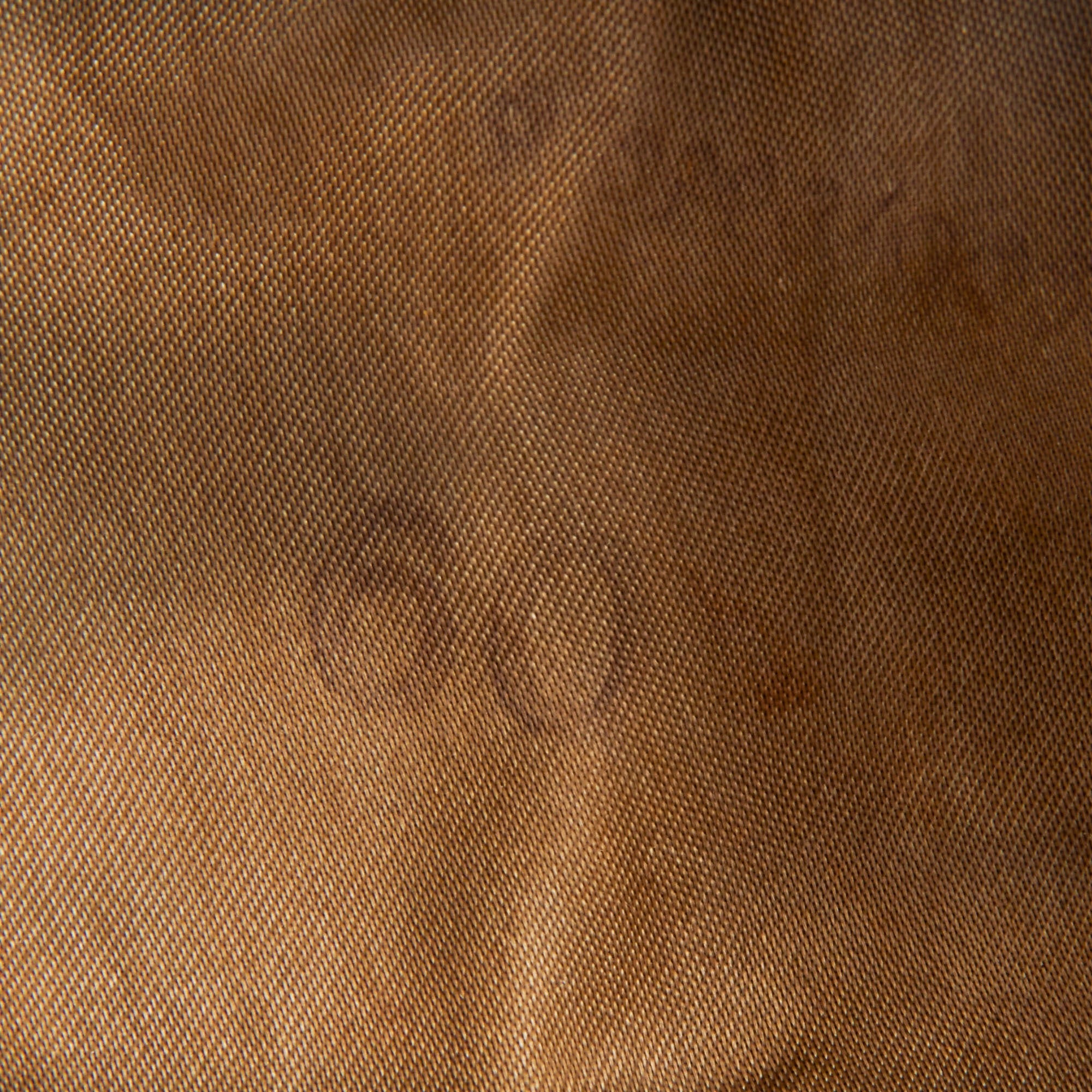Condition of the cap is definitely "well worn", with wear through the fabric in many areas, and some possible moth damage. The rayon lining shows quite a bit of deterioration along the forehead area. Looking under the fold down side panels, you can see the original color and texture that the cap had before staining from use and exposure.
