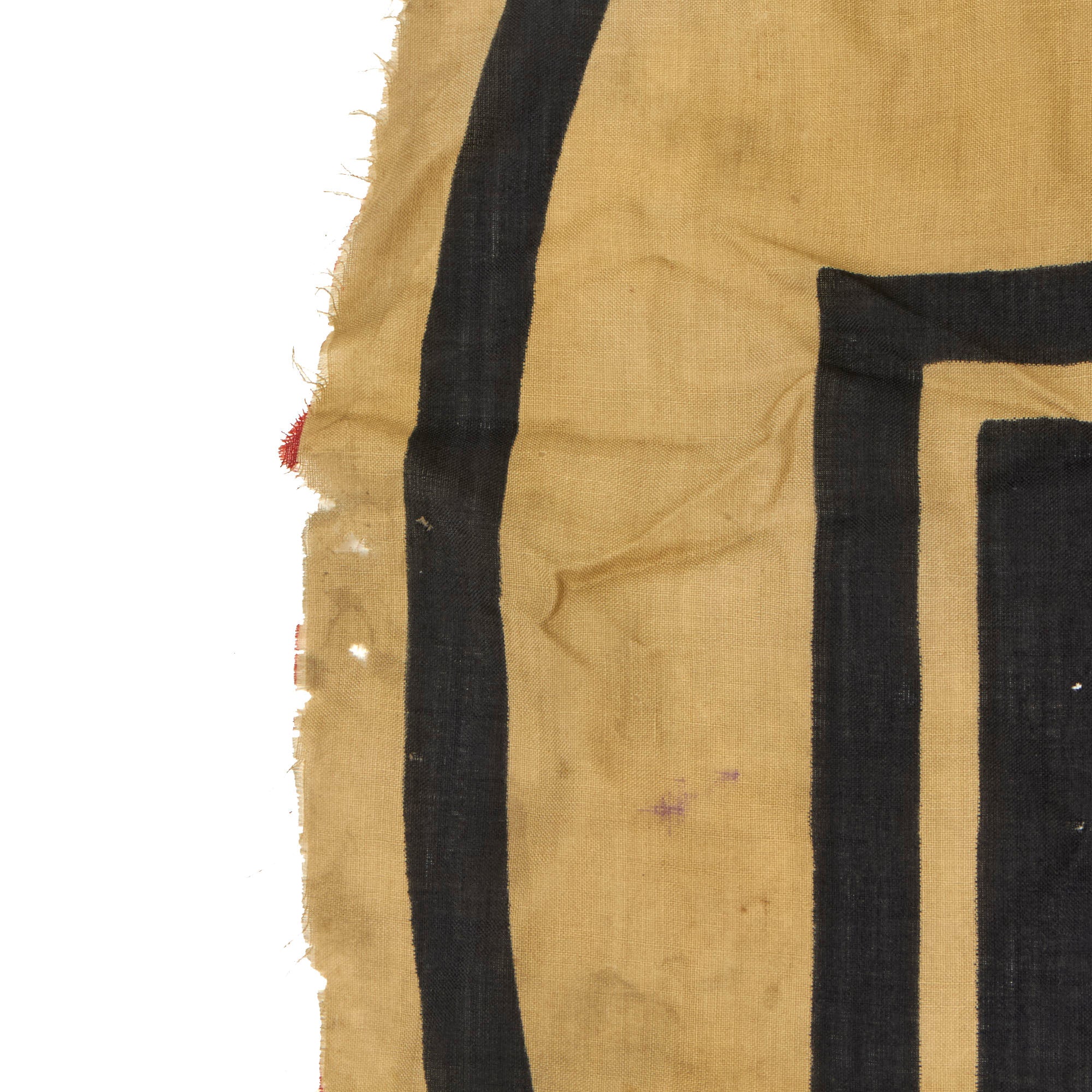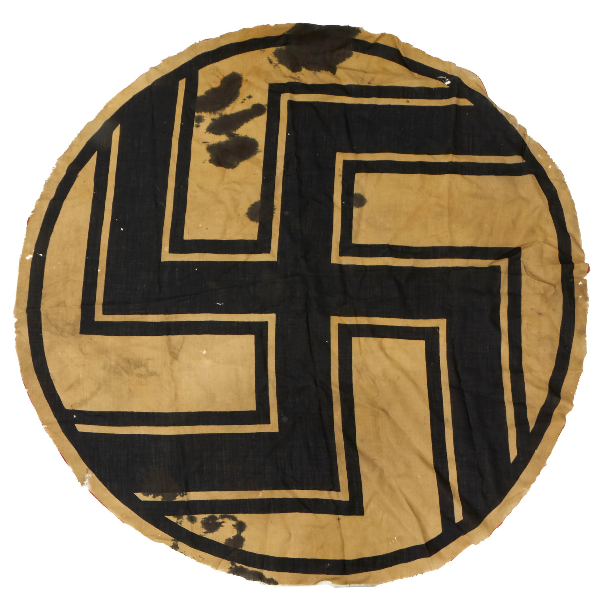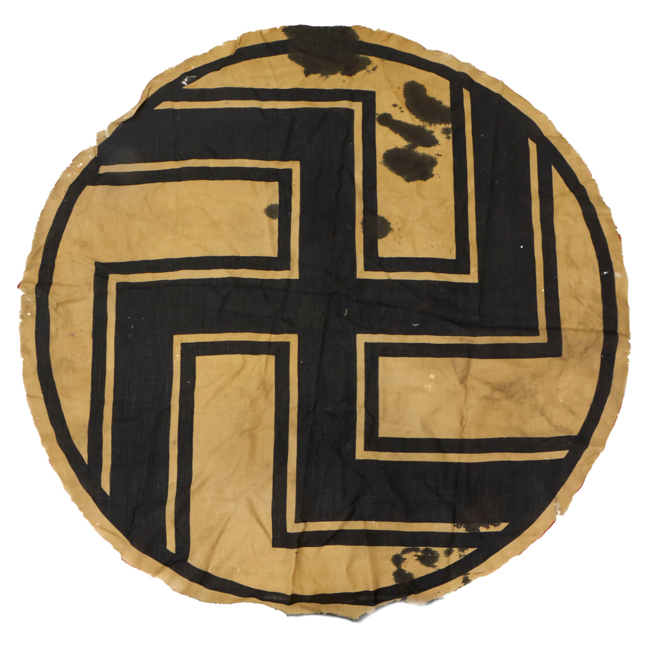 Original Item: Only One Available. This is a very nice "salty" service worn cutout central swas (hook cross) insignia from a WWII German NSDAP Reichsdienstflagge (State Service Flag). It must have been quite the large flag, as the insignia cutout alone measures 57" in diameter, constructed of what looks to be dyed wool. It was dyed directly onto the material, and has no seams or stitching.