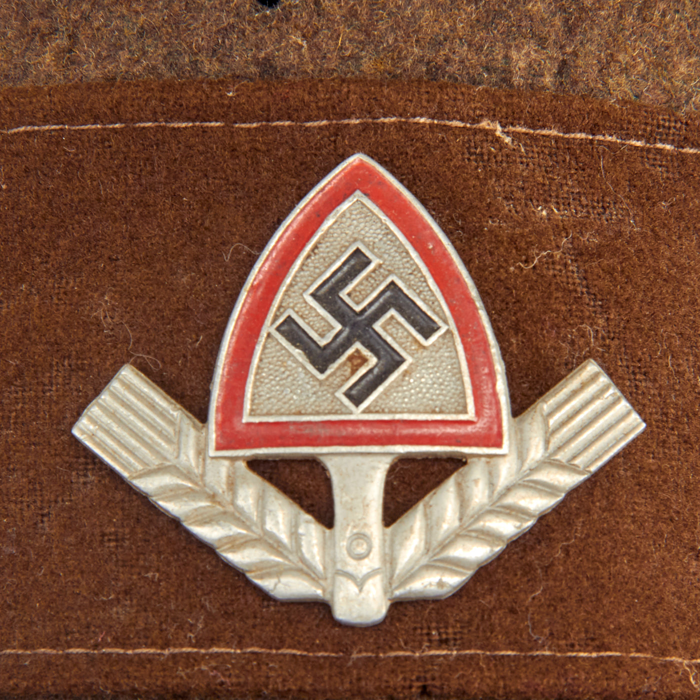 In April 1934 Hierl had developed a uniform, including the distinctive "Robin Hood" style service cap. The design of the cap was based on a cross between a traditional style peasant cap and the traditional hunters cap. Originally the caps were issued with rank distinction piping with black piping for the EM/NCO ranks of Arbeitsmann to Truppführer, silver piping for company and field grade Officer’s ranks of Obertruppführer to Oberstarbeitsführer and gold piping for General Officer’s ranks of Generalarbeitsführer to Reichsarbeitsführer. In 1940 the use of the black piping for the EM/NCO ranks was discontinued but the silver and gold Officer’s piping remained in use until the end of the war.