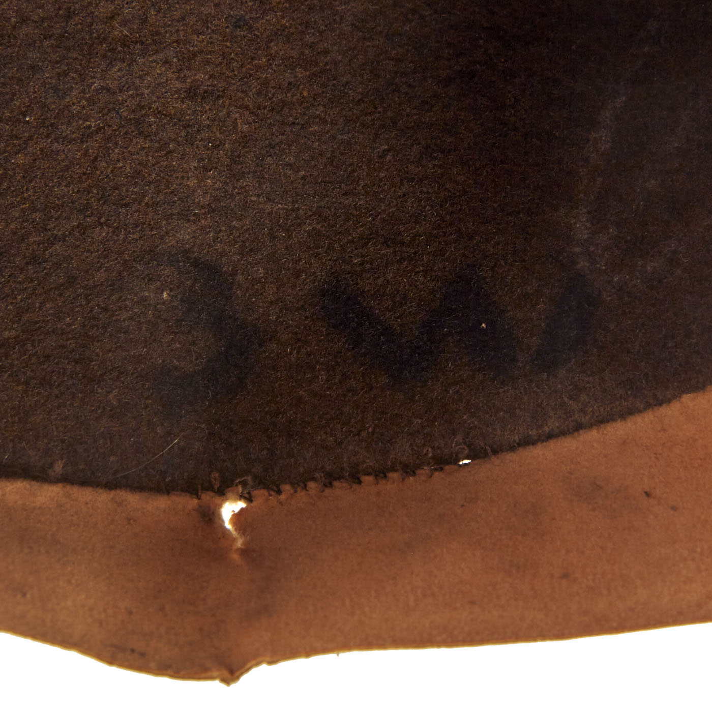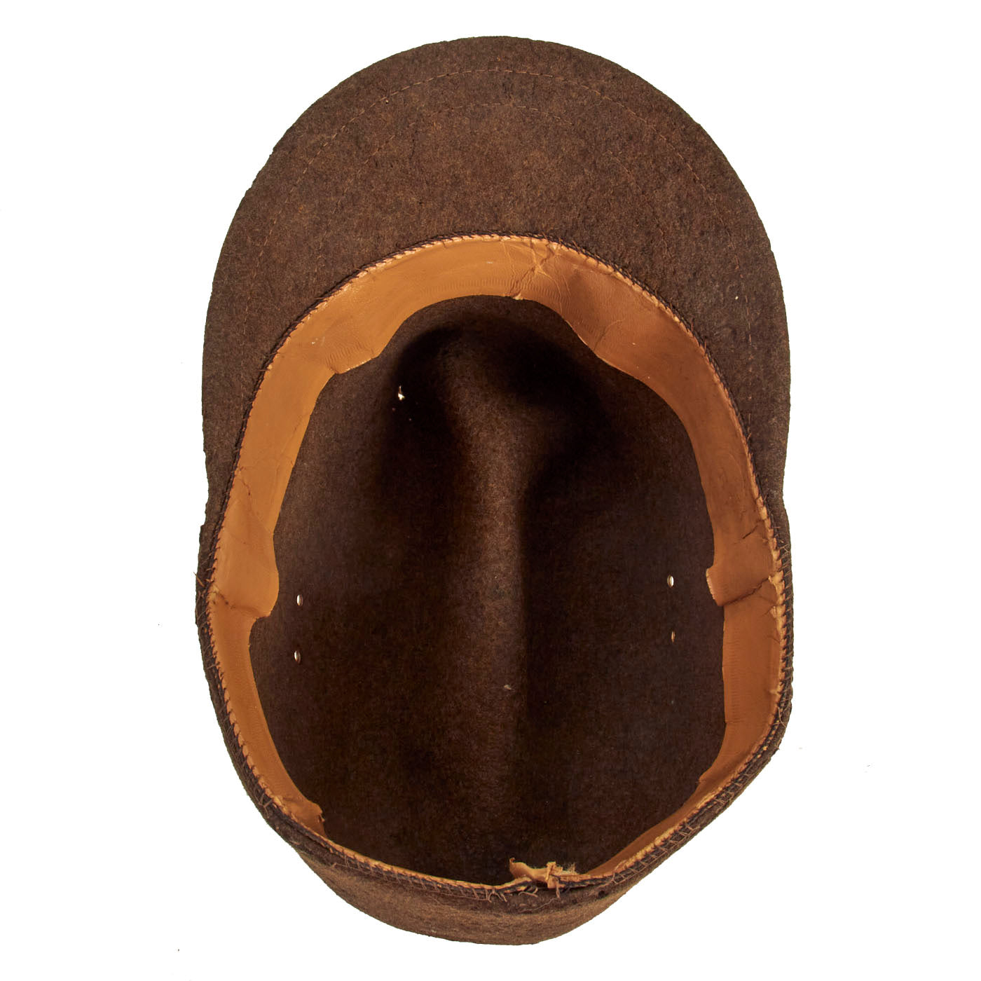 This cap definitely saw service during the war, resulting in wear to the exterior. There has also been moth damage to the felt body, particularly on the right side of the cap. The interior faired a bit better, but the sweatband is now dried out and delicate. SOme of the stitching on the bottom is also a bit worn.