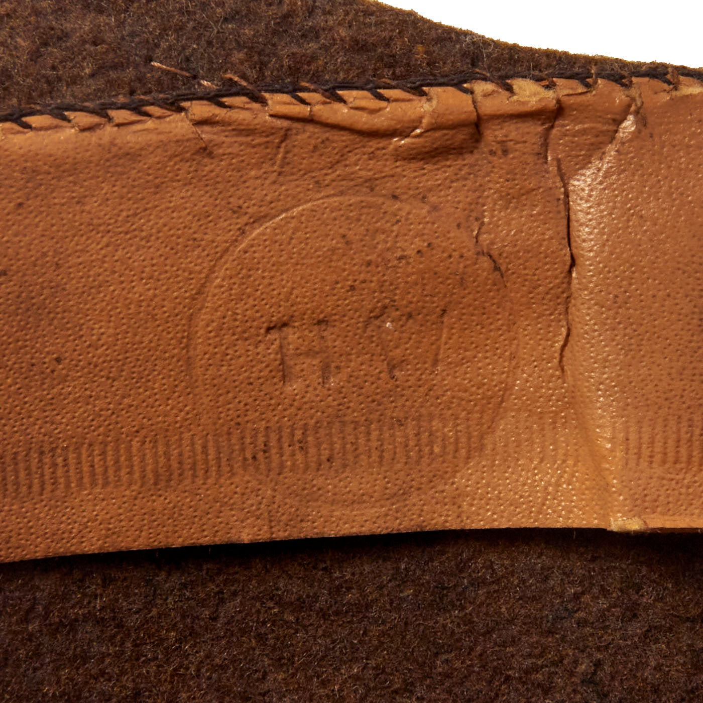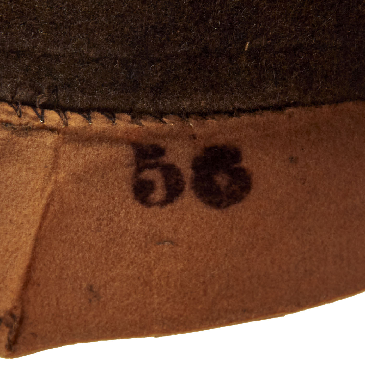 The interior of the cap has a faux leather sweatband, most likely made with pressed paper, which has an embossed H W in a Circle marking, which we cannot identify. We checked under the sweatband, and there are some written markings, but no maker mark, and a size of 56 stamped.