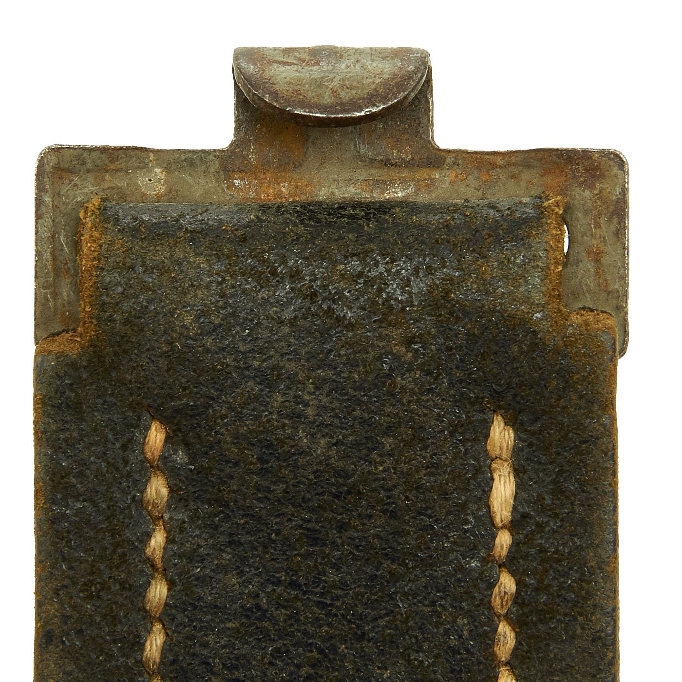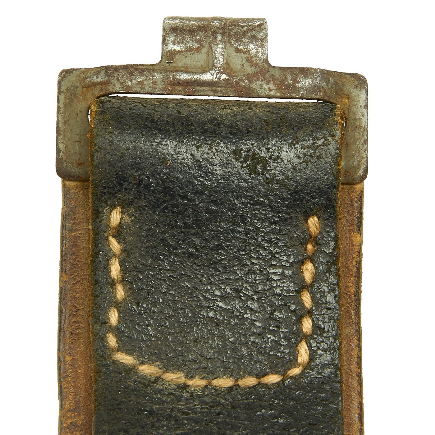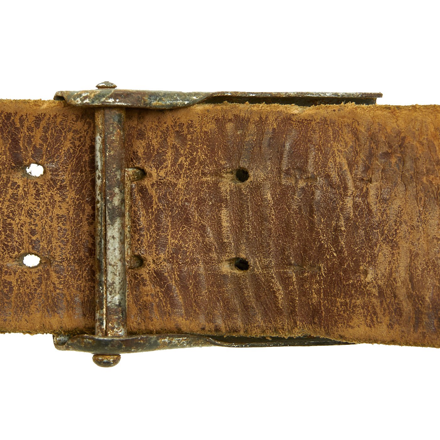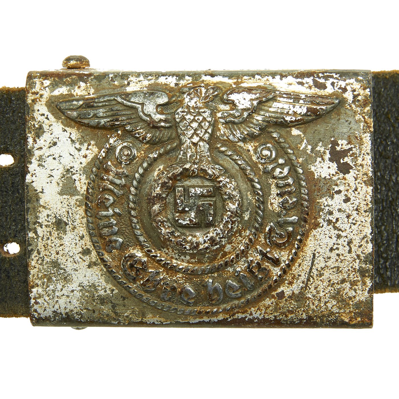 Original Item: Only One Available. This is a very nice "Service Worn" WWII German Schutzstaffel (SS) EM/NCO's Steel Painted Belt Buckle (Koppelschloß) with correct leather belt. It is embossed with a high relief, embossed, central motif pattern consisting of an SS style national eagle with out-stretched wings, clutching a wreath, encompassing a static swas. The swas and wreath are in turn encompassed by a circular, simulated, twisted rope border with the Gothic script motto, Meine Ehre heißt Treue!, (My Honor is Loyalty!). The original aluminum paint finish on the buckle is unfortunately quite worn on the the inside and outside of the buckle, and definitely looks to have seen extensive service.