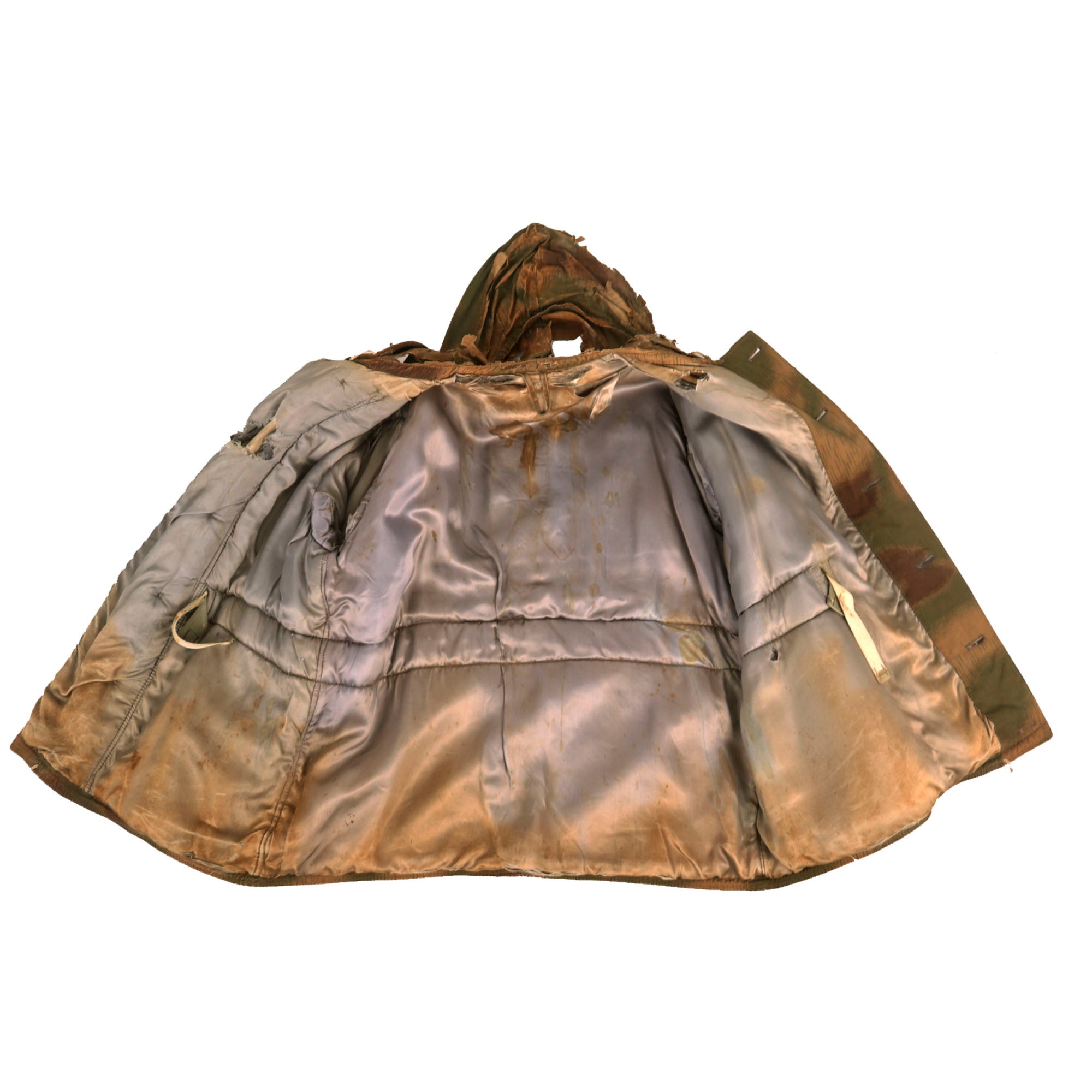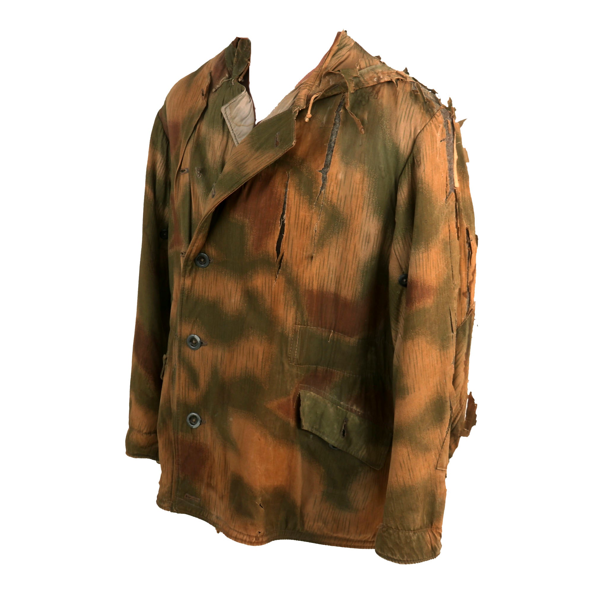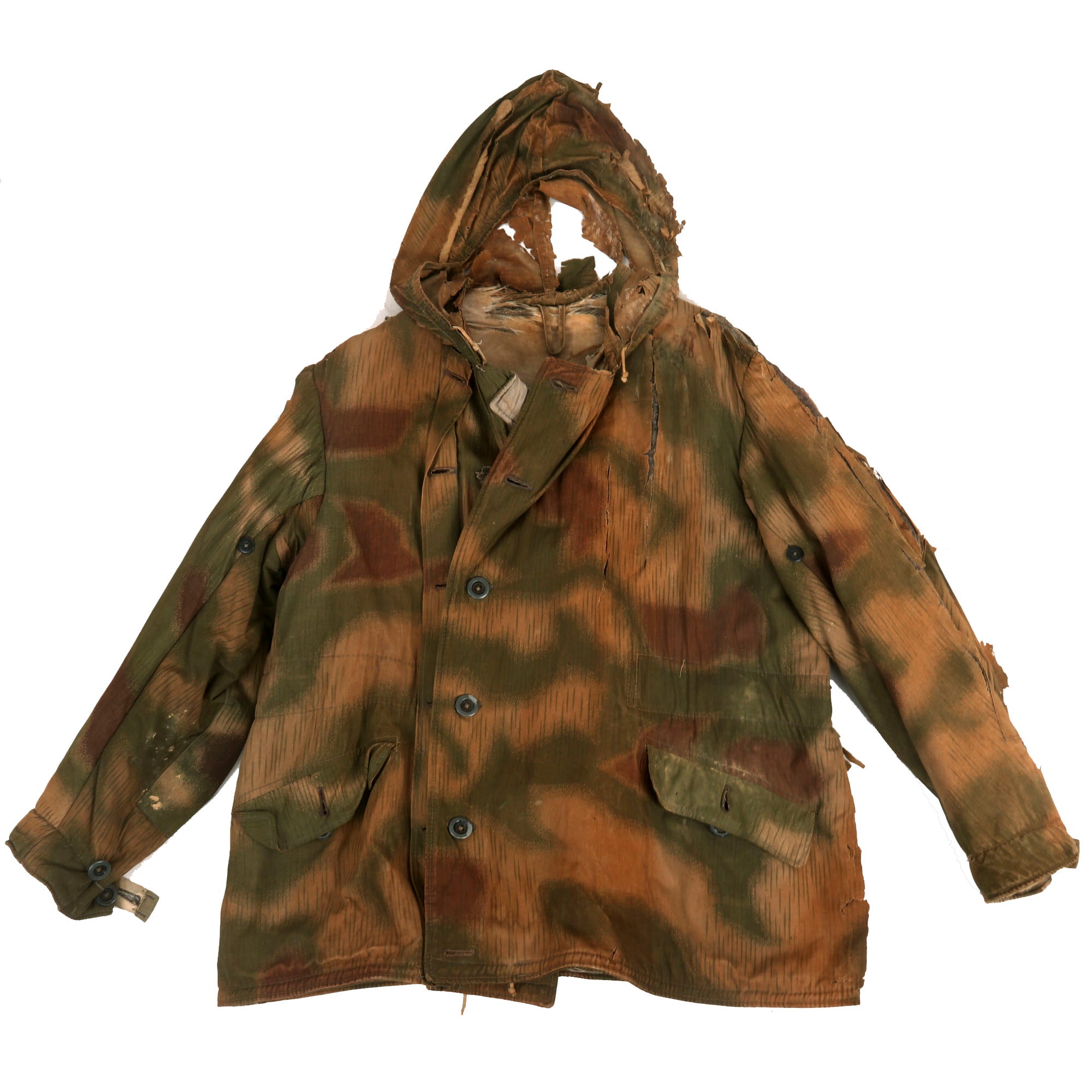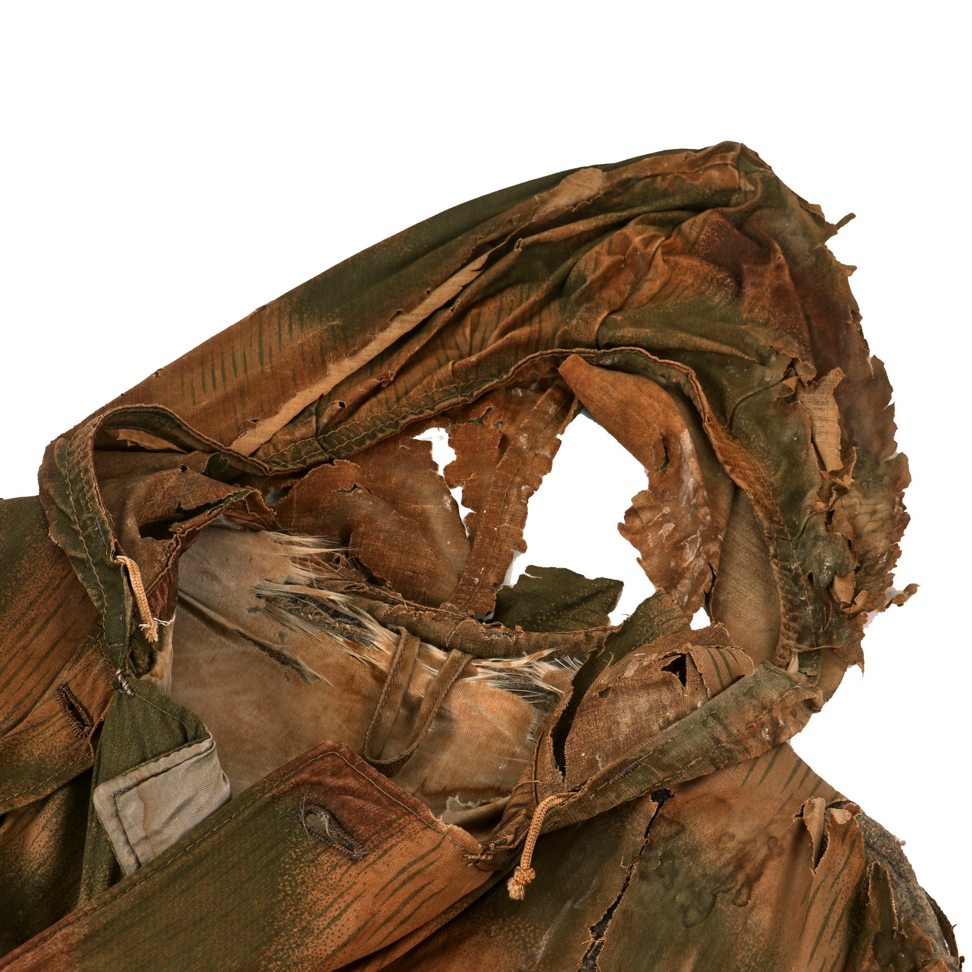 Original Item: Only One Available: This is a great "salty" service worn condition Swamp Pattern Camouflage parka used by German soldiers during World War Two, complete with the very hard to find matching pants! This example definitely shows quite a bit of deterioration to the fabric, especially around the hood of the parka, which is literally falling apart. It shows similar deterioration on the left sleeve, and also shows various other types of damage from service and possibly storage. The Sumpftarnmuster (Swamp or Tan Water Camouflage Pattern) model parkas appeared in the winter of 1943 and were widely issued throughout the German Army and some specialty units.