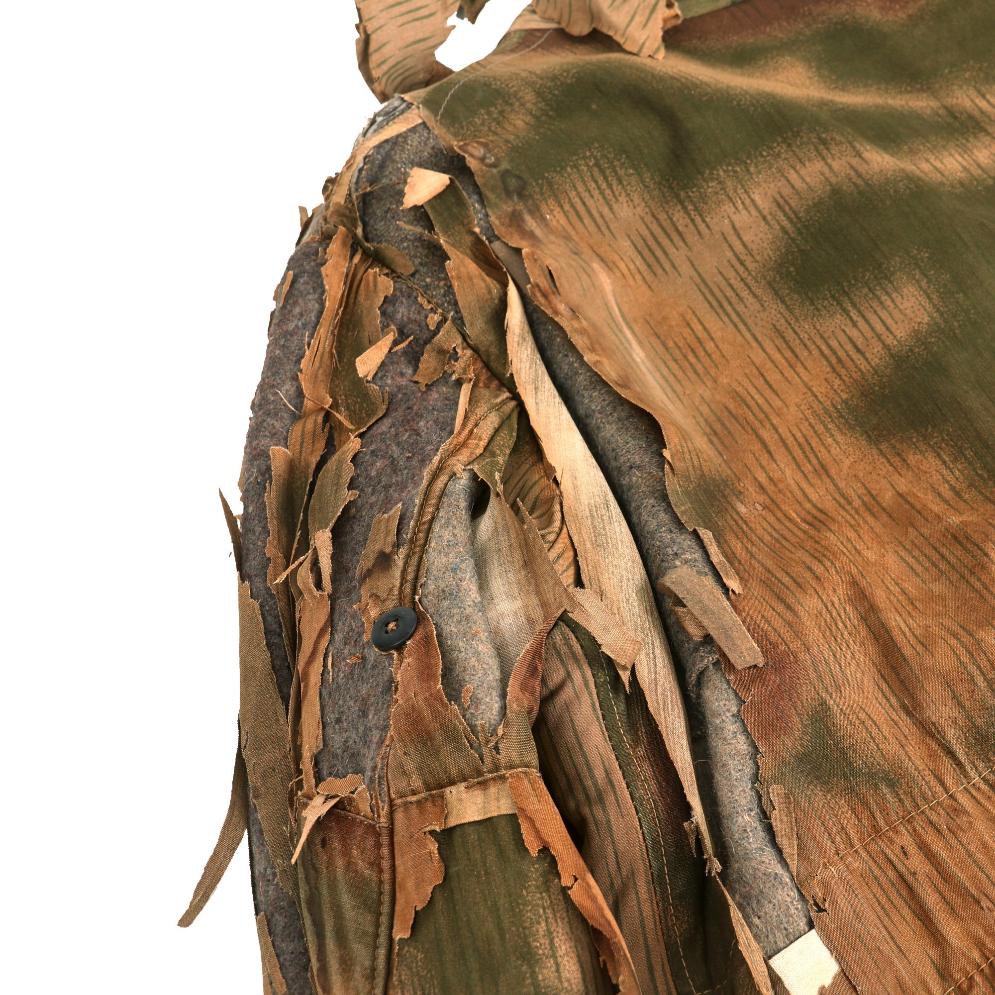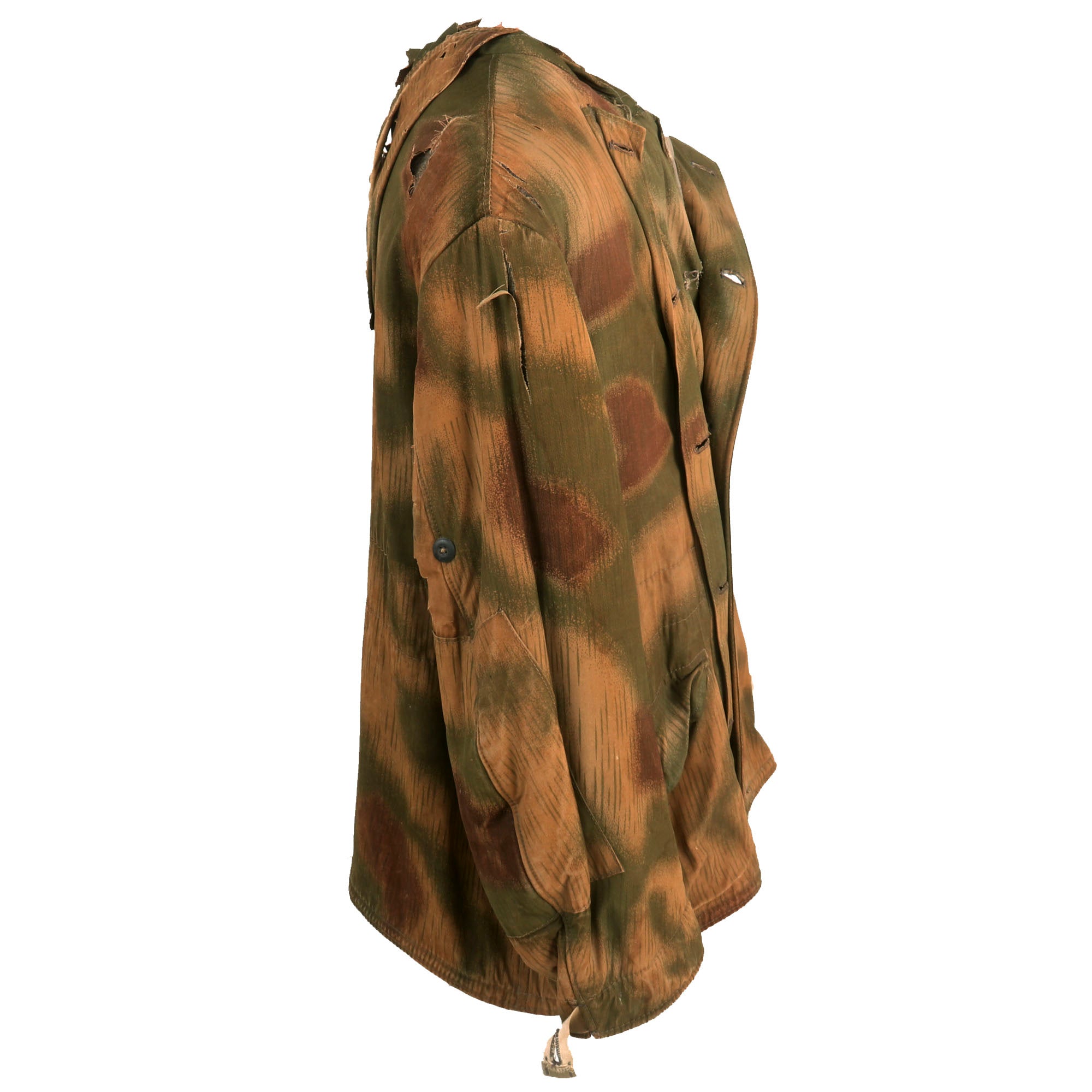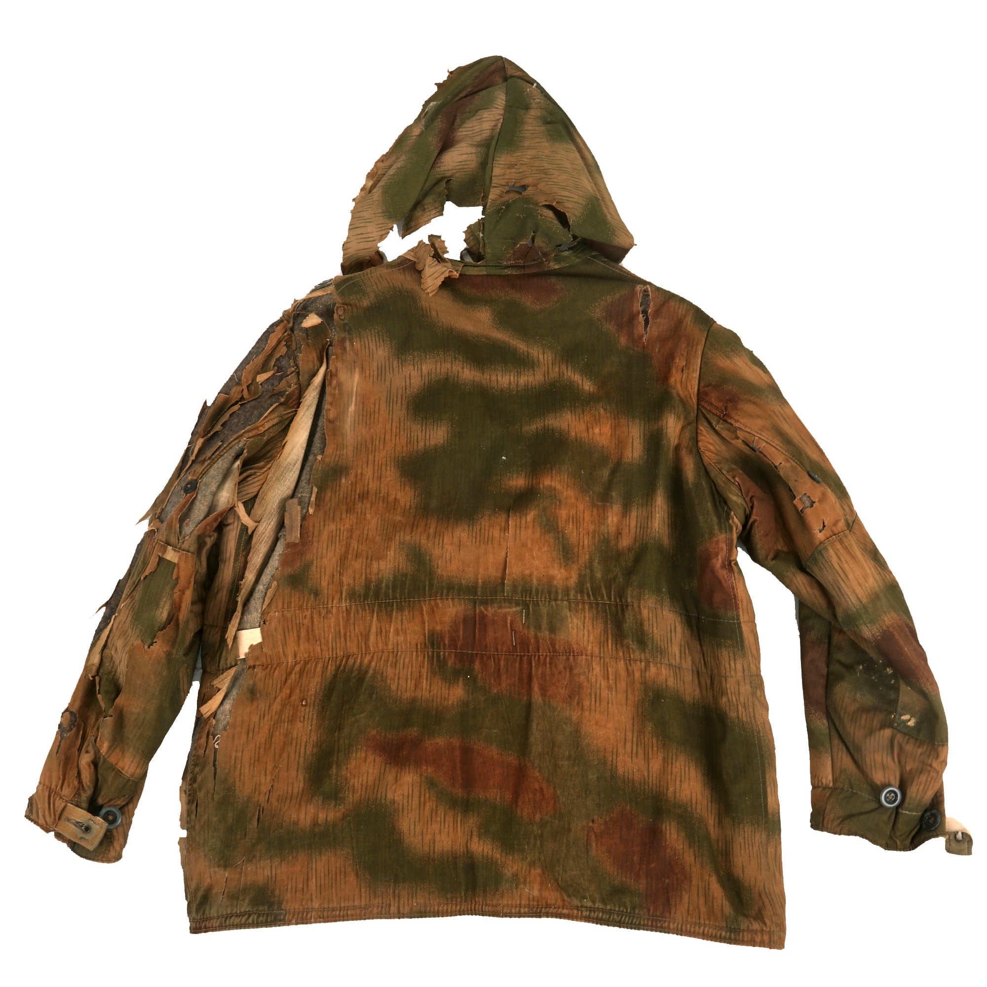 Original Item: Only One Available: This is a great "salty" service worn condition Swamp Pattern Camouflage parka used by German soldiers during World War Two, complete with the very hard to find matching pants! This example definitely shows quite a bit of deterioration to the fabric, especially around the hood of the parka, which is literally falling apart. It shows similar deterioration on the left sleeve, and also shows various other types of damage from service and possibly storage. The Sumpftarnmuster (Swamp or Tan Water Camouflage Pattern) model parkas appeared in the winter of 1943 and were widely issued throughout the German Army and some specialty units.