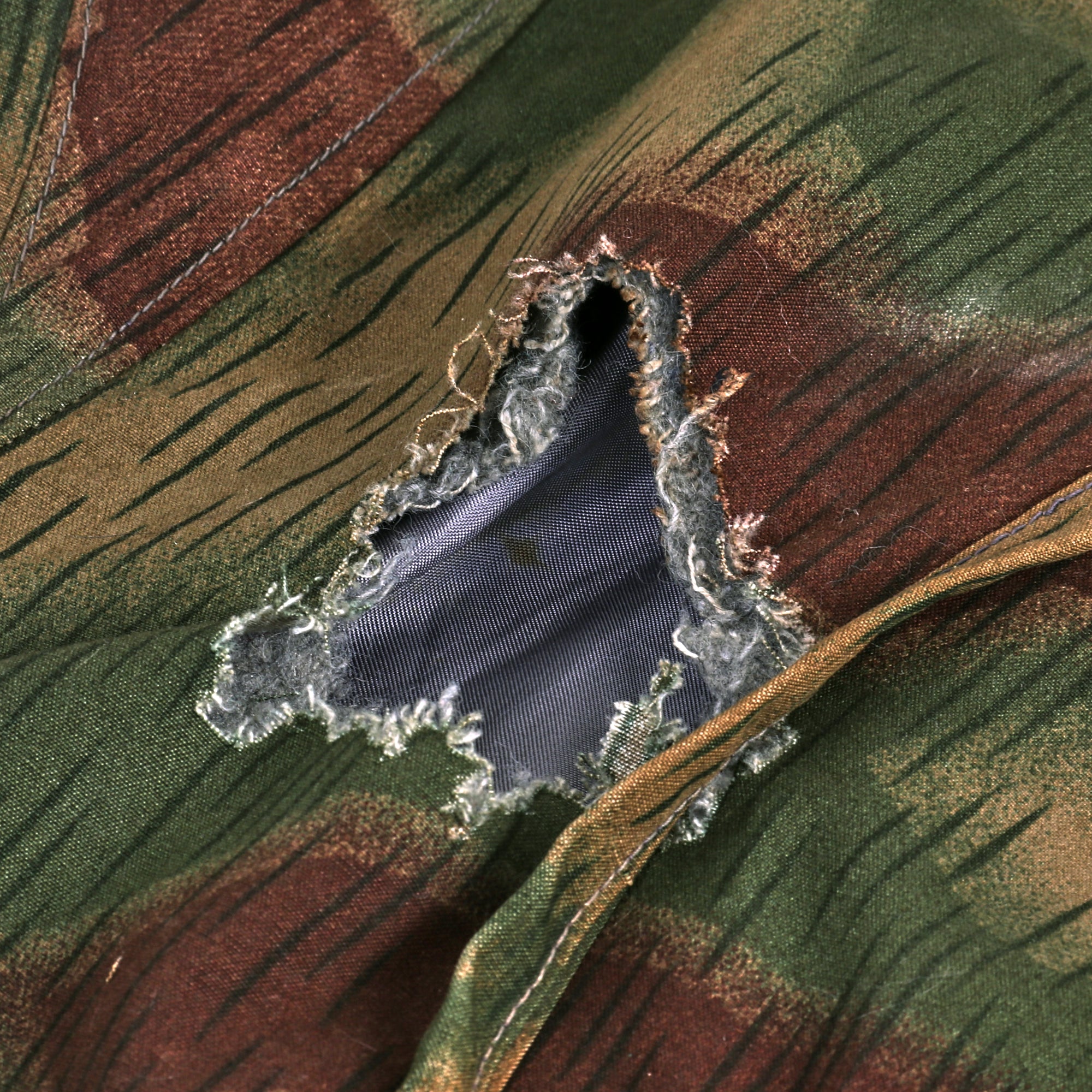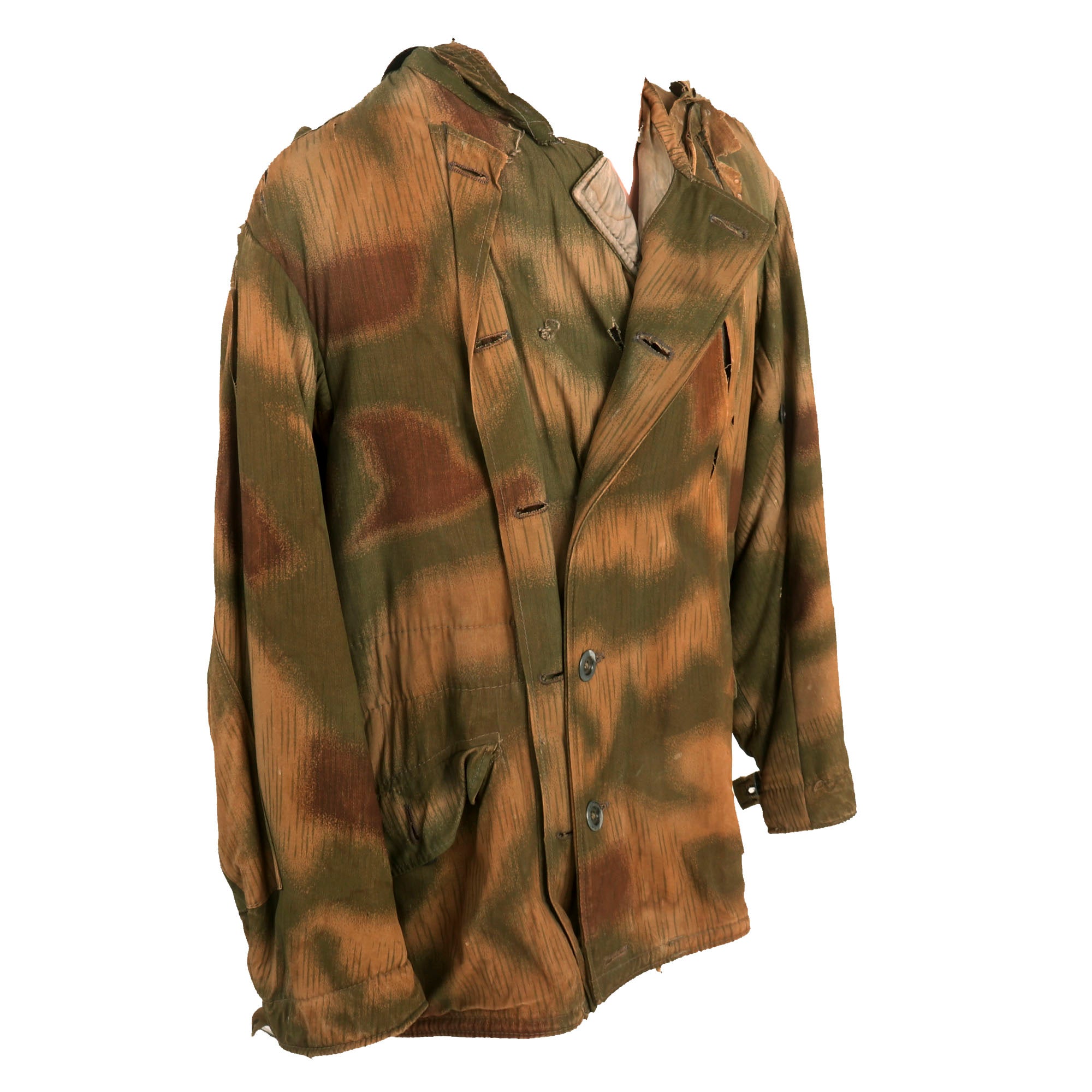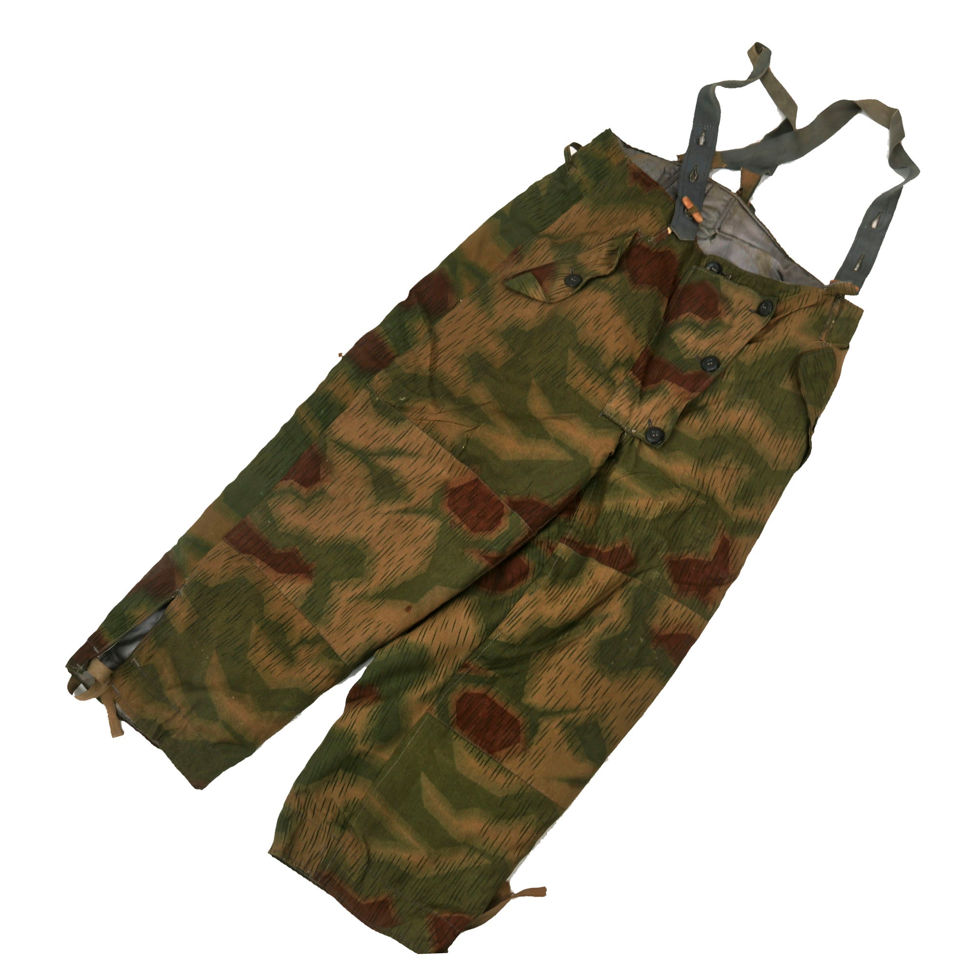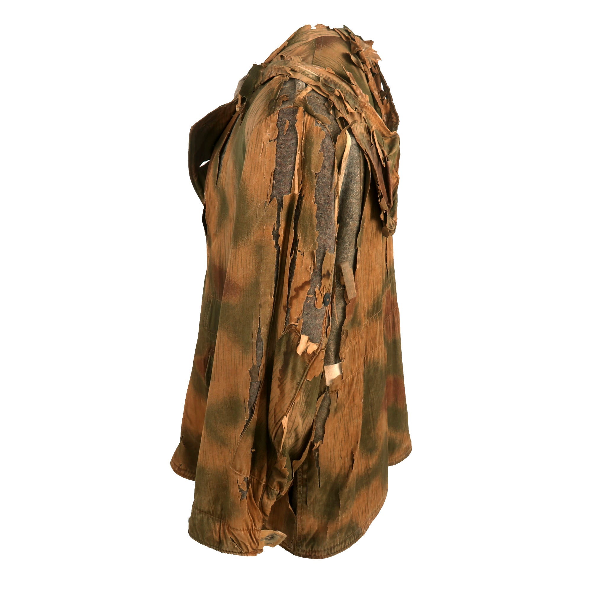 Original Item: Only One Available: This is a great "salty" service worn condition Swamp Pattern Camouflage parka used by German soldiers during World War Two, complete with the very hard to find matching pants! This example definitely shows quite a bit of deterioration to the fabric, especially around the hood of the parka, which is literally falling apart. It shows similar deterioration on the left sleeve, and also shows various other types of damage from service and possibly storage. The Sumpftarnmuster (Swamp or Tan Water Camouflage Pattern) model parkas appeared in the winter of 1943 and were widely issued throughout the German Army and some specialty units.