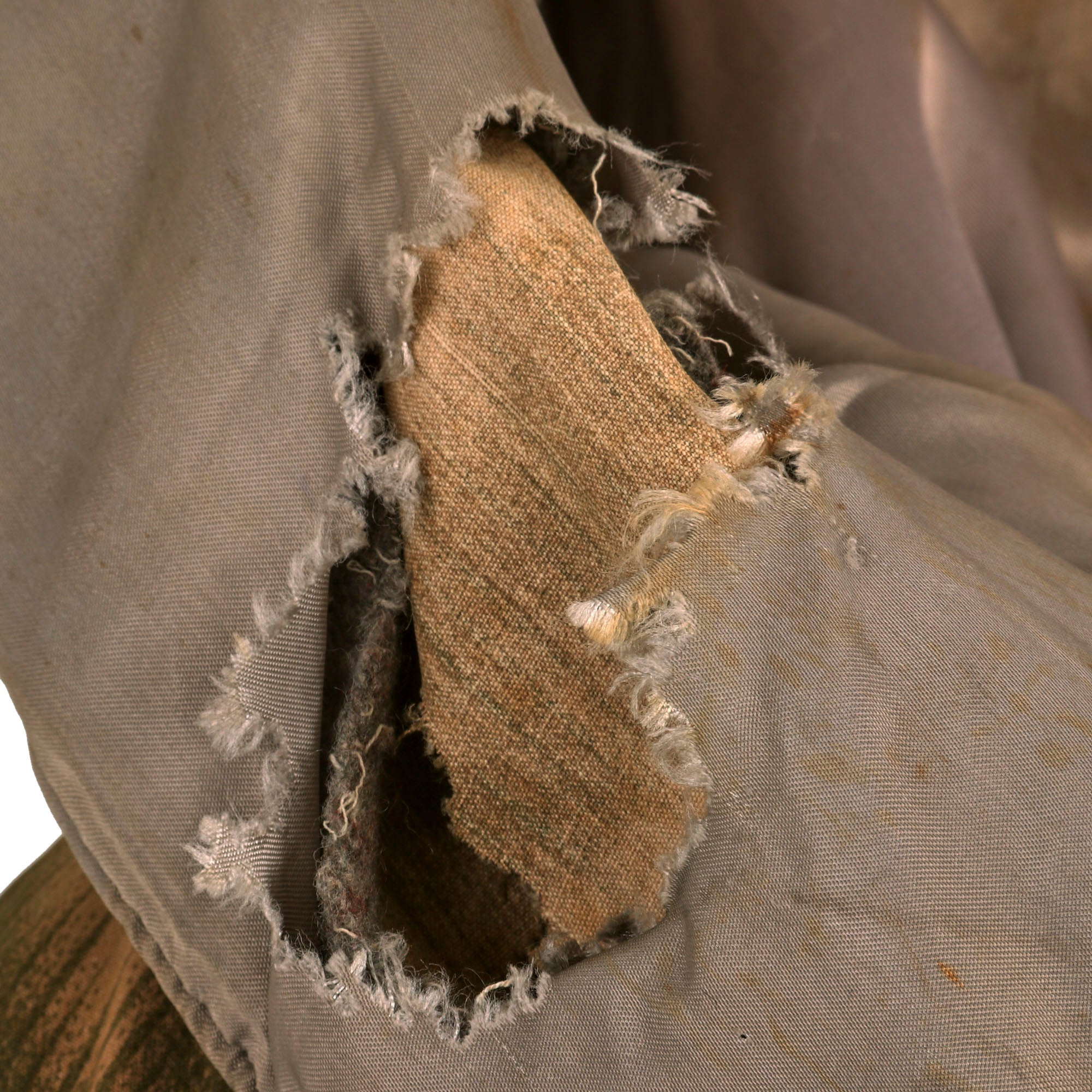 The exterior camouflage side has definitely seen serious wear and exposure to the elements, and as previously mentioned the hood is literally falling apart. The exterior fabric on the left arm is also quite deteriorated, showing the internal insulation layer clearly in many areas. The camouflage fabric shows much staining in those areas, and is stiff and delicate. There is similar deterioration on the body of the parka under the left arm, so we can imagine that the soldier who whore this must have seen a lot of time out in the rain or other types of inclement weather. The large amount of staining on the interior lining also confirms this. There are no markings that we can see, but that is not unusual, even on examples in excellent condition.