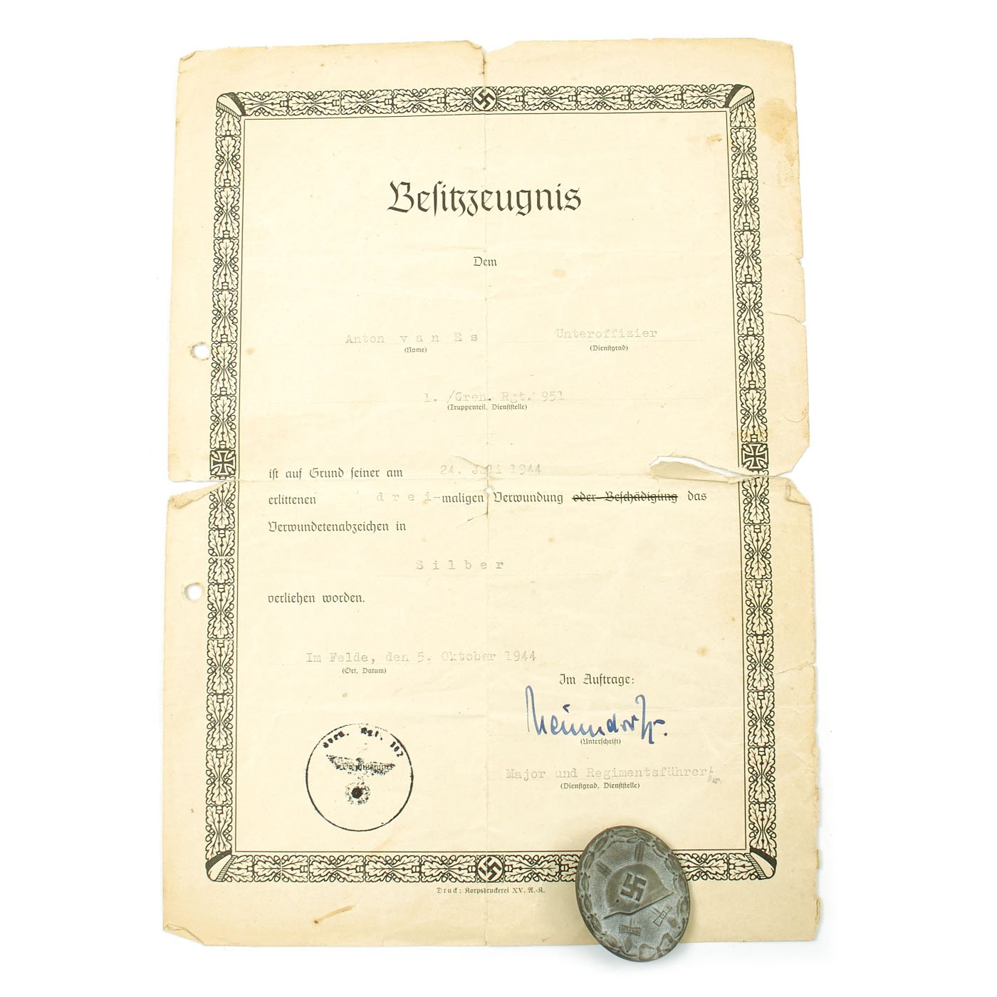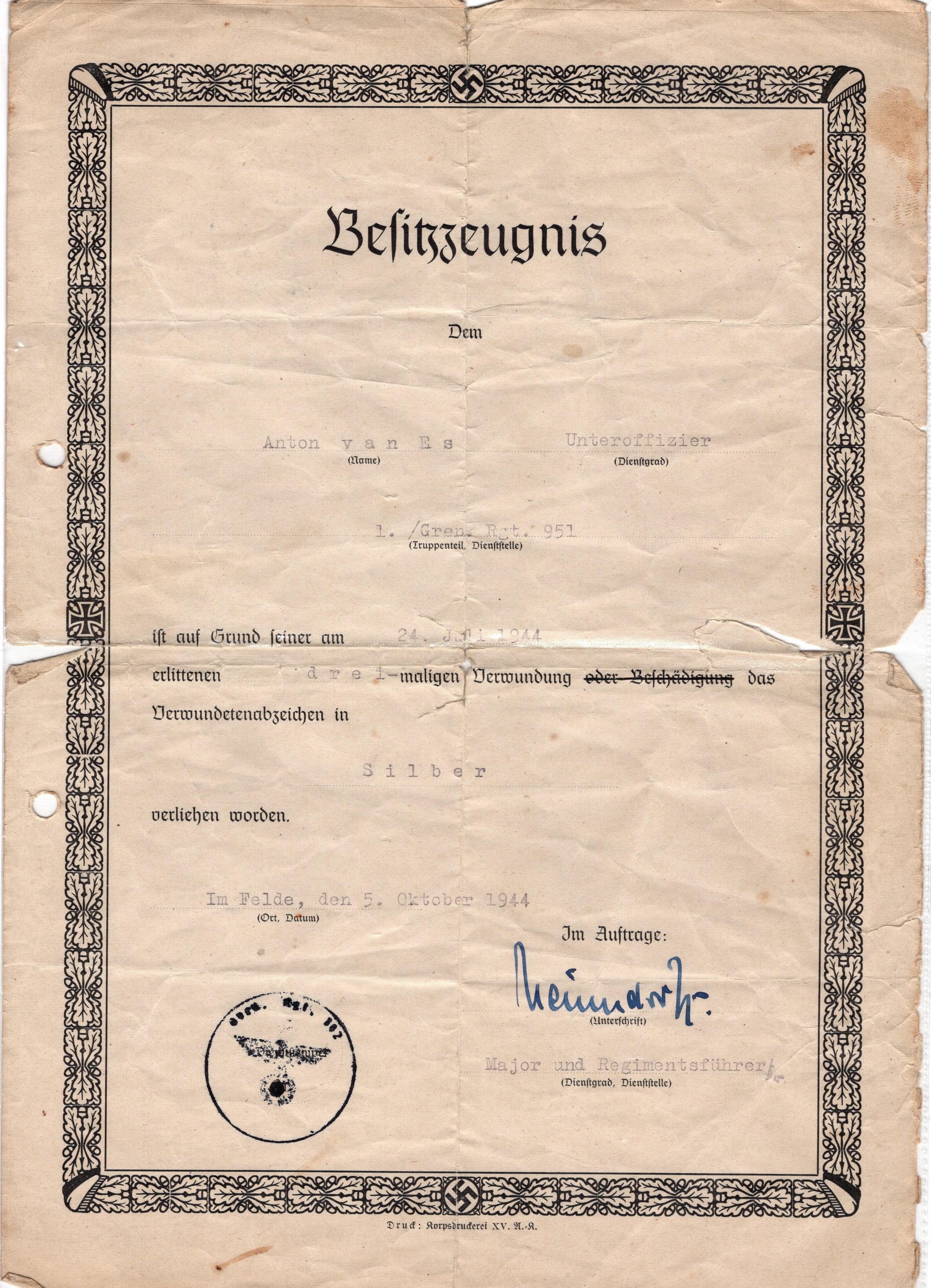 The last document indicates that that Unteroffizier Anton van Es. was awarded the Wound Badge in Silver for injuries received on 24. Juli 1944. At this point he was now in the 1. / Gren. Regt. 951 (951 Grenadier Regiment). The award was given in the field, and the document bears the authorizing signature of a Major and Regiment Leader, and was presented on 5. Oktober 1944..