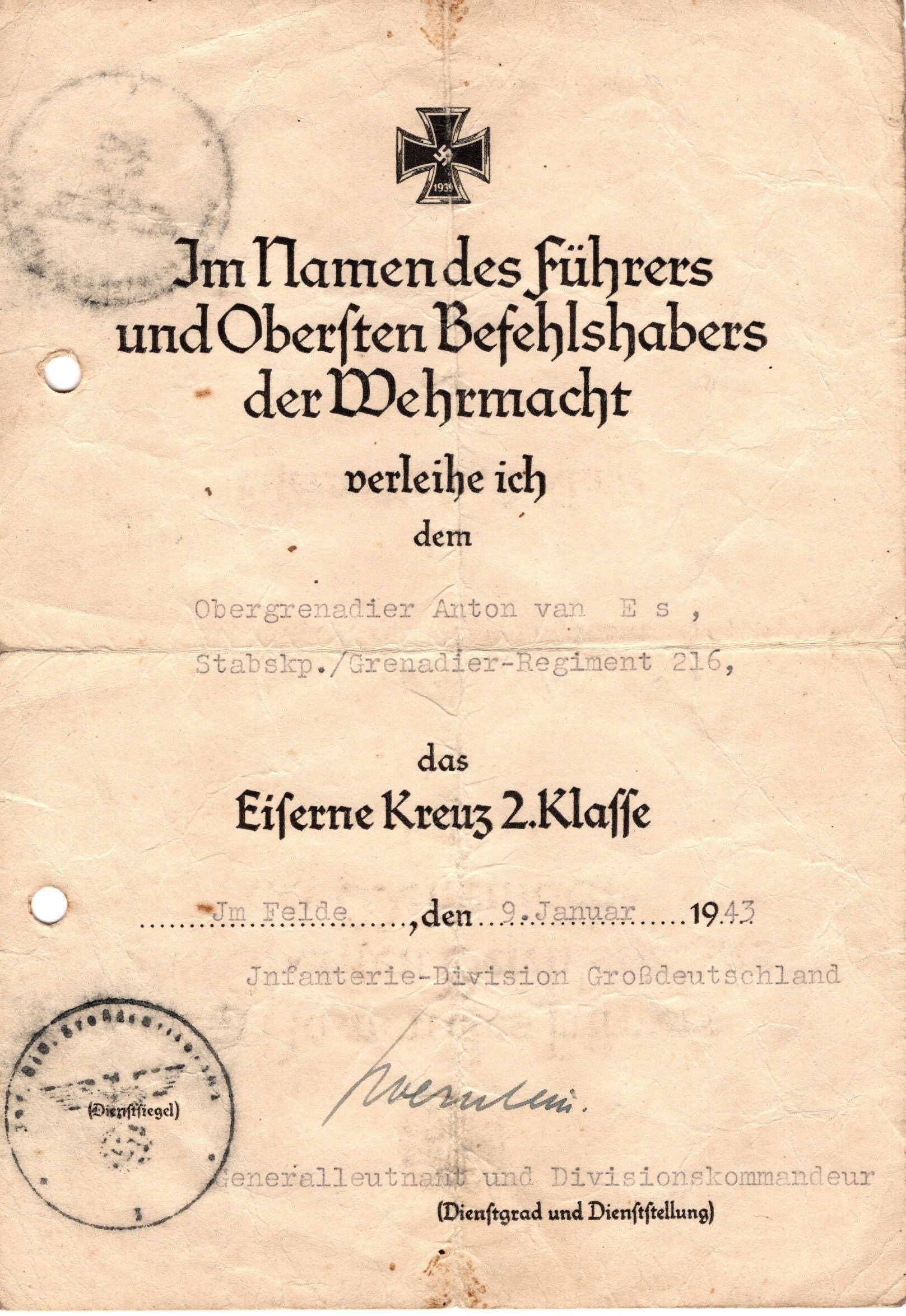 The third document is awarded to Obergrenadier Anton van Es, who is now listed as being a member of the Stabskp./Grenadier-Regiment 216. This was awarded in the field by the Generalleutnant and Division Commander of the Infanterie-Division Großdeutschland on 9. Januar 1943.