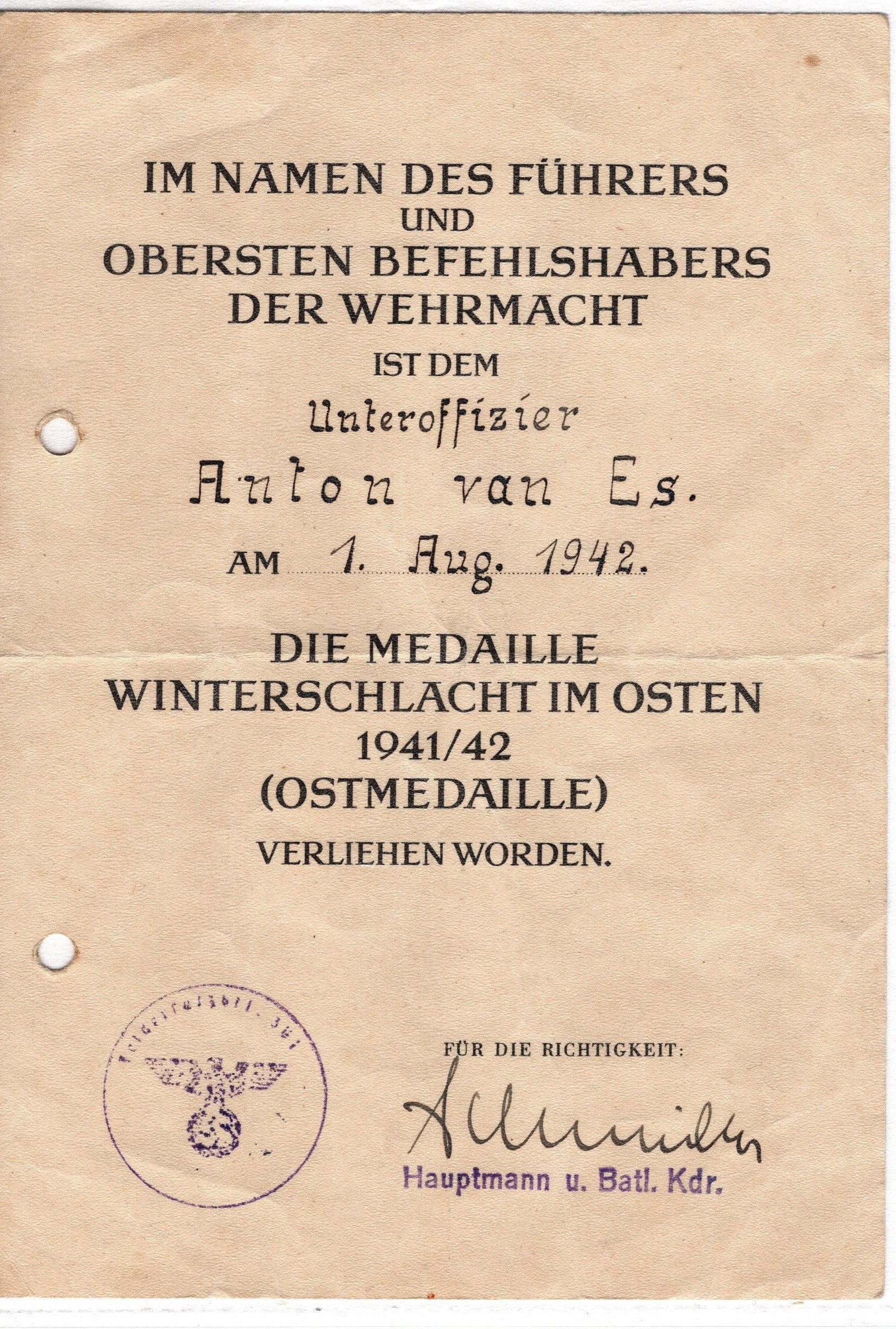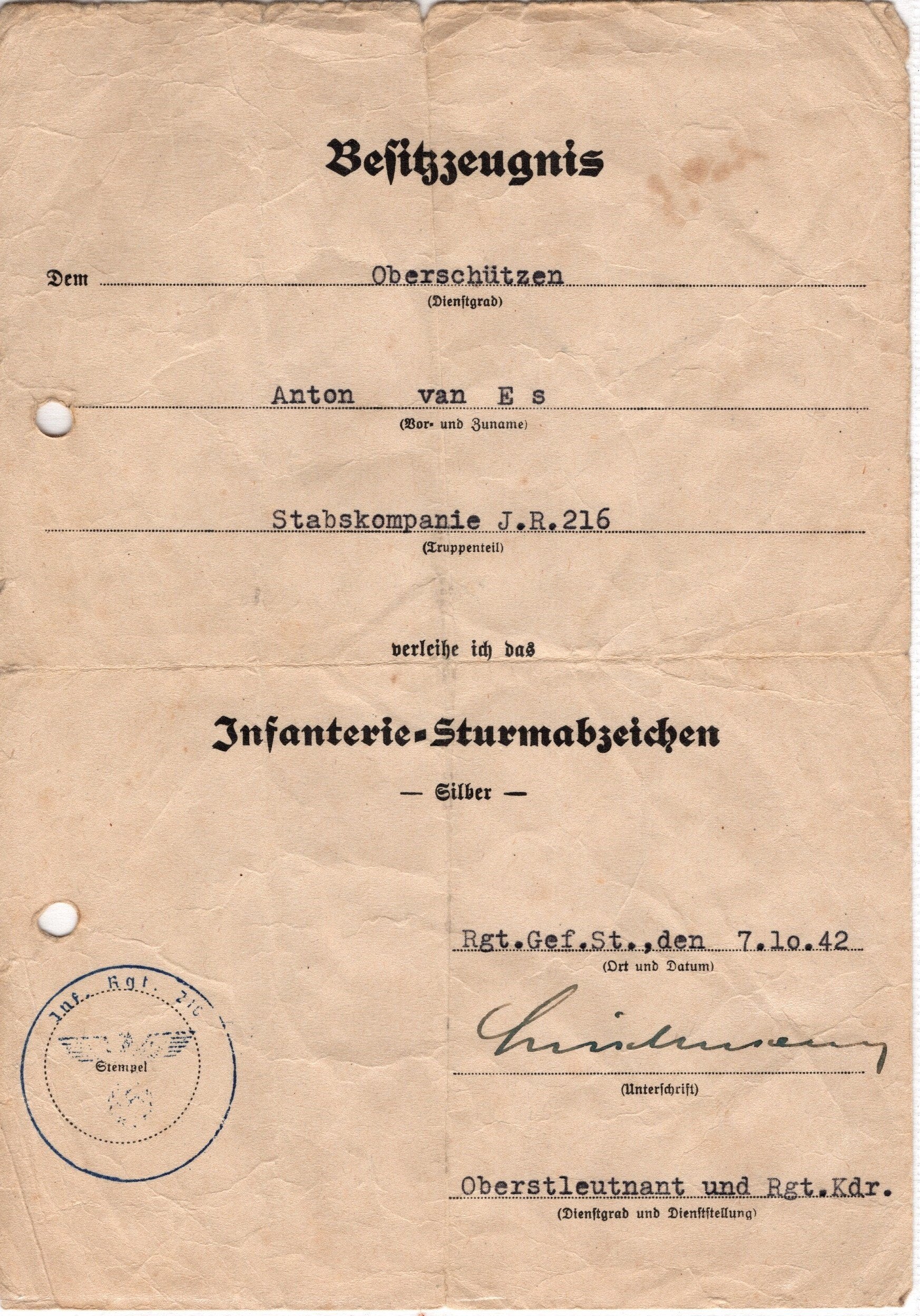 The first document indicates that Oberschützen Anton van Es of the Stabskompanie J.R.216 was awarded the Infantry Assault Badge in Silver on 7.10.44 (7 October 1942), and has the signature of an Oberstleutnant (Lt. Colonel) on the bottom.. The second indicates that now Unteroffizier Anton van Es was awarded the Eastern Front Medal on 1. Aug. 1942., and is signed by a Hauptmann (captain) and Battalion Commander. These two documents appear to show a decrease in rank, but sometimes awards that required a time in service were awarded later, or were named to their rank when they completed the requirements, not when they were awarded.