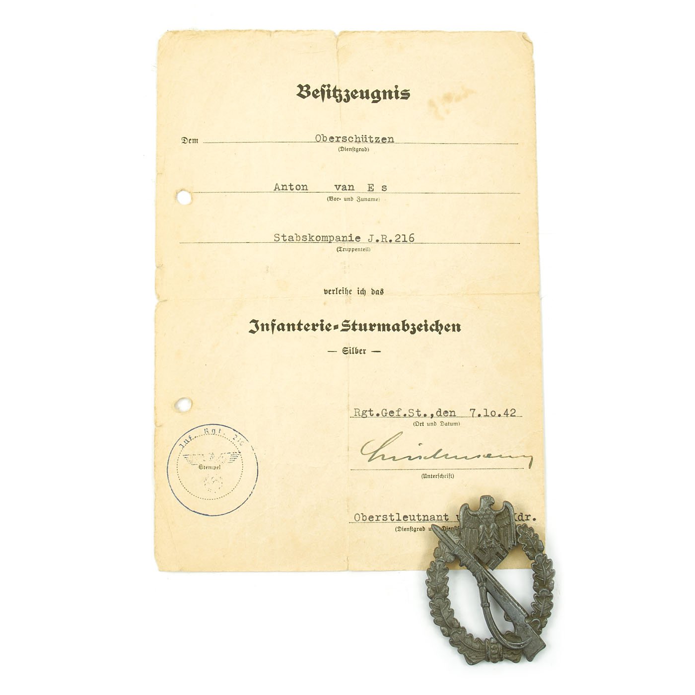 Original Items: One-of-a-kind grouping. This is a fantastic set, with four original German WWII combat awards, each with their original BESITTZZEUGNIS "possession/award" certificates. All were awarded to the same soldier, Anton van Es, who we believe was a Dutch volunteer, holding the rank of Oberschütze (Private), Obergrenadier, and finally Unteroffizier (Corporal). The award documents are dated 1942, 1943, and 1944, making this a great set showing the progression of a "Private" level soldier, who progressed to becoming an junior NCO. He was a member of the Stabskompanie J.R.216 in 1942, an Infantry Regiment which later became a Genadier Regiment, also as indicated by the award documents. He later moved to another regiment as the war approached its close.