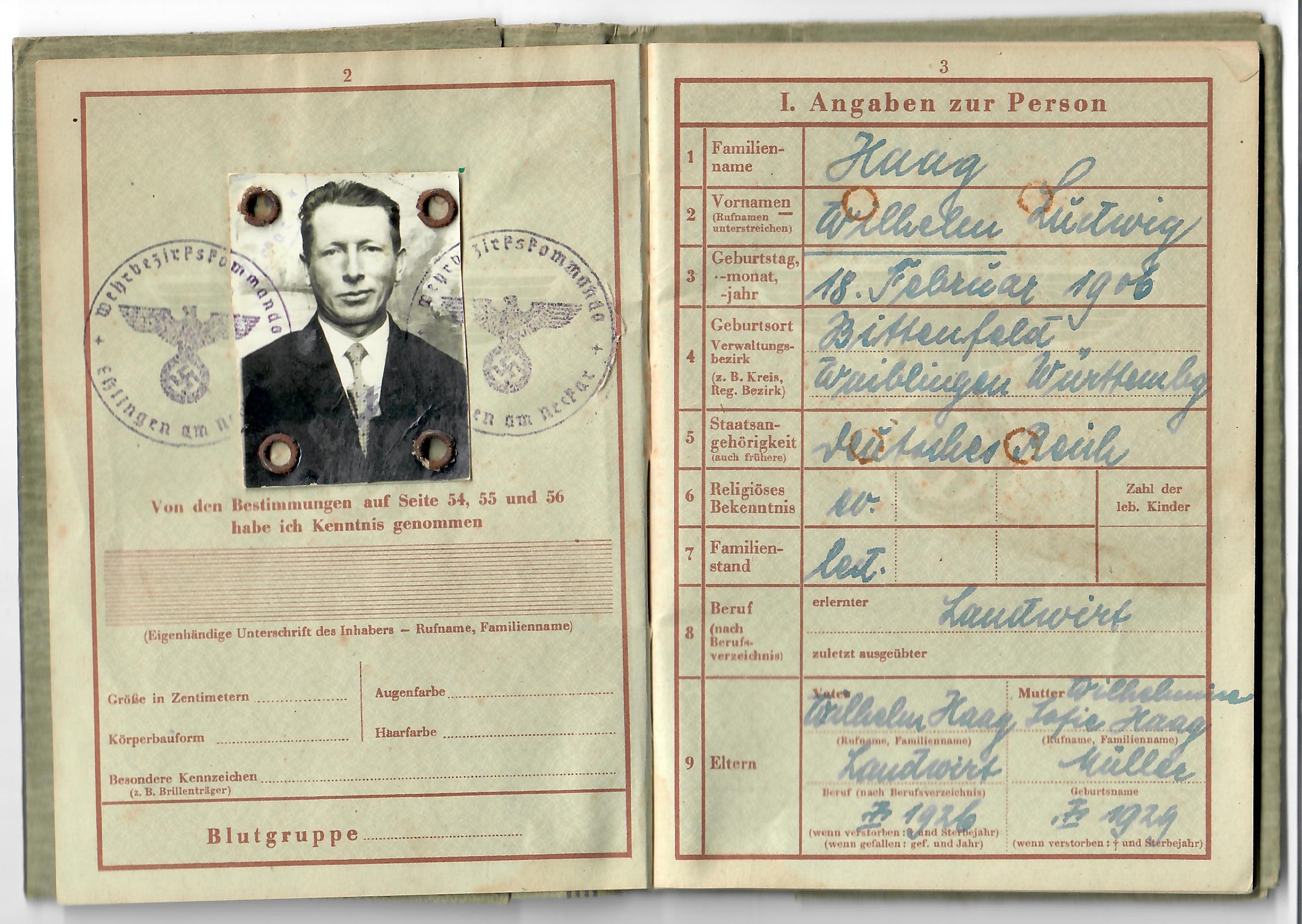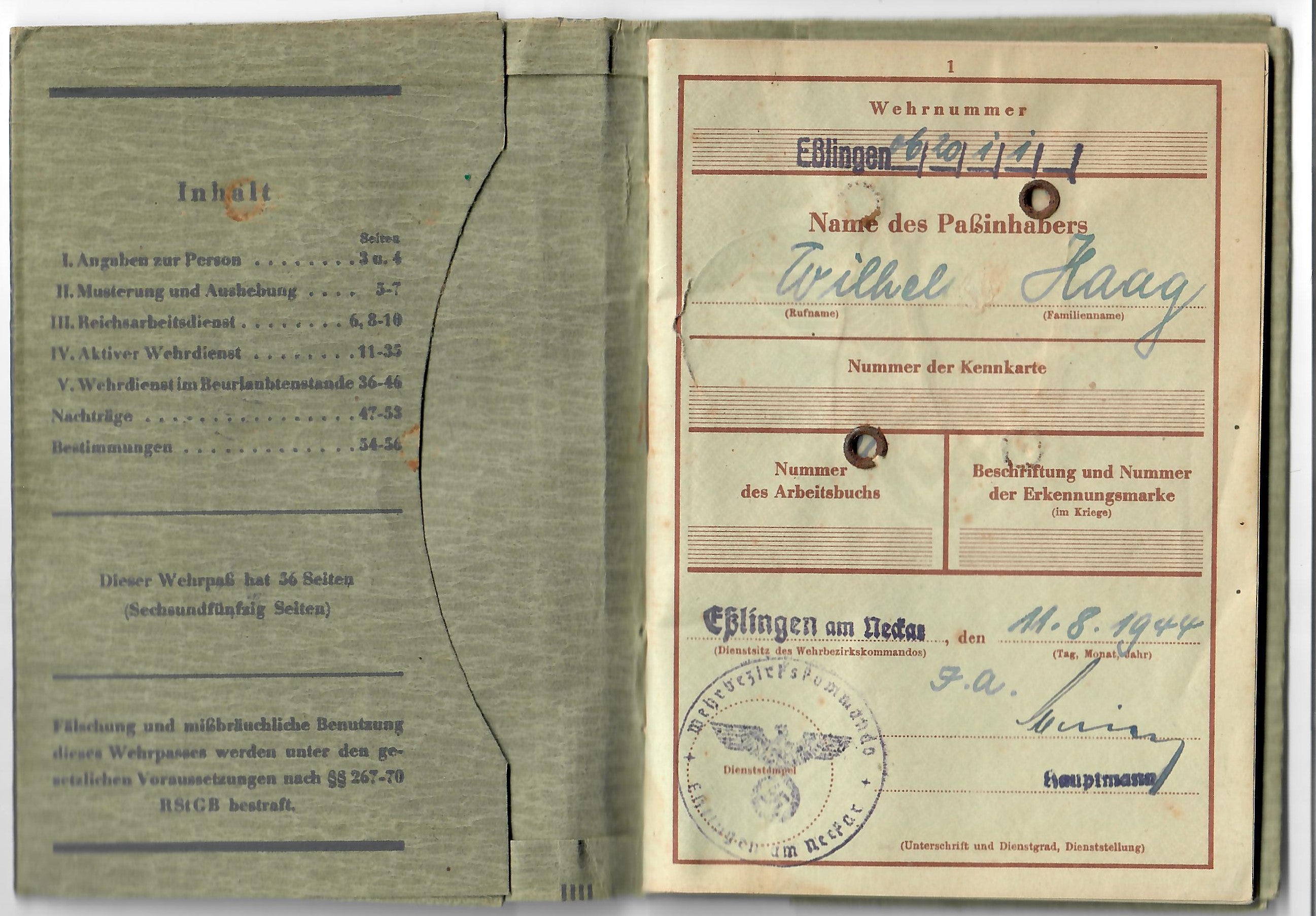 - One German WWII Wehrpaß Identification Book issued 11. 8. 1944 and named to what looks like Wilhelm Haag. These identification books were required beginning in 1935 with the beginning of conscription in NSDAP-ruled Germany, and all eligible males were required to get one. His date of birth is listed as 18. Februar 1906, so he was also quite a bit older than the usual recruit, and had to get this pass as the conscription was widened late in the war.
