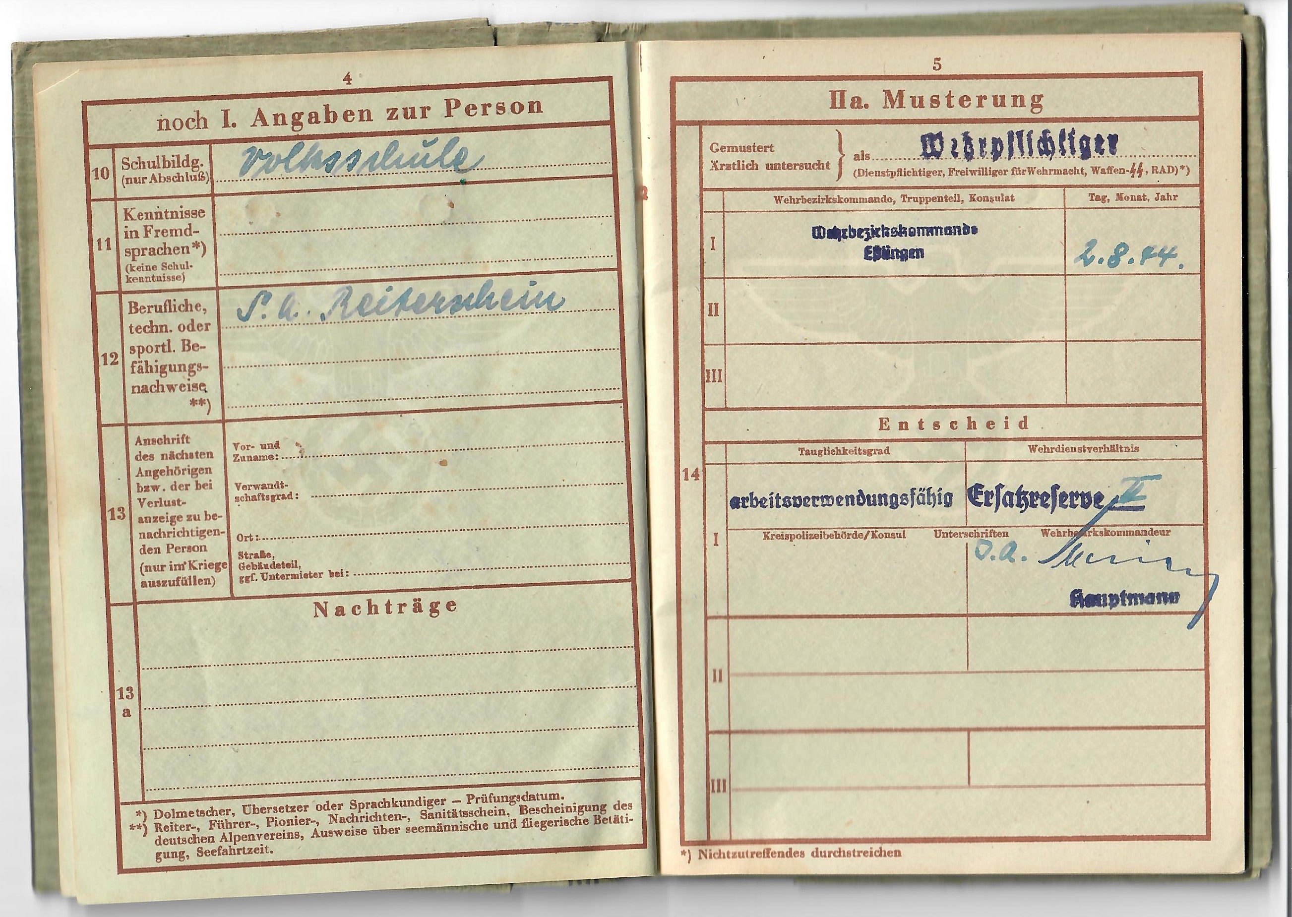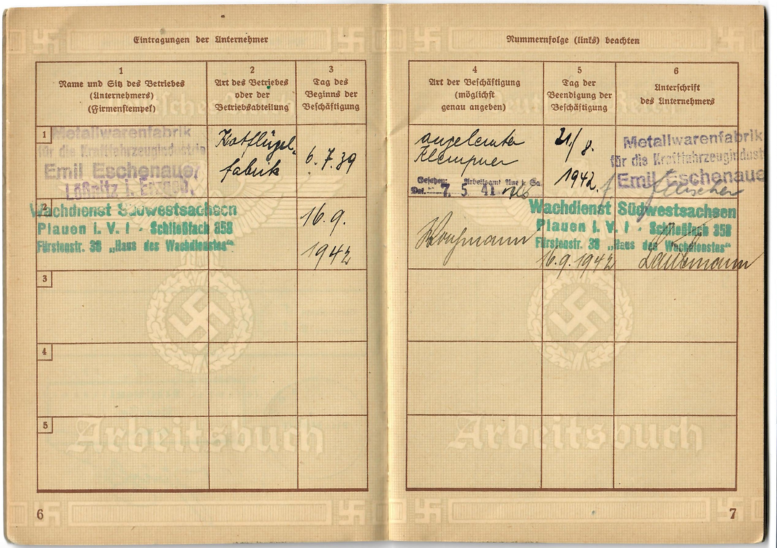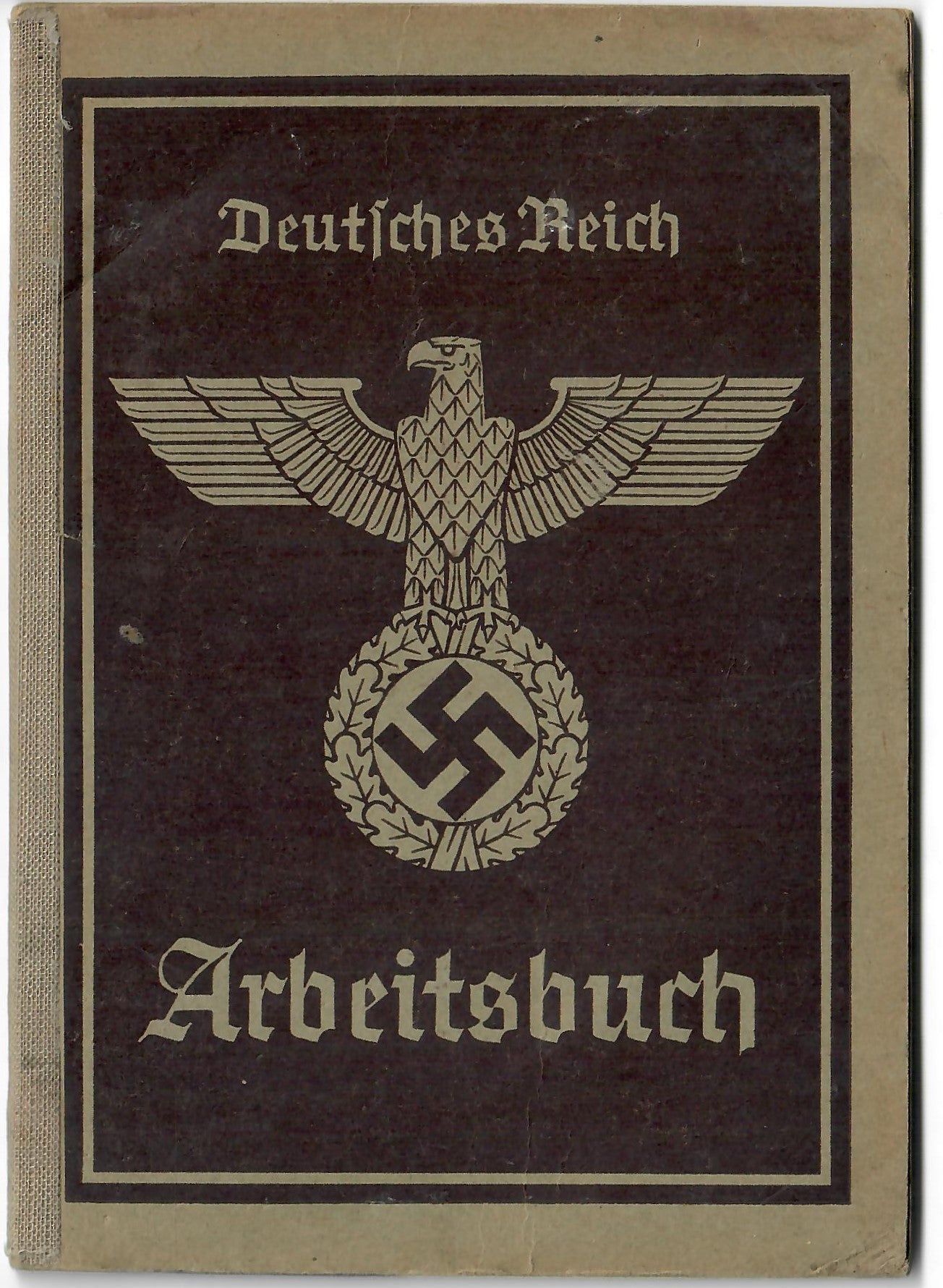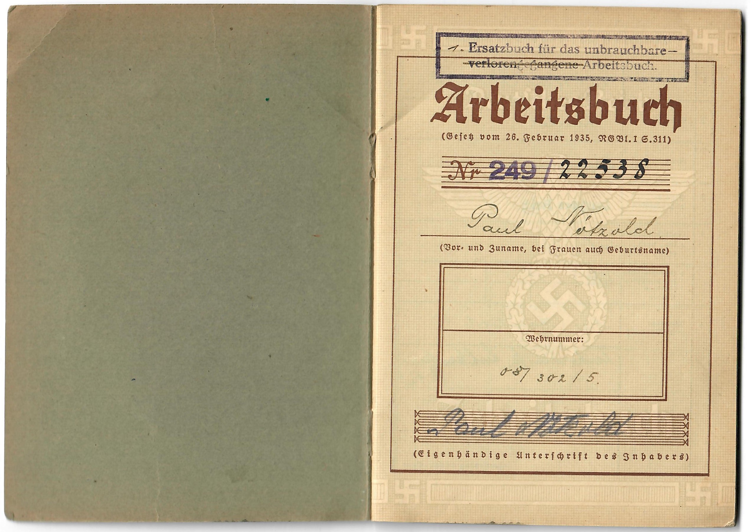 - One German WWII Deutsches Reich Arbeitsbuch (German National Workbook), named to what looks like Paul Vöfzald. These books grew out of a 1935 law requiring registration of work, and documentation of work history for German citizens-and only German citizens. Foreigners who worked in Germany carried an Arbeitsbuch fur Auslander which had a picture of the owner.