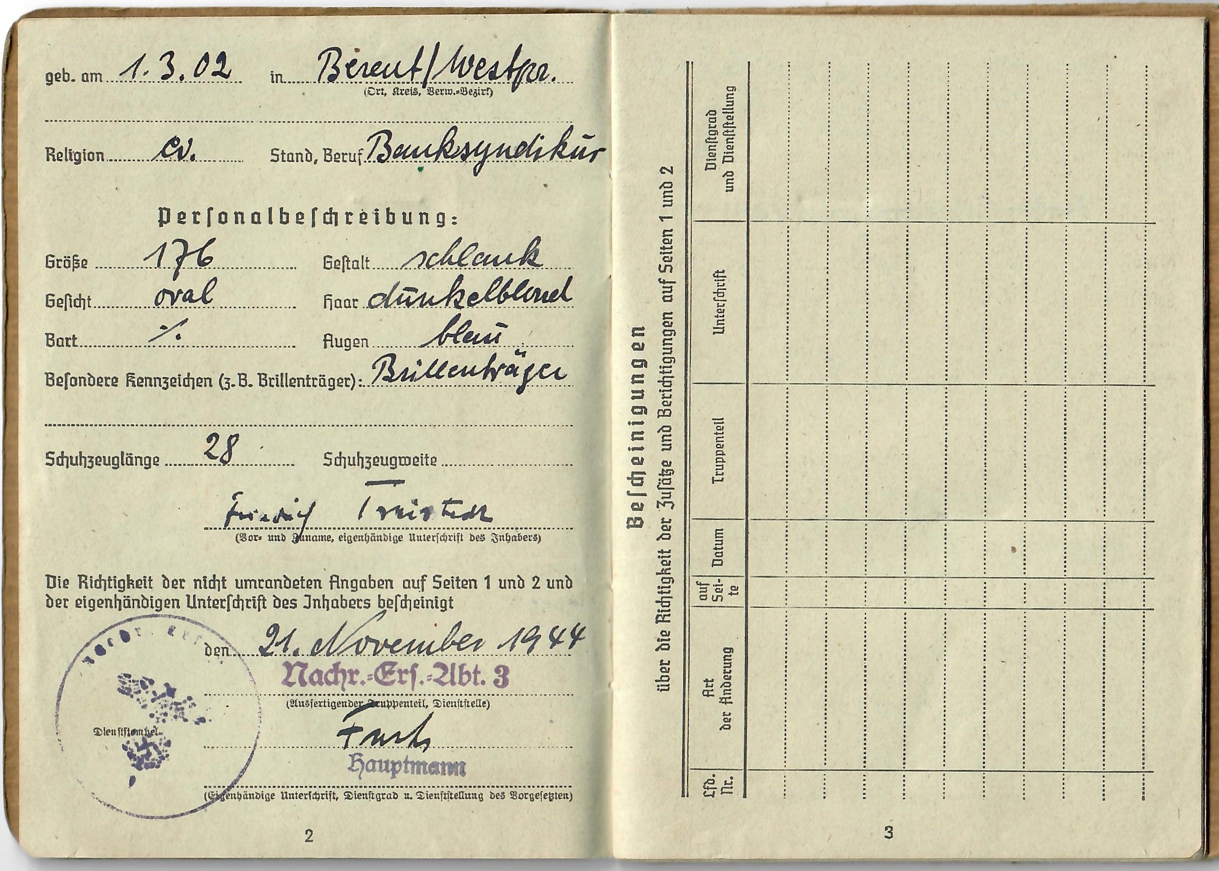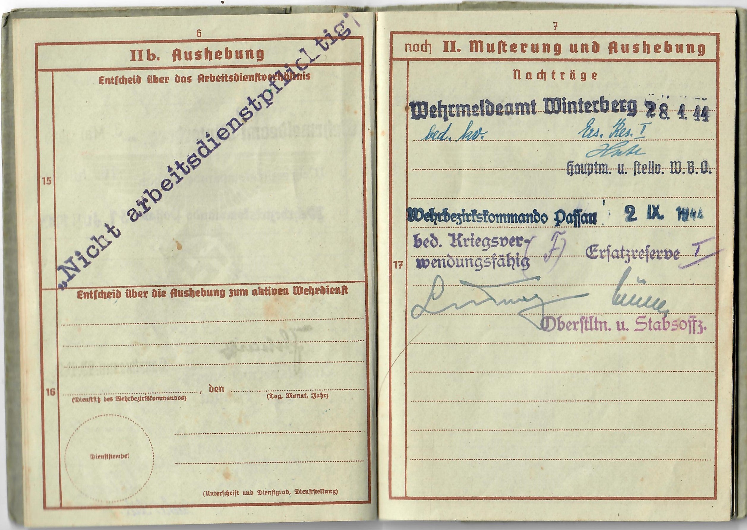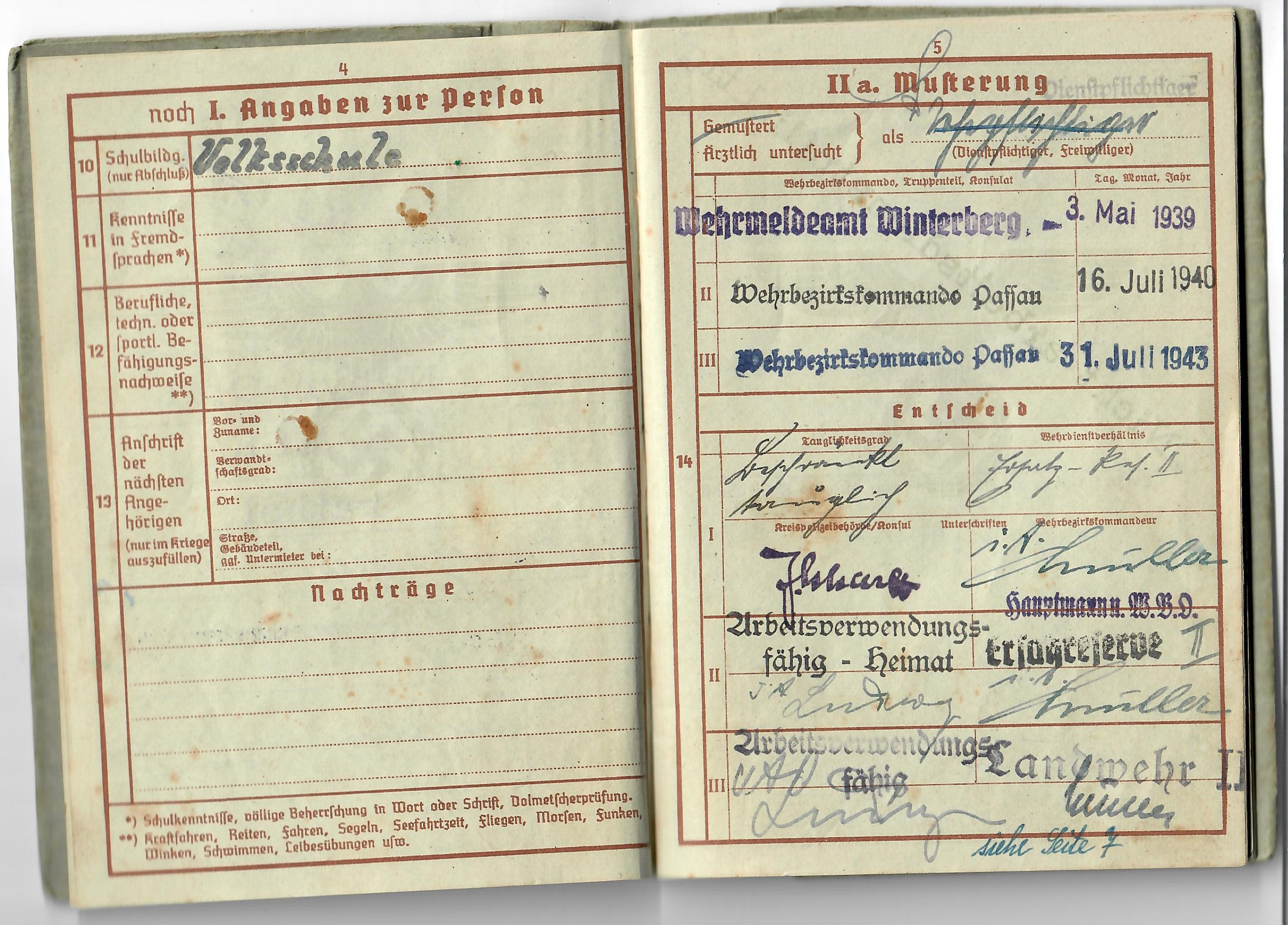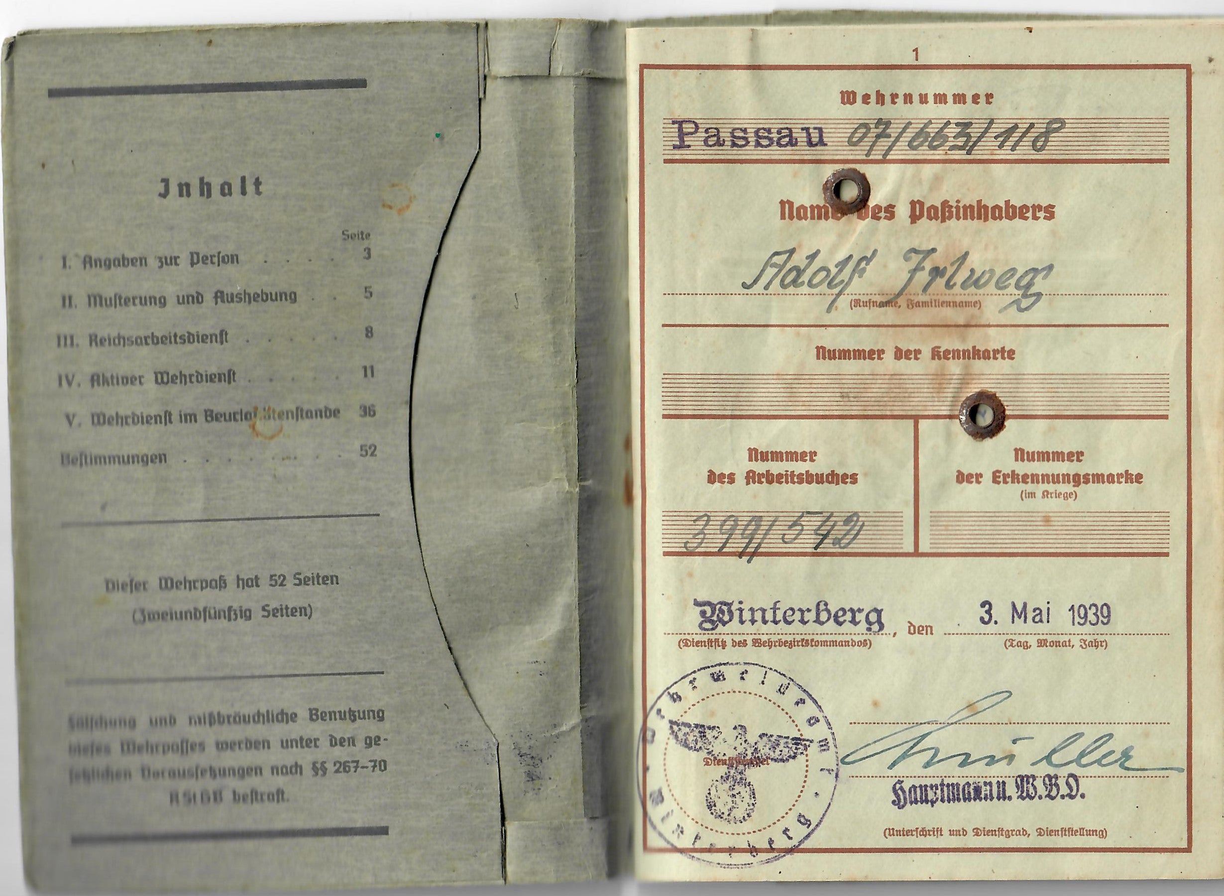 - One German WWII Wehrpaß Identification Book issued 3. Mai 1939 and named to what looks like Adolf Frlweg. These identification books were required beginning in 1935 with the beginning of conscription in NSDAP-ruled Germany, and all eligible males were required to get one. His date of birth is listed as 1. 11. 1907, so he was also quite a bit older than the usual recruit, and had to get this pass as the conscription was widened late in the war.
