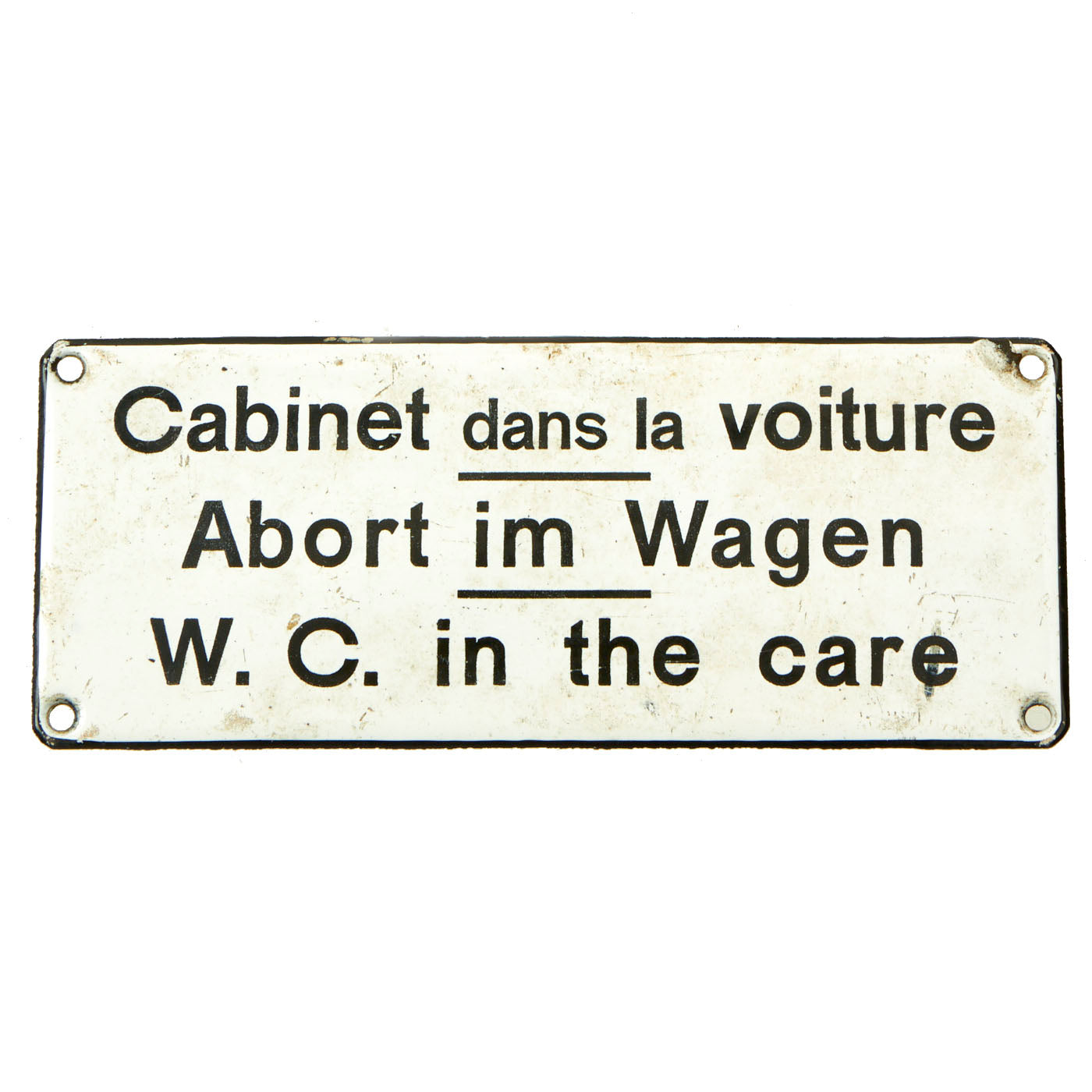 - One small sign measuring about 5 7/8" x 2 1/4", with the text Cabinet dans la voiture / Abort im Wagen / W. C. in the care (last E is crossed out), which all mean that a bathroom is in the car in French, German, and English. The error in the English translation is definitely an interesting note, and there were most likely quite a few of these produced with the same error.