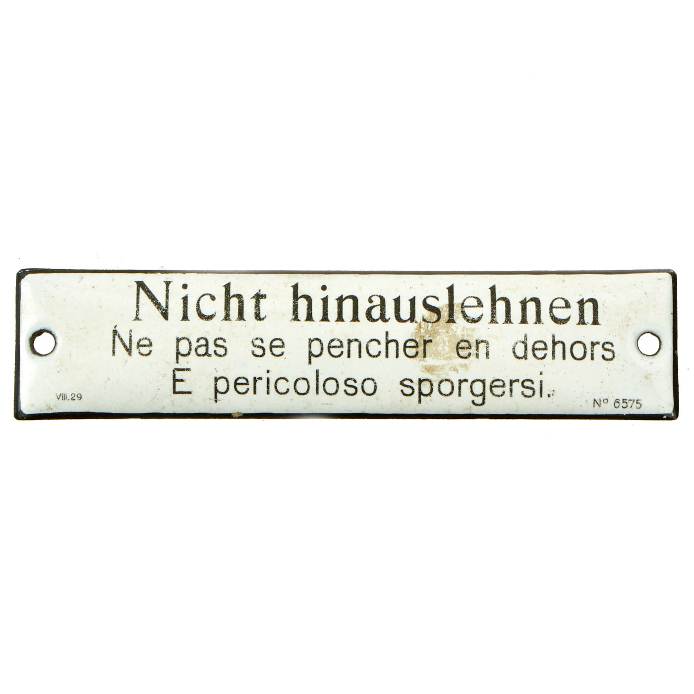 - One Small sign measuring about 5"W x 1"H, with the text Nicht hinauslehnen / Ne pas se pencher en dehors / È pericoloso sporgersi, which means "Don't Lean Out" in German, French, and Italian. There are also production and stock numbers marked on the front of the sign.