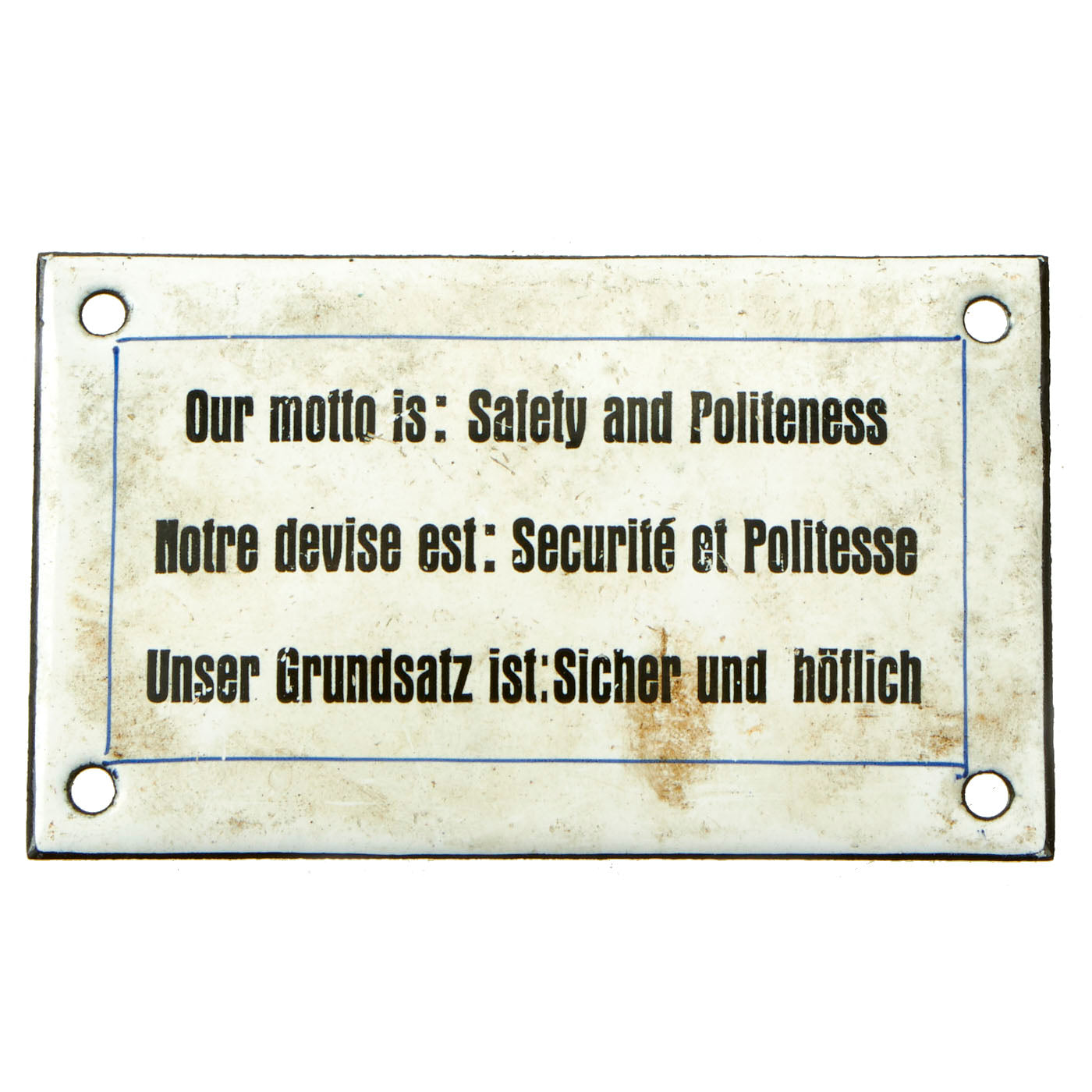 - One Small sign measuring about 3 7/8" x 2 1/4", with the text Our motto is: Safety and Politeness / Notre devise est: Sécurité et Politesse / Unser Grundsatz ist: Sicher und hoflich / Unser Grundsatz ist: Sicher und höflich, which all mean the same thing in English, French, and German.