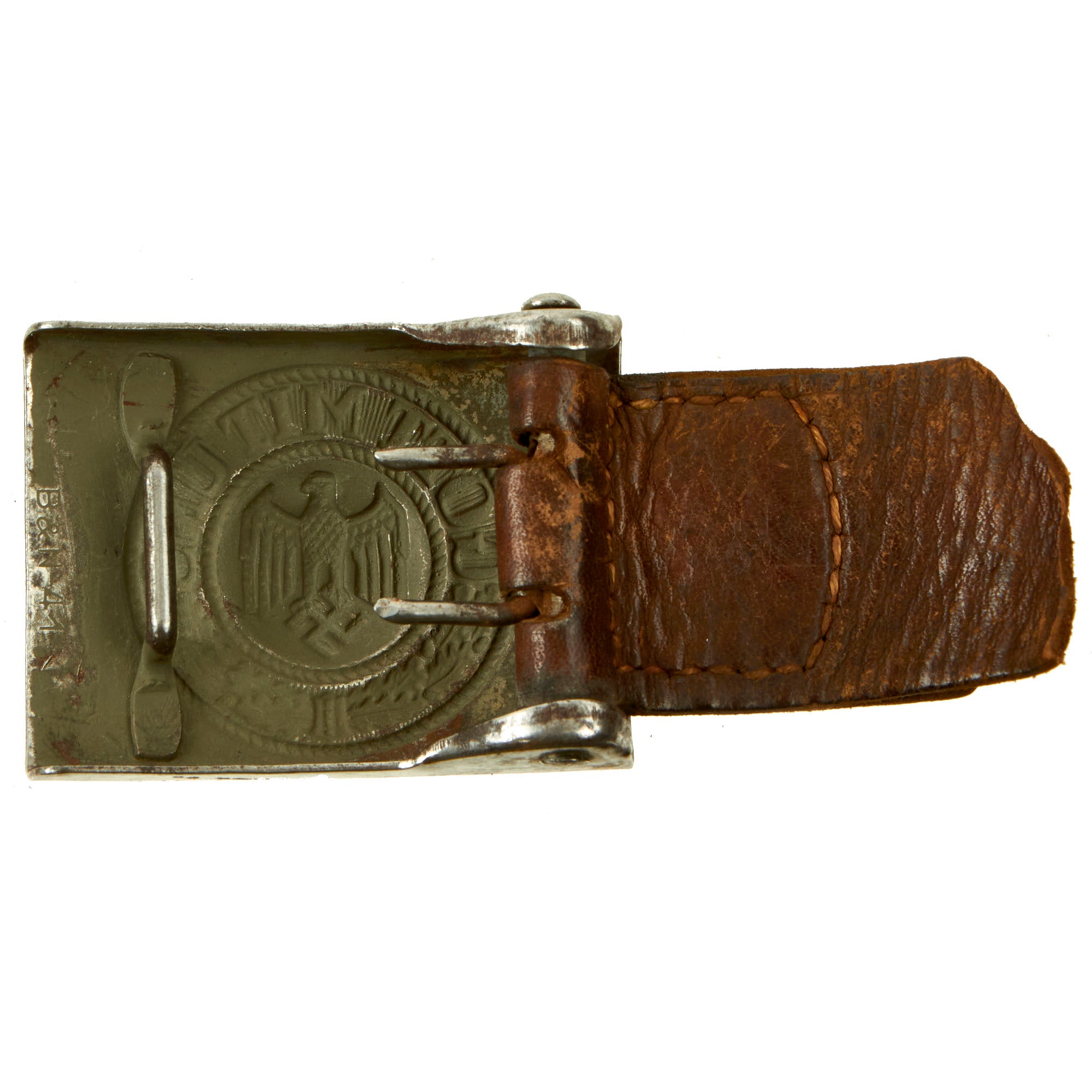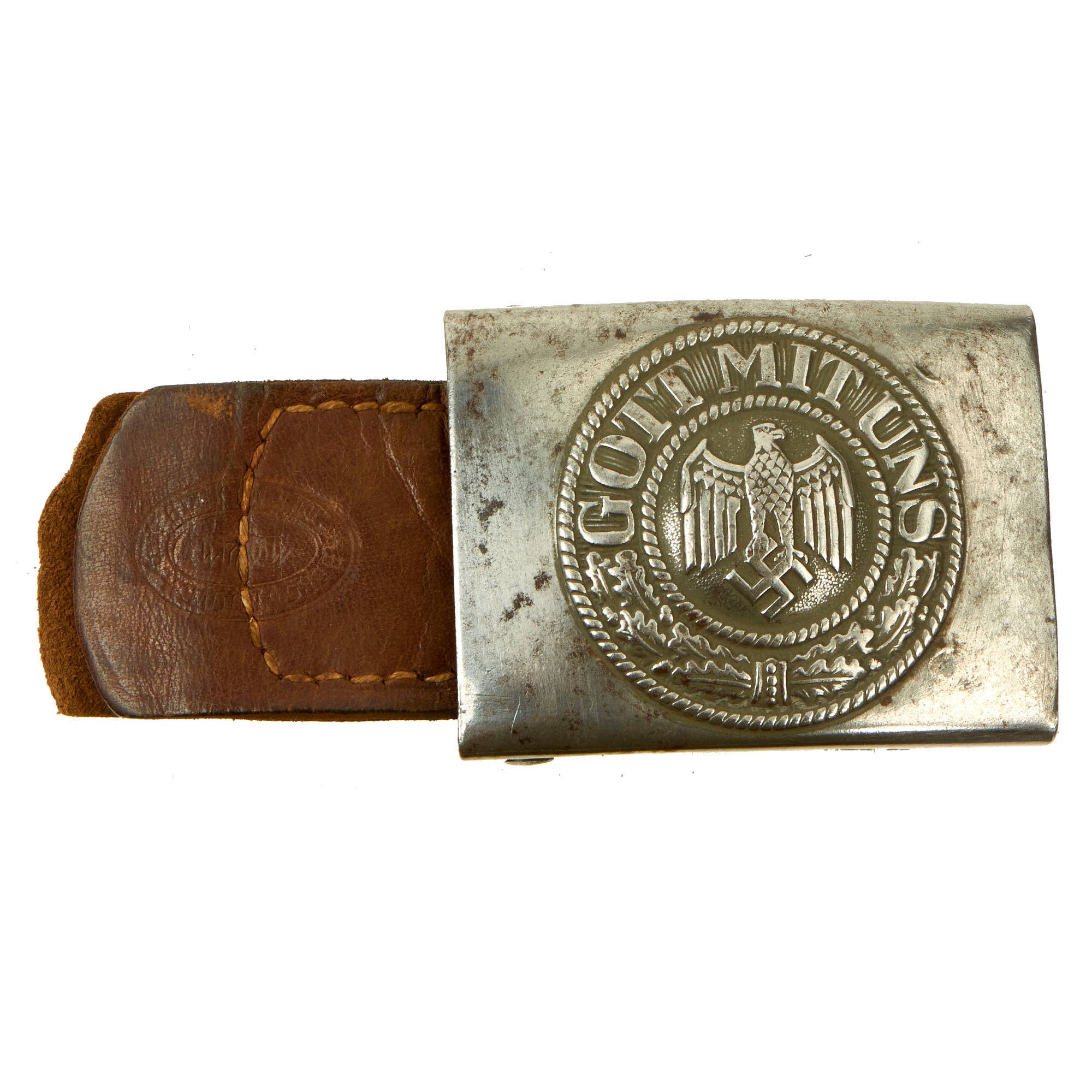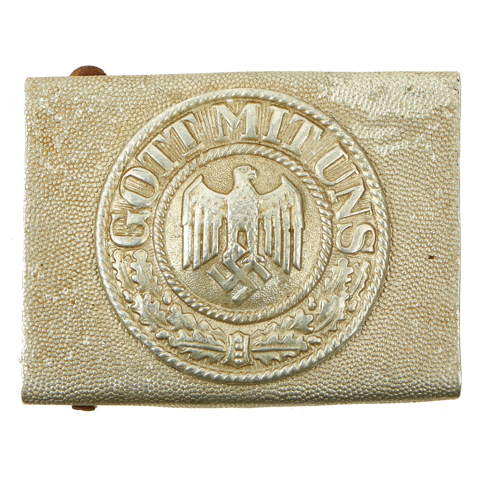Original Item: Only One Set of 2 Available. Here we have a very nice set of two WWII German Wehrmacht Heer (Army) EM/NCO's Buckles (Koppelschloßen), which really help show the range of various construction styles used during the war. Both are correctly embossed with the Heer motto GOTT MIT UNS ("God with us") in a double rope border surrounding a "Closed Wing" Wehrmachtadler Armed Forces Eagle. Below this is a partial oak leaf wreath.