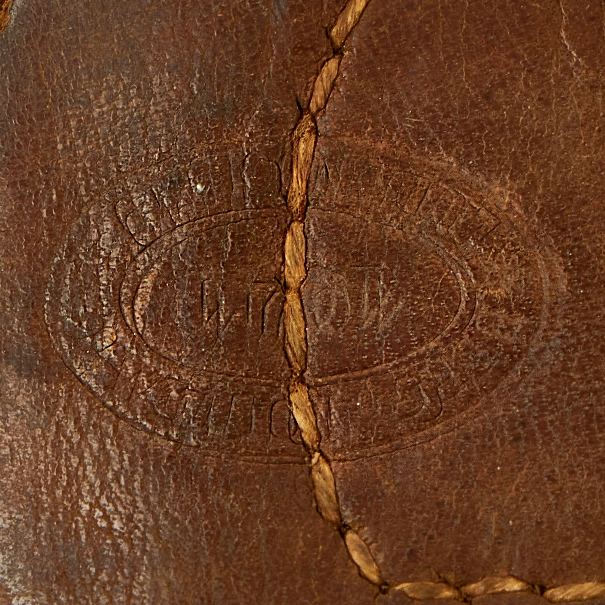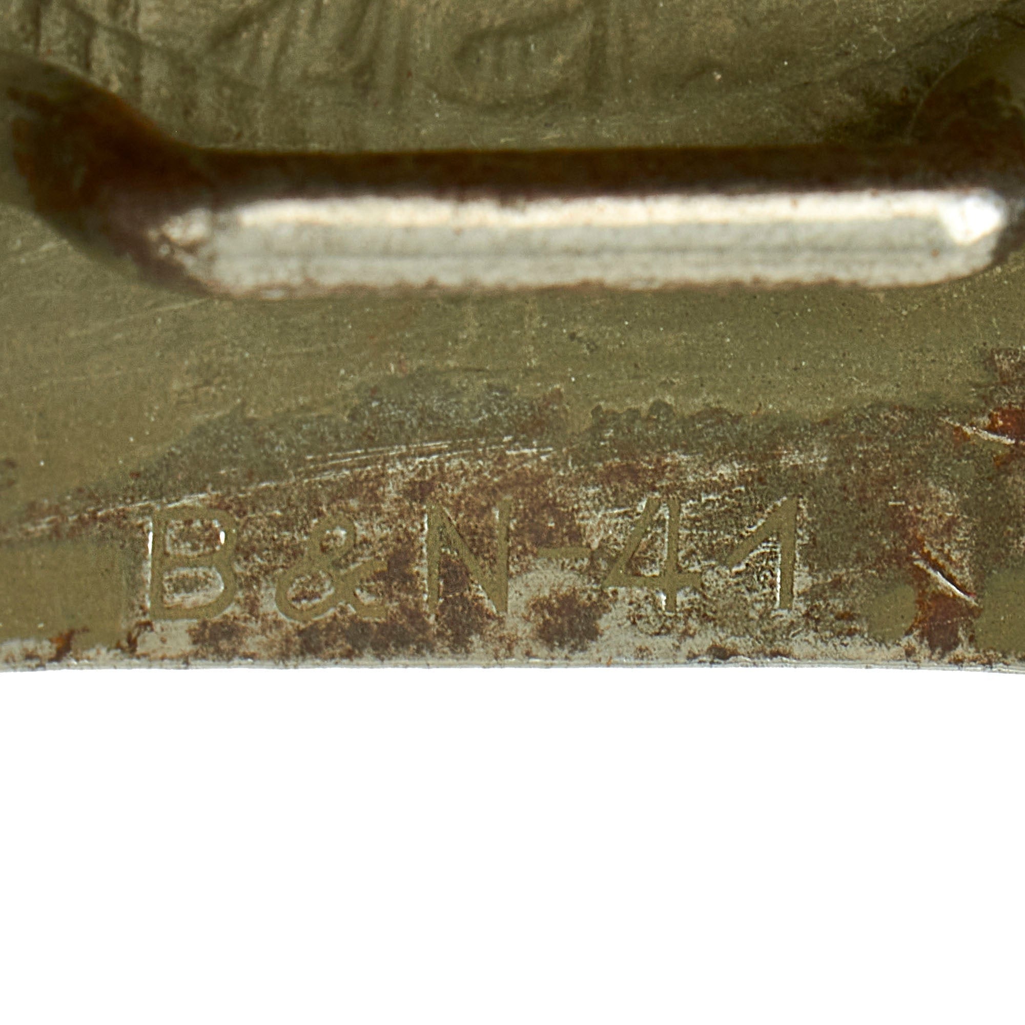 The second example is a painted steel construction type with a smooth background. It was originally painted field gray on both sides, but wear and polishing have removed most of the original paint from the front. The belt buckle is marked B & N 41 by the retaining loop, and still has the leather tab, which still gives the full maker information: