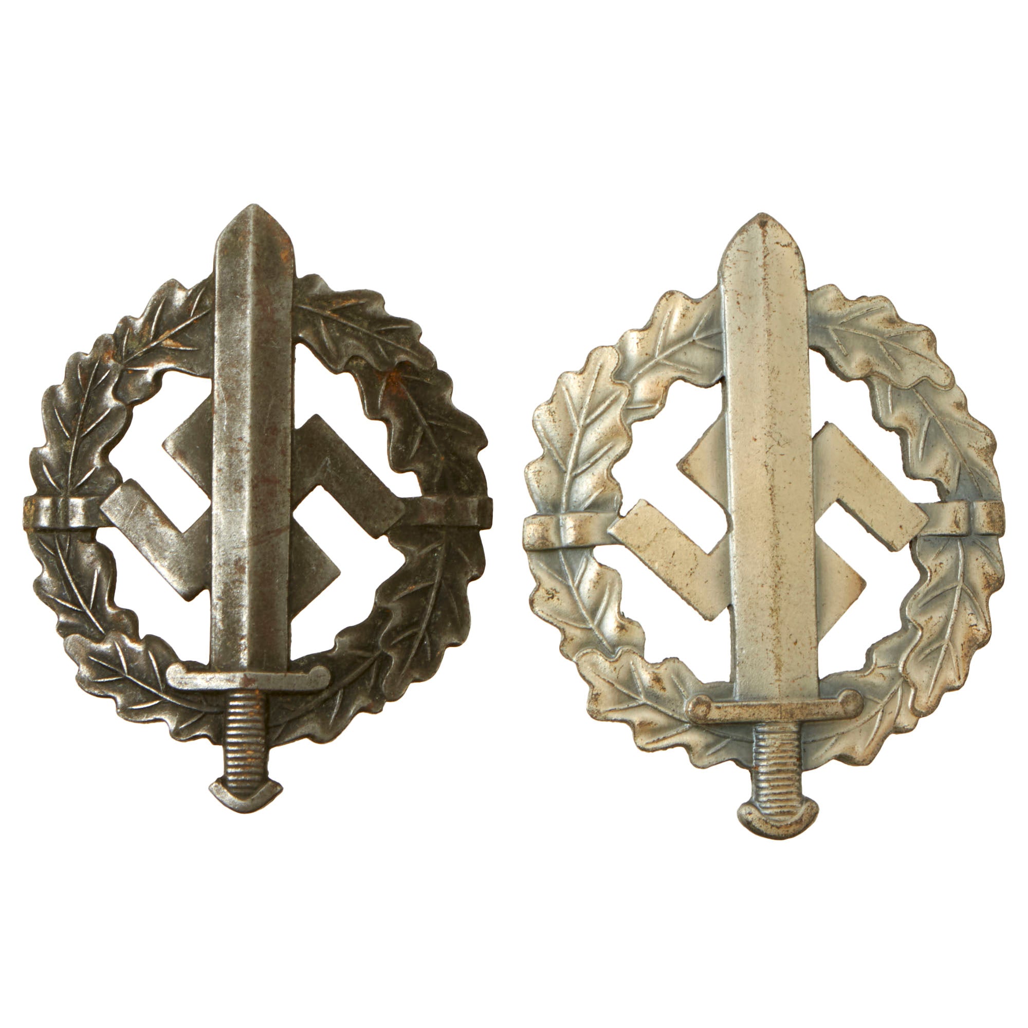 This is a lovely set of two SA Defense Team Sports Training Badges, one in Silver grade and one in Bronze. Both are manufactured from stamped steel, which was then washed with the appropriate material for the grade, which may have been metal powder paint. The silver badge definitely retains much more of the original wash, and is still clearly silver, while the bronze badge has lost most of the wash on the front, showing the bronze well only on the reverse. Both badges have intact functional pinbacks, under which is the following marking: