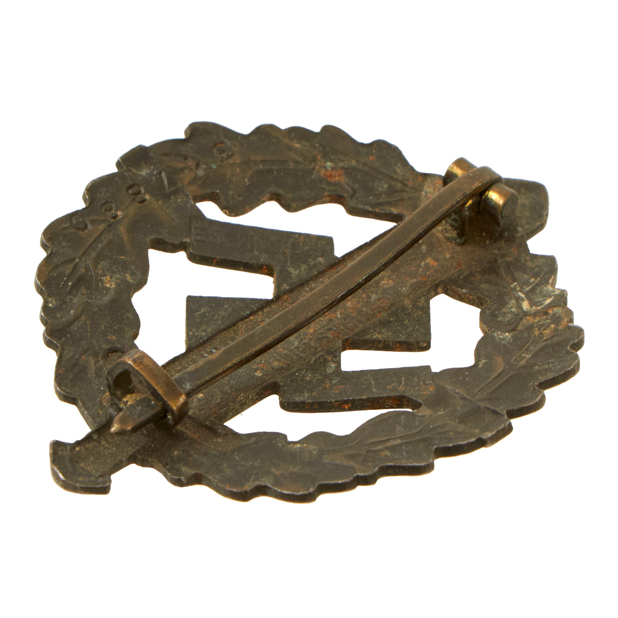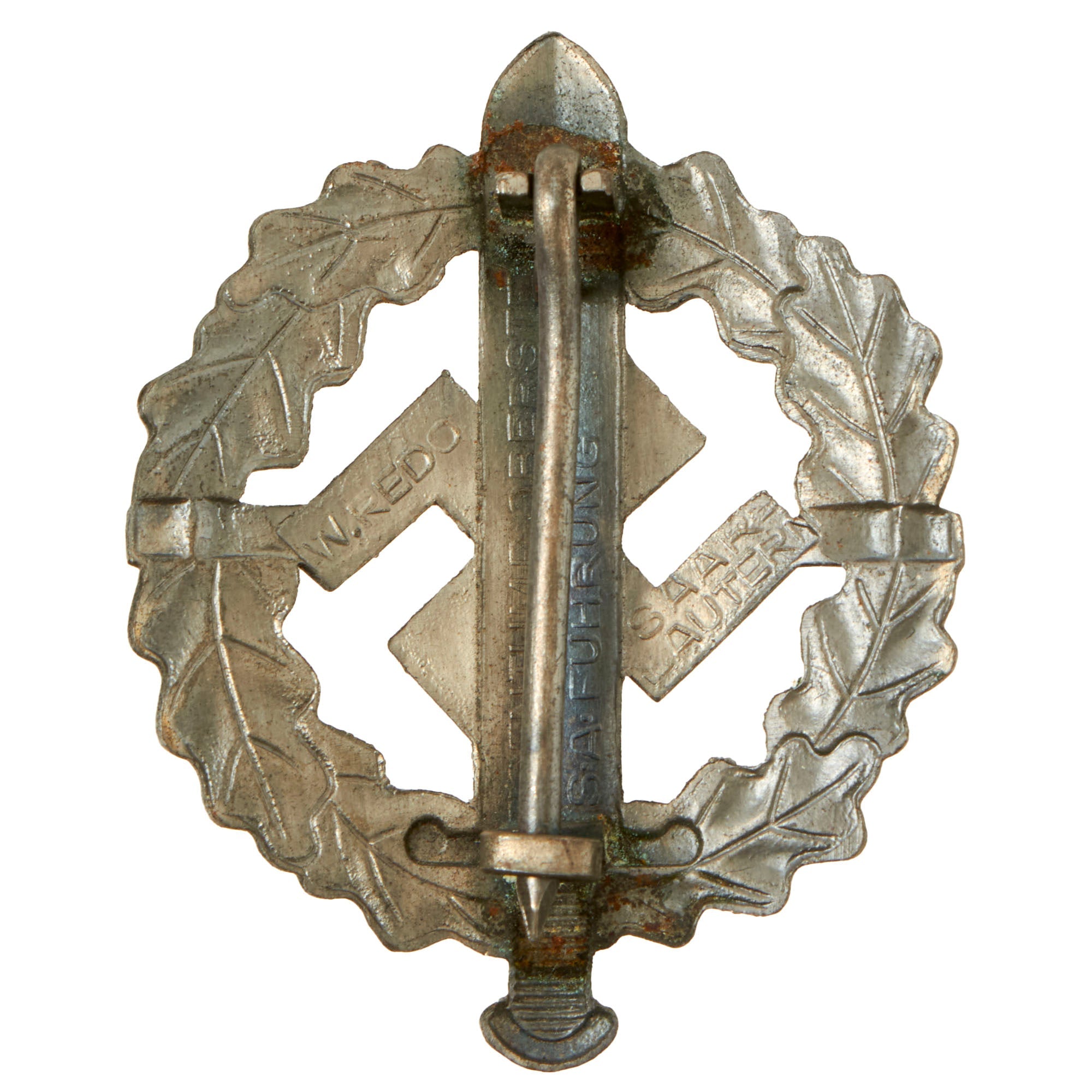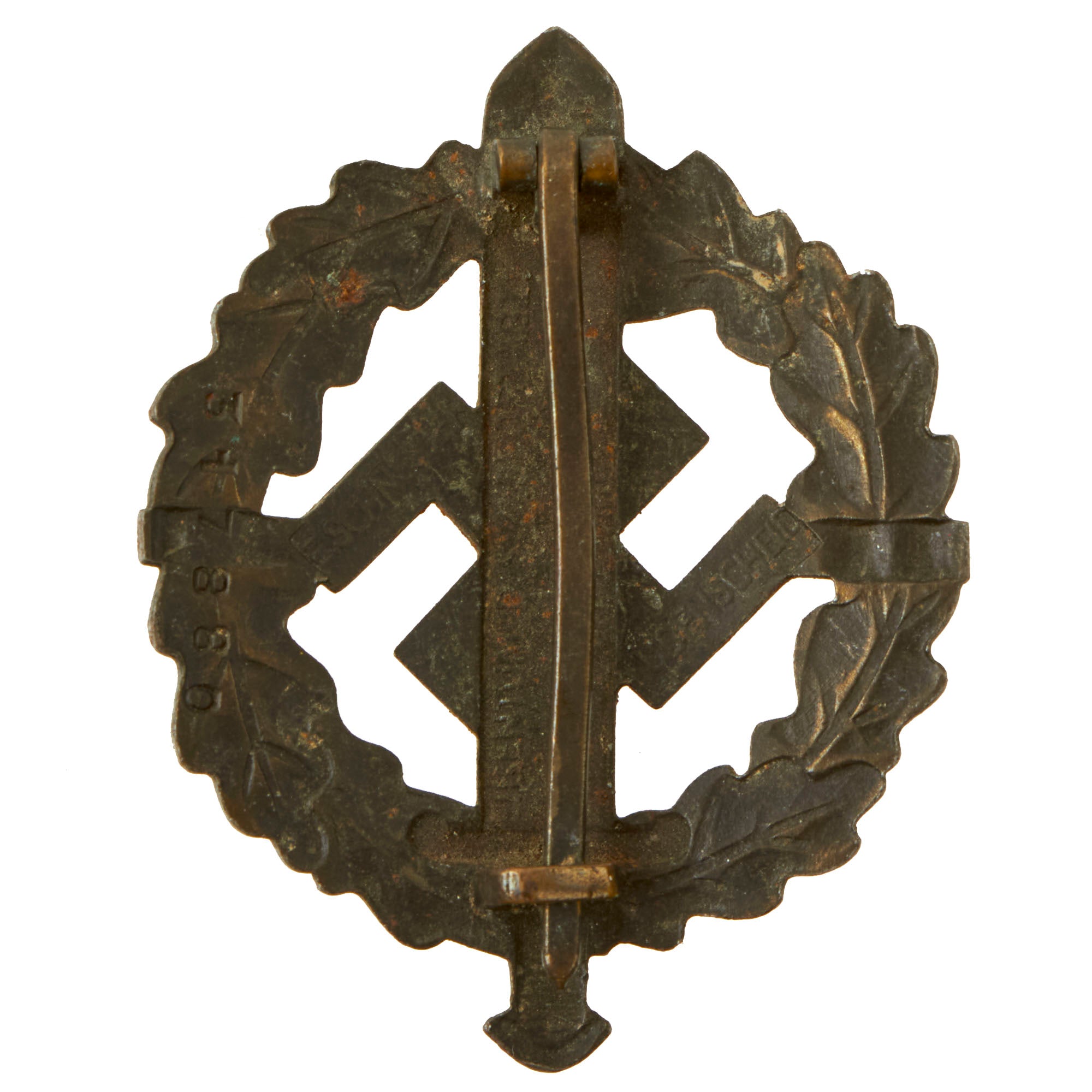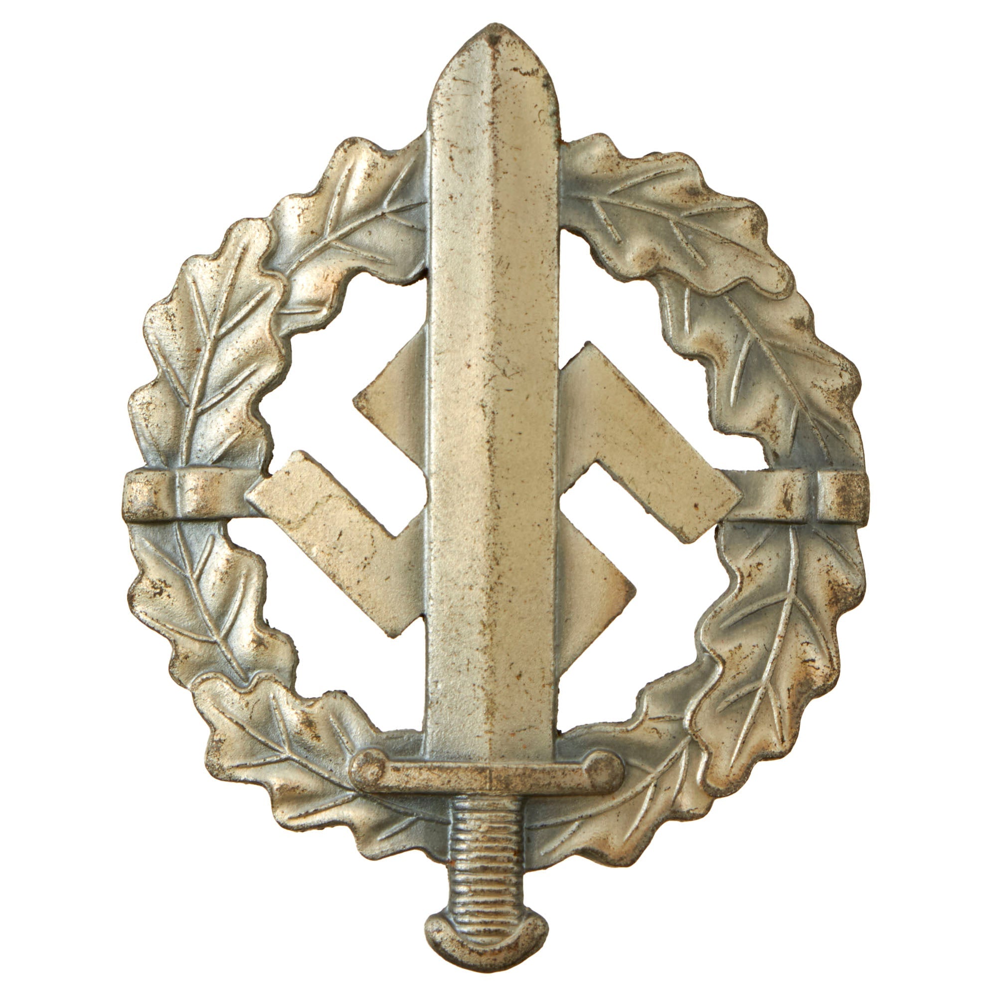 The SA Sports Badge was a decoration of NSDAP Germany that was issued between the years 1933 and 1945. It was a political version of the much more generic German Sports Badge, which was also issued in great numbers by the NSDAPs. At its center was a 57mm high Roman broad sword, superimposed over a NSDAP swas. It was encircled by an wreath of oak leaves. It was a pin-back badge. There was a cloth version, as well.