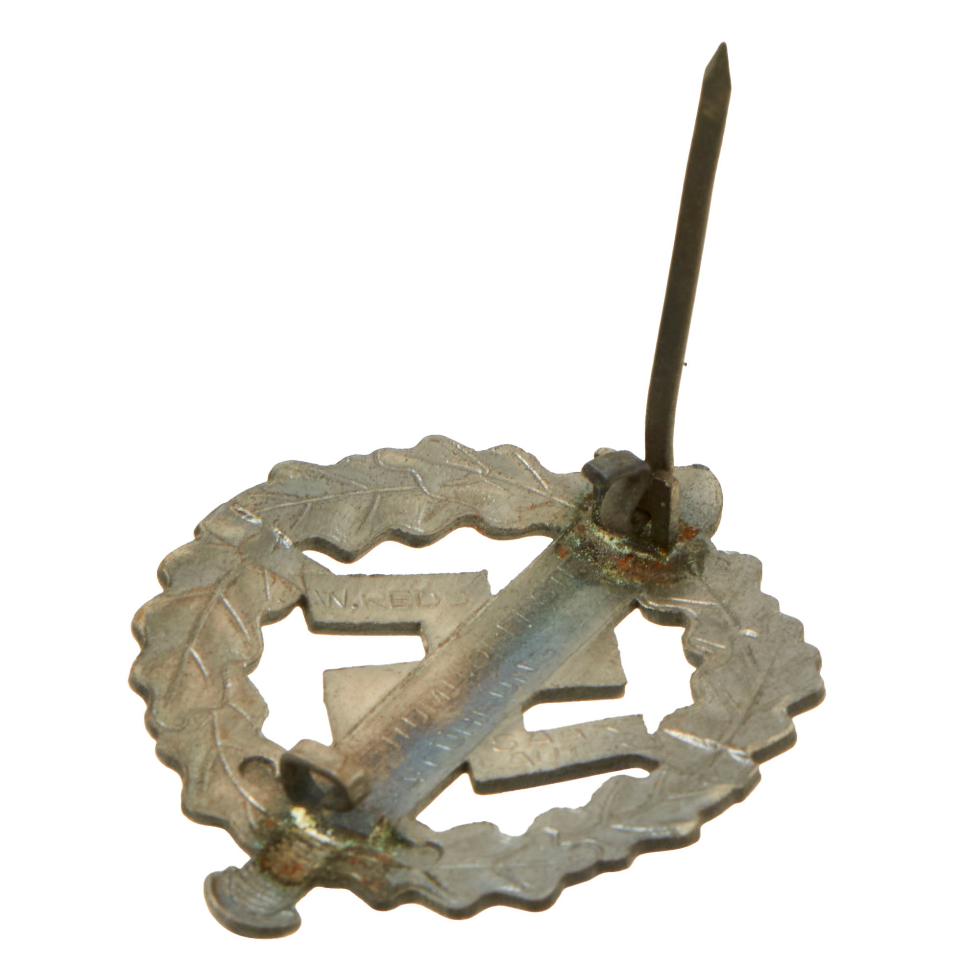 The bronze badge is maker marked on the back by E. SCHNEIDER / LÜDENSCHEID on the arms of the swas, for maker Ernst Schneider of Lüdenscheid, a city with a large garment accessories industry. It is also marked with issue number 317880, which indicated who it was issued to.