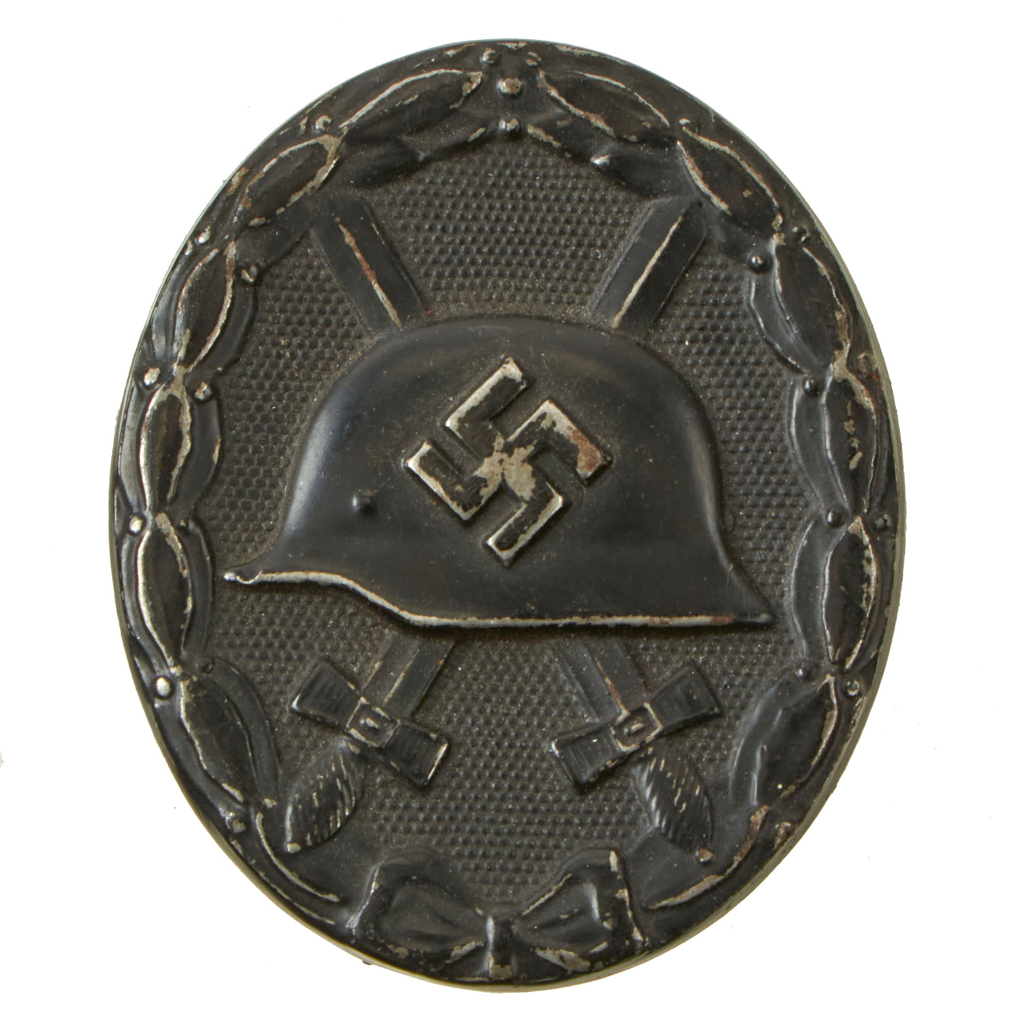 The design of the oval badge depicts an embossed profile of a mobile swas (hook cross), above an M35 pattern helmet, which is above two crossed broad swords. This then lies on a pebbled field and is surrounded by a laurel leaf and berry wreath which is tied together at the bottom with a bow tie.