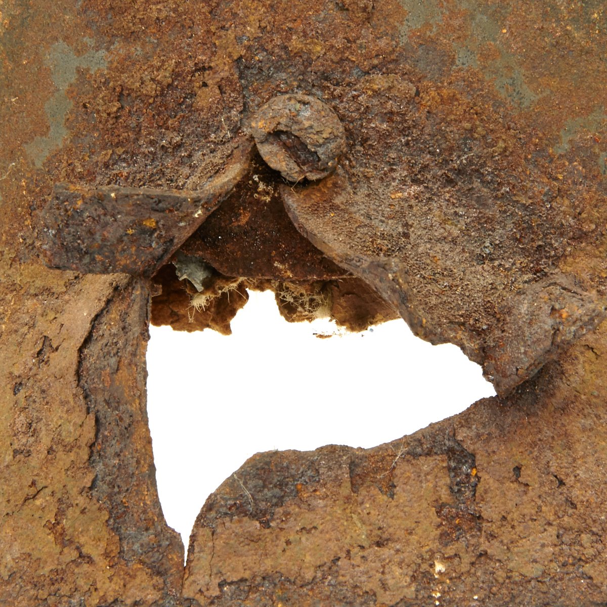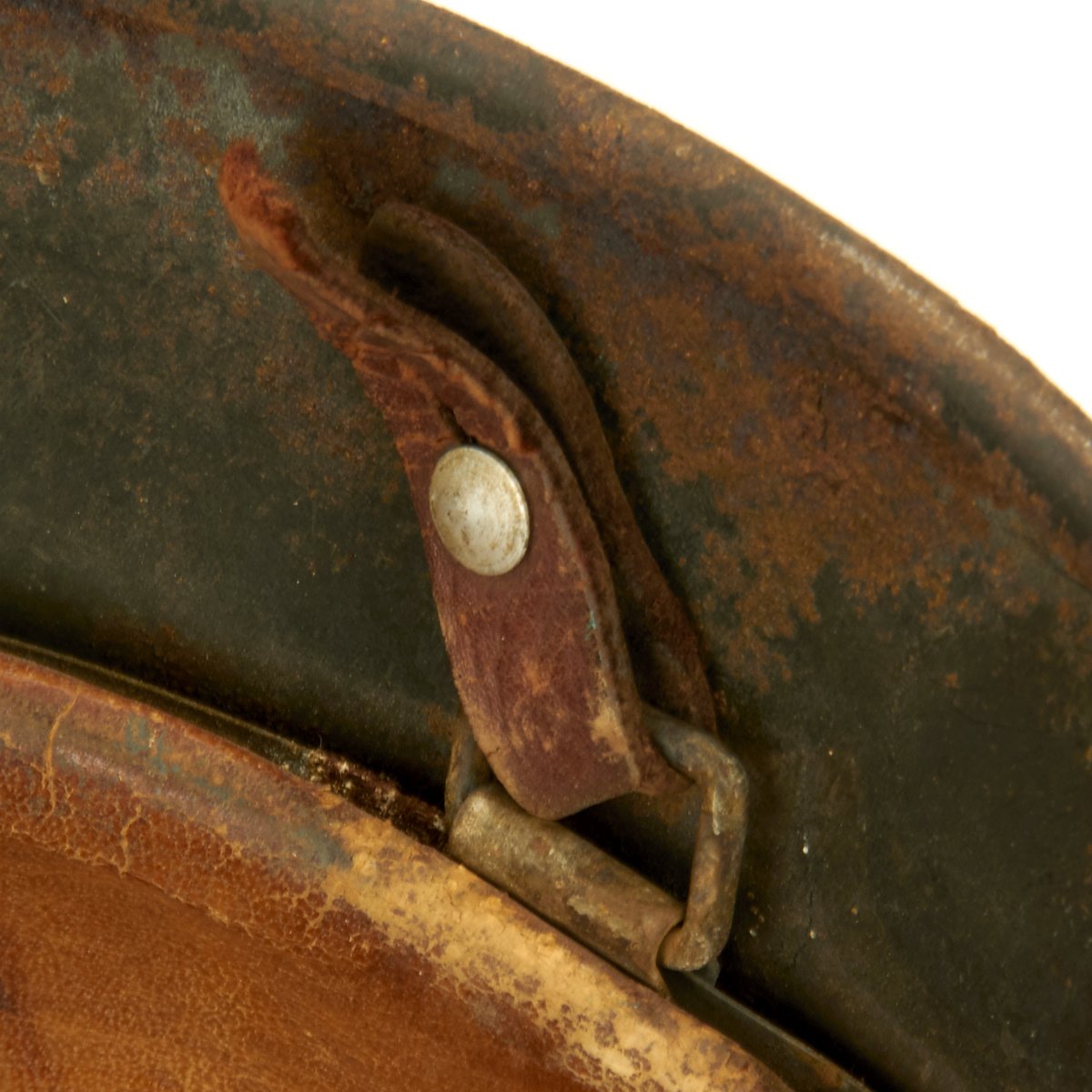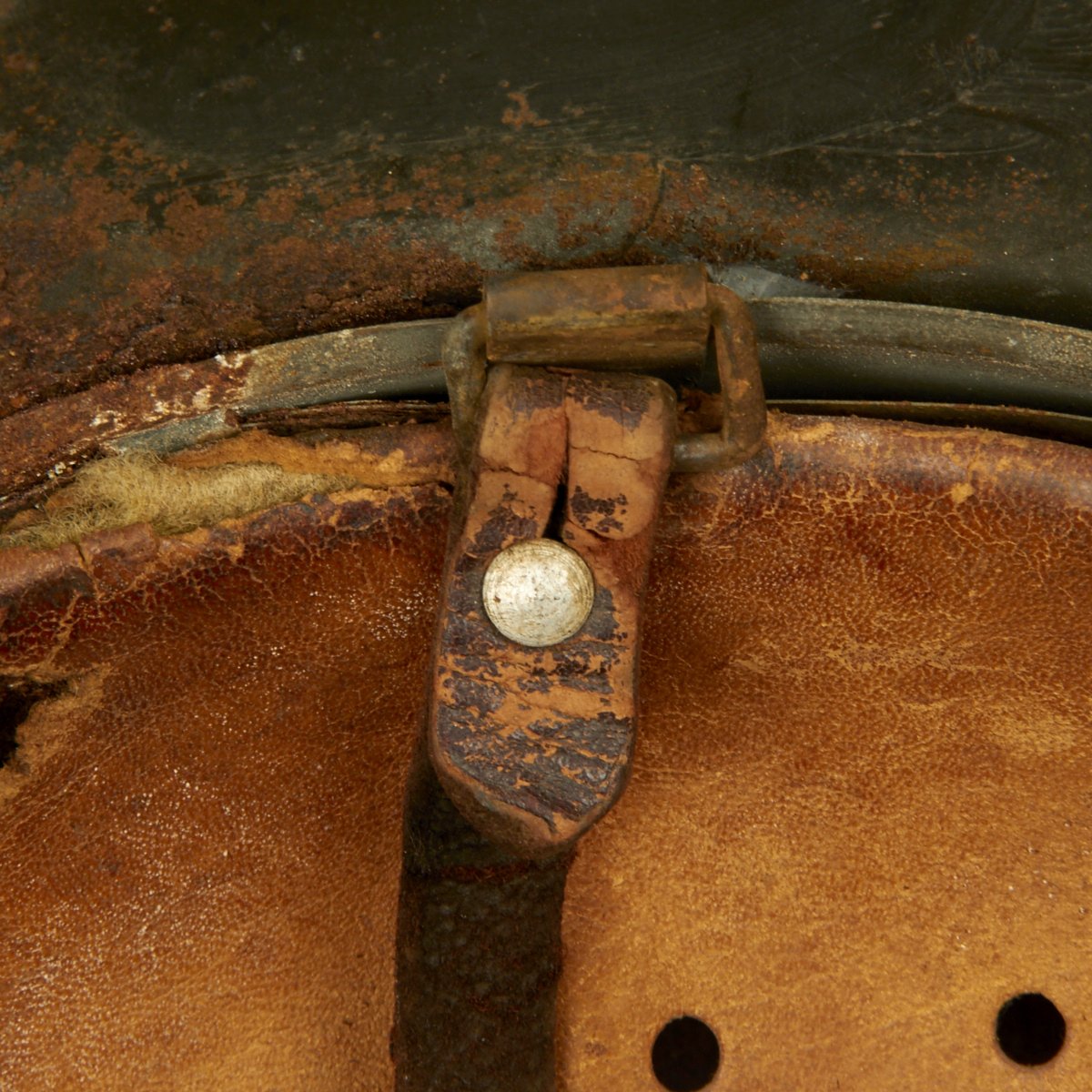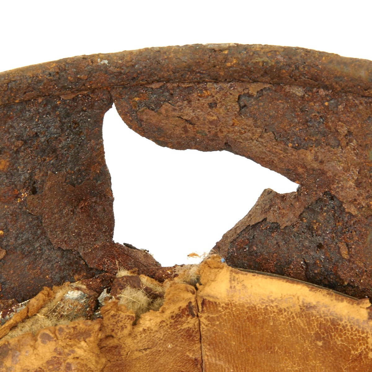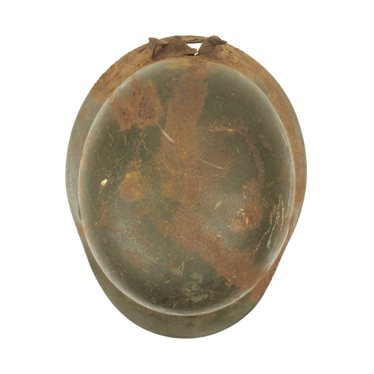The unique aspects of this helmet are many; first there is a .45 caliber size bullet hole (Thompsn SMG or 1911 pistol) that passes through the front of the helmet and exits through the back. The exit hole is spectacular. Close inspection of the paint, style and aging of the edges along with the provenance lead us to be very confident that this totally 100% genuine. The shell also shows a type of surface rust that is most associated with blood stains.