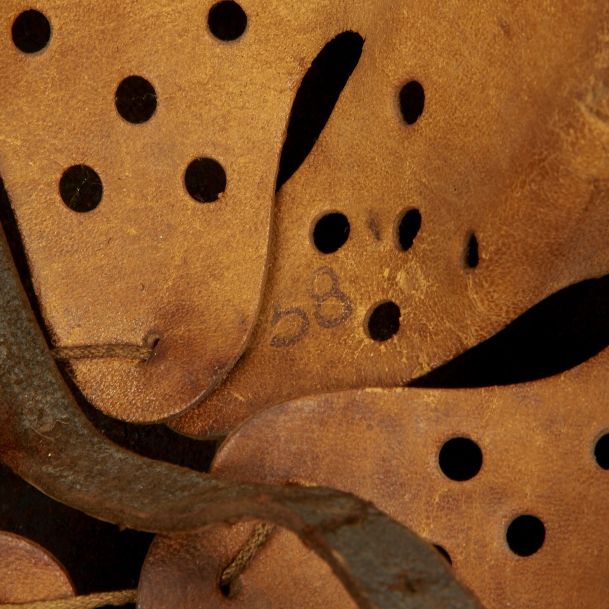 Chinstrap is present but broken and the original liner is in surprisingly good condition aside from the bullet holes and is size stamped 58.