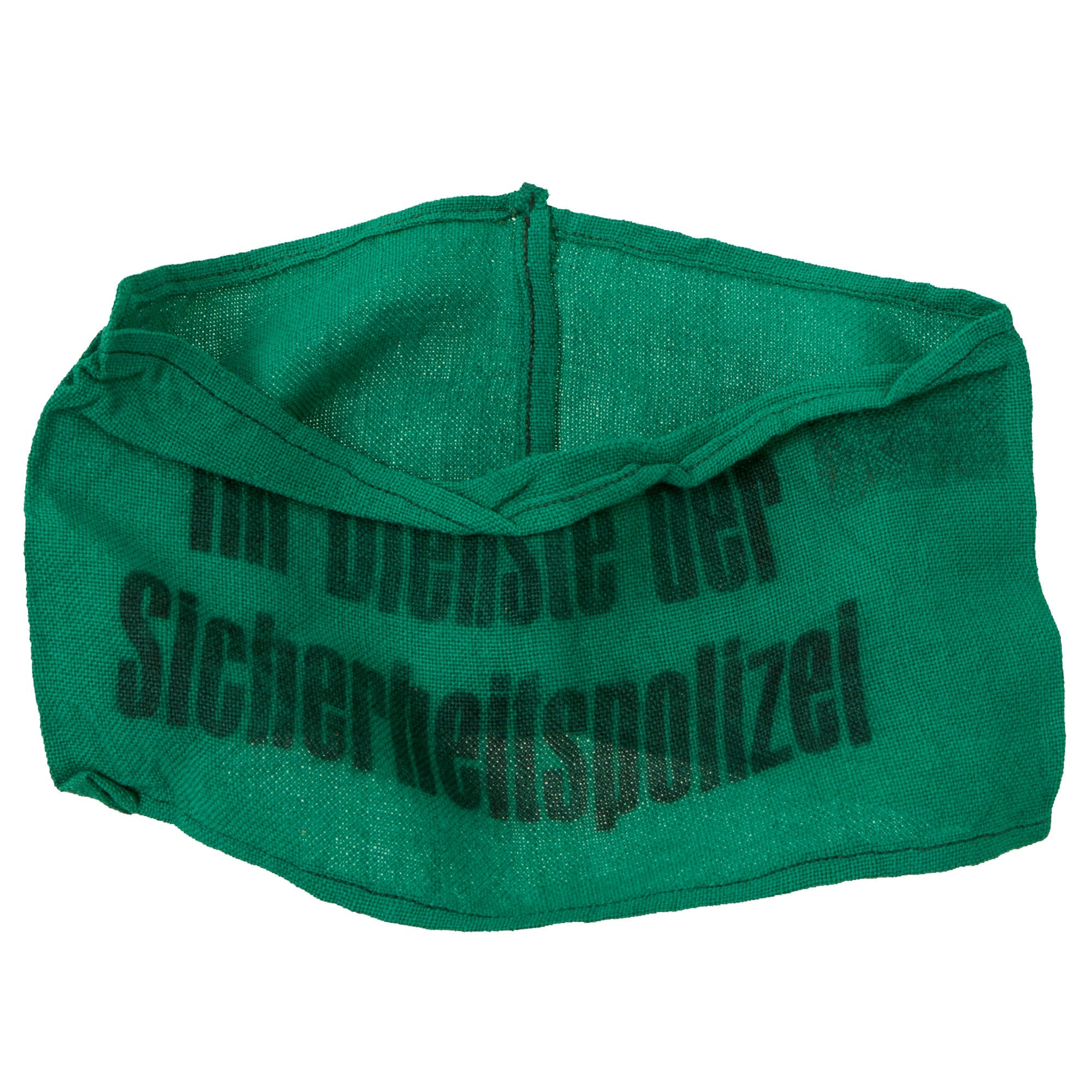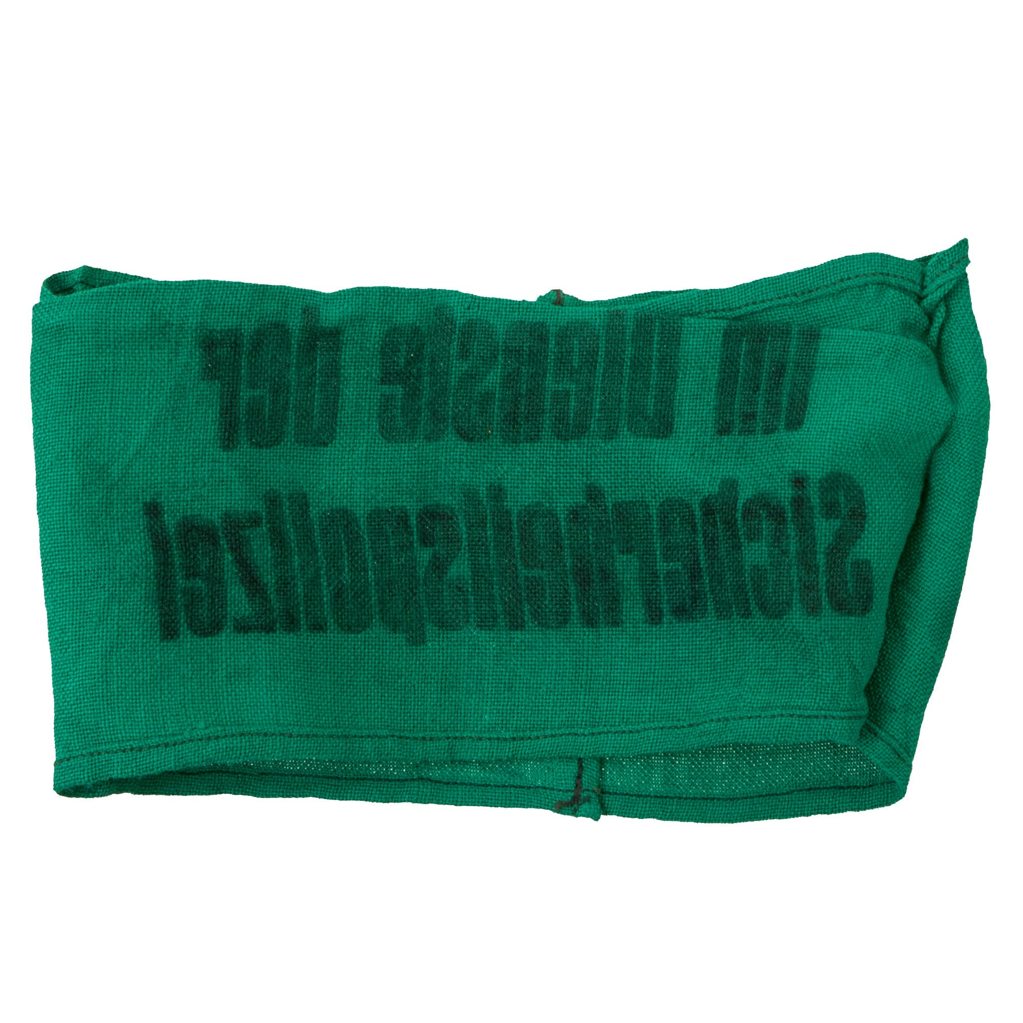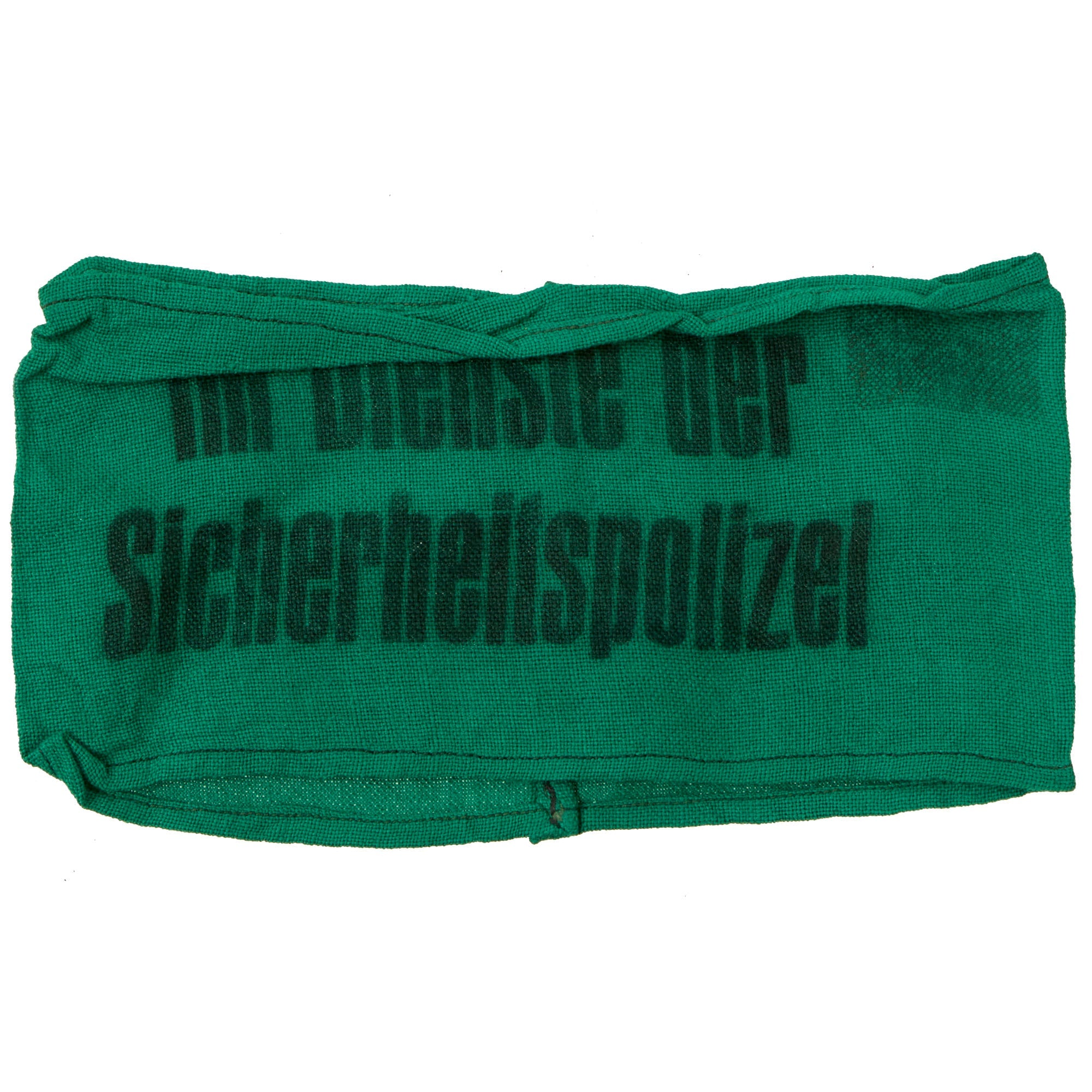 Original Item: Only One Available. This Sicherheitspolizei Armband is a nice, issued example. The Sicherheitspolizei (Security Police or SiPo), formed of the combined Gestapo and Kriminalpolizei, was the state political and criminal investigation security apparatus during the Third Reich. This armband is made of a thin green cotton fabric, with a smooth feel. It is printed with the wording Im Dienste der Sicherheitspolizei (In the Service of the Security Police) in Latin lettering. The long edges of this armband have been finished with straight machine stitching, and the ends are sewn together with a typical “French seam.” It measures approximately 15" x 3 3/4".