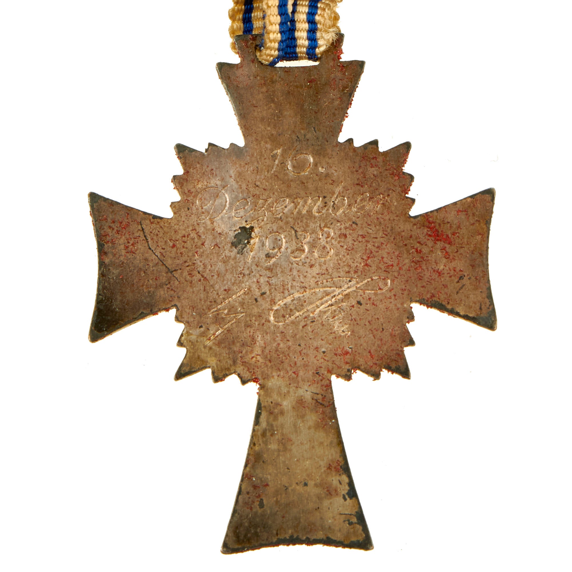 Reverse of medal reads 16 December 1938, which is the date that the award was first established, along with AH's Signature. The condition is very good with a lovely tarnished patina on the cross, and a nice aged toned look on the ribbon. We usually see these looking unissued, most likely liberated from a depot after the war, so having one with real period wear is definitely a treat!
