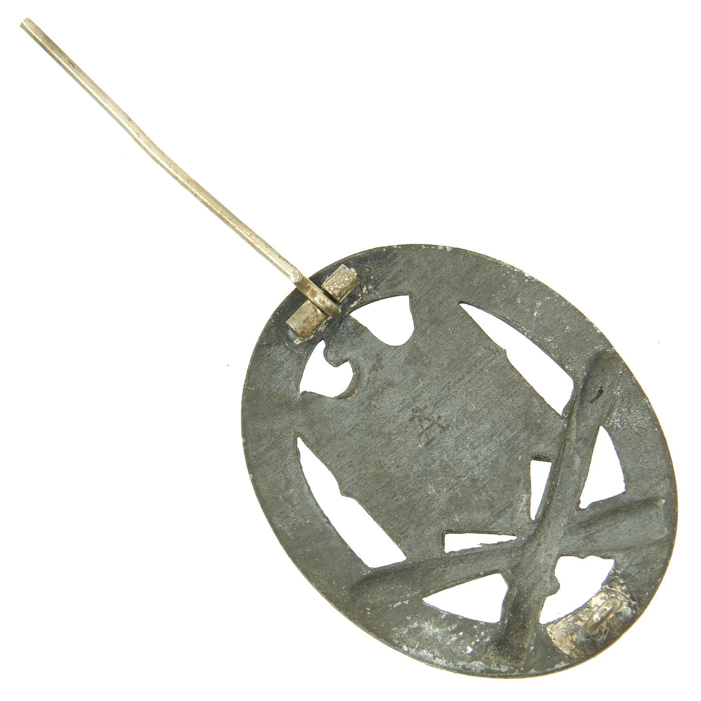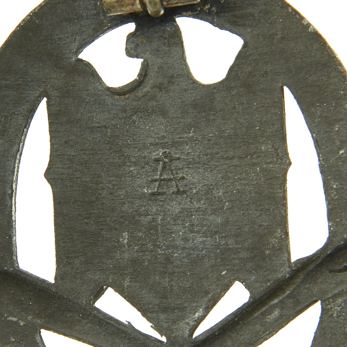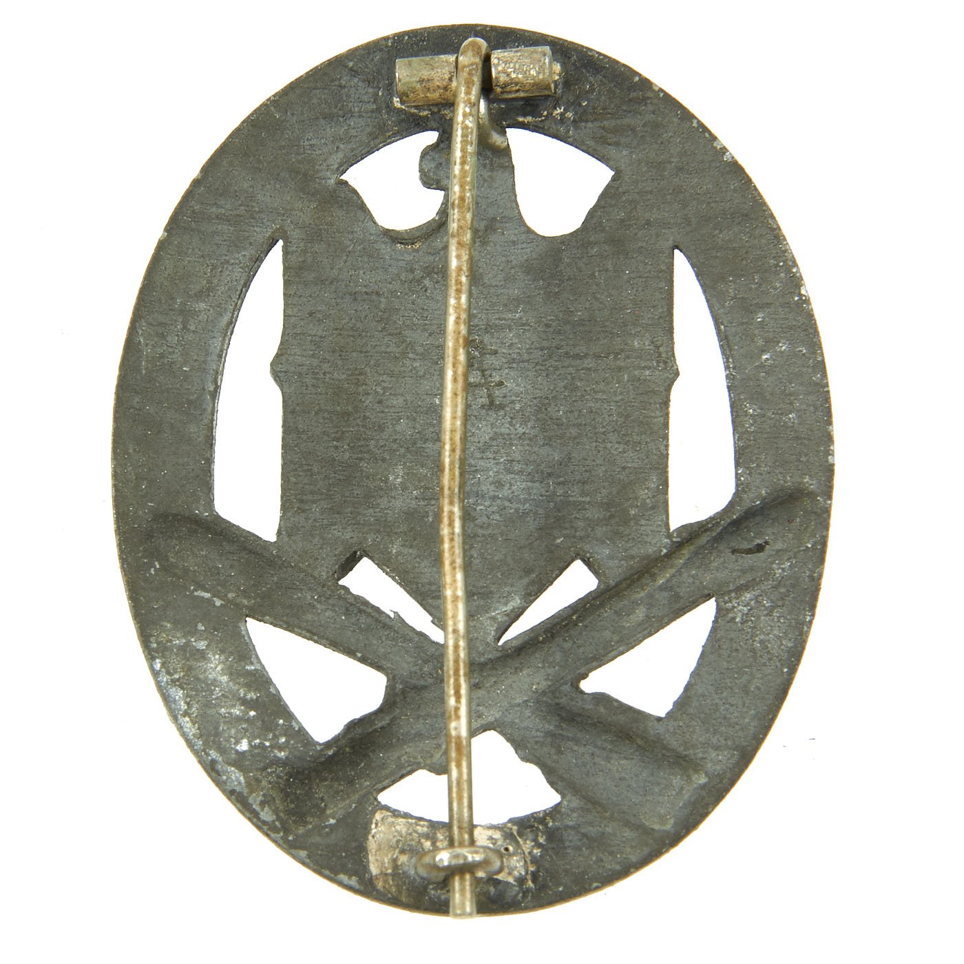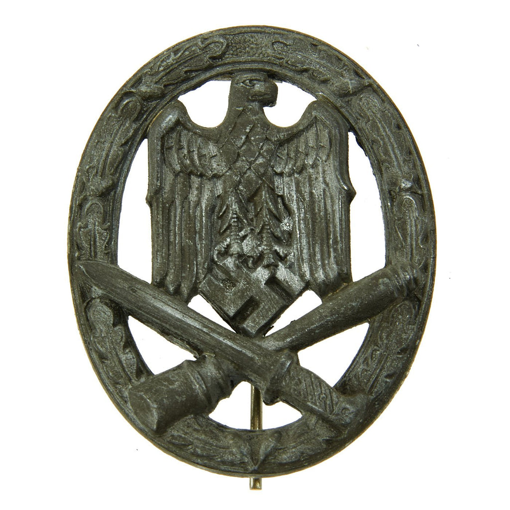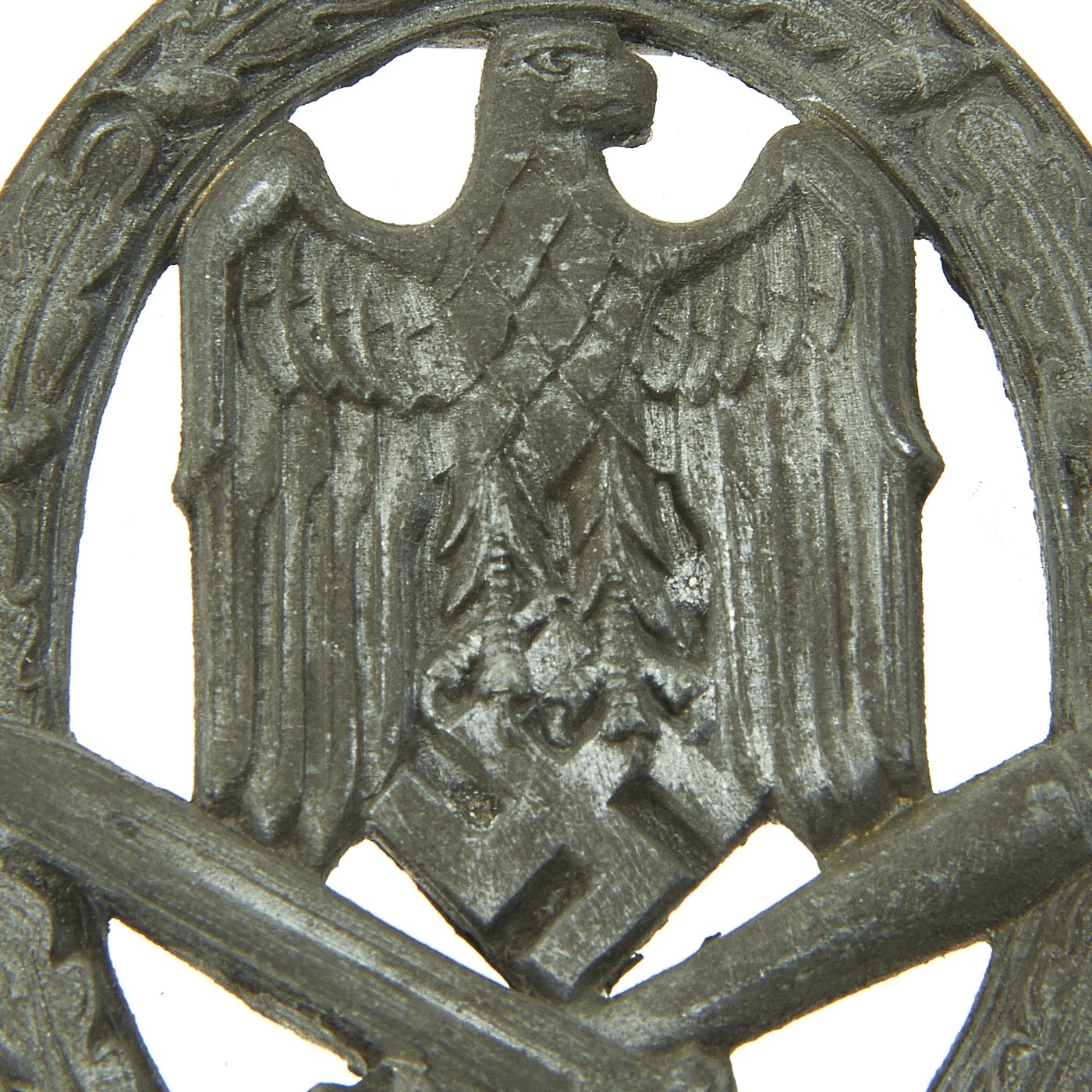 Original Items: Only One Available. This is a very nice condition Silver Grade General Assault Badge with Hollow Back and functional pin. The badge measures approximately 2 1/8" x 1 5/8", and is in very good condition. Like many of these badges, over the years the silver has worn away, with only traces left on the front, with most remaining on the hinge and pin. The back is marked with the "barred A" trademark, of F. W. Assmann & Söhne of Lüdenscheid, a large maker of belts, buttons, and other accoutrements. A very nice example. ready to add to your collection!