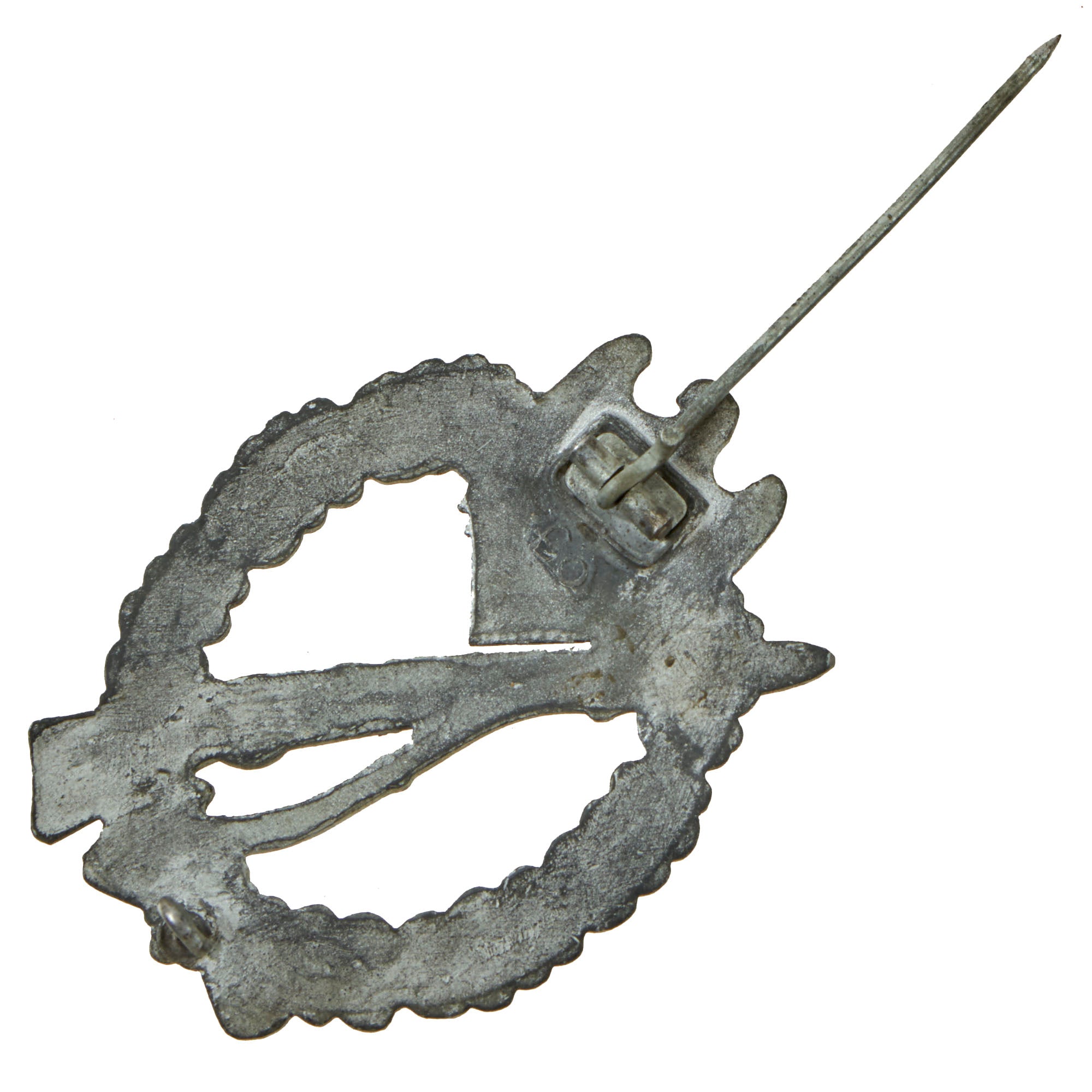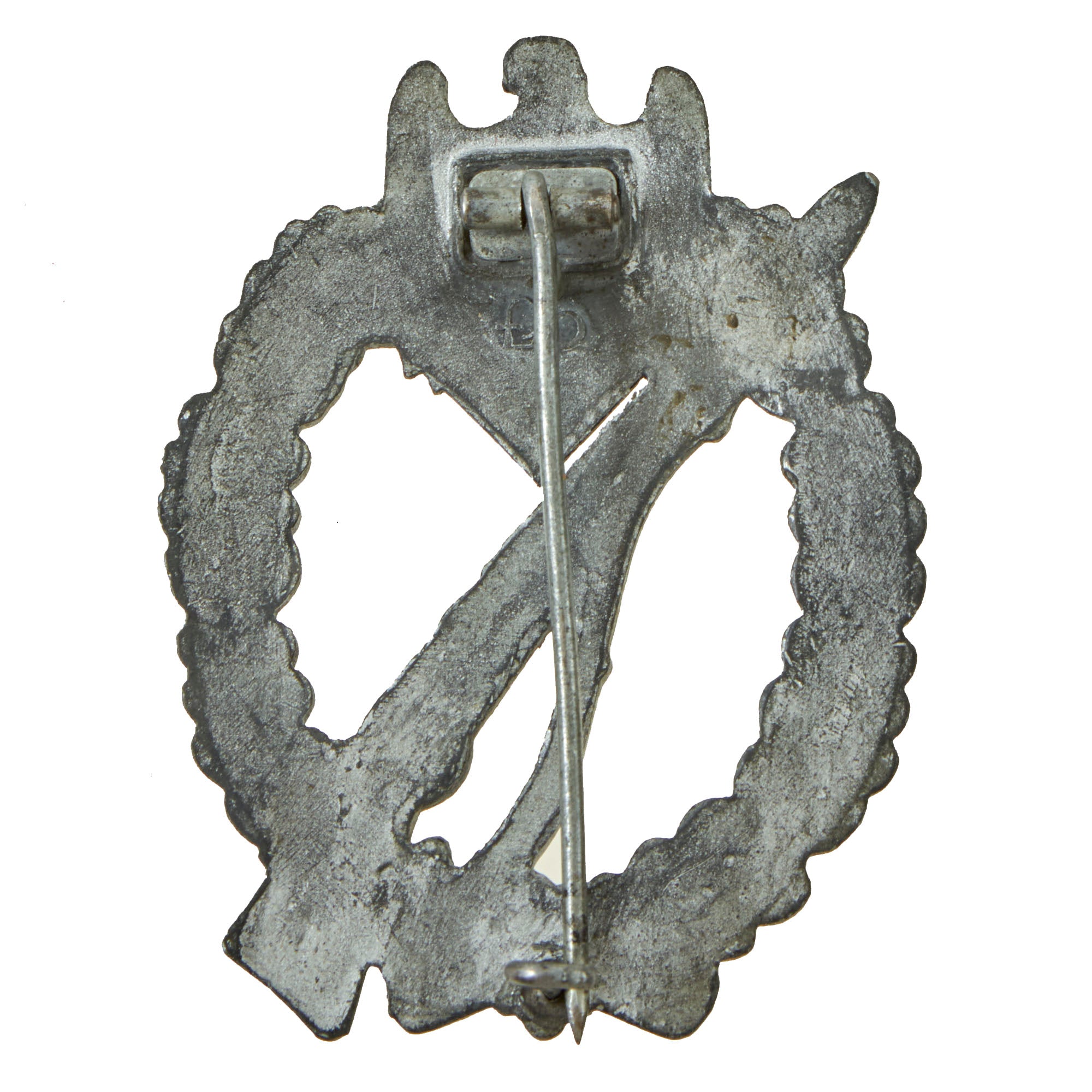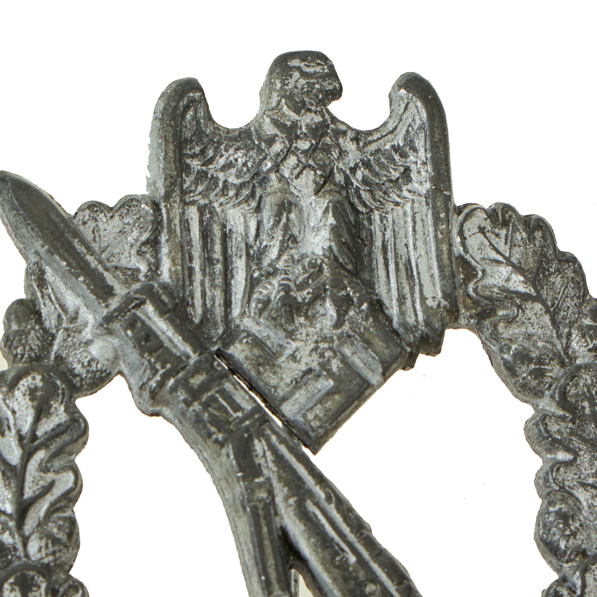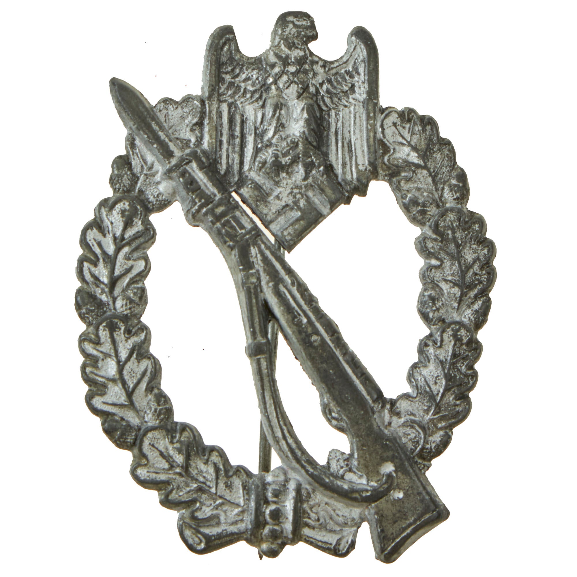 Original Items: Only One Available. Called in German a Infanterie-Sturmabzeichen in Silber, this genuine badge is constructed of silvered die-struck zinc. Over time, the silvering can wear and flake off, showing the oxidized base metal, however this example still retains a good amount of the original silver wash in areas and looks great!