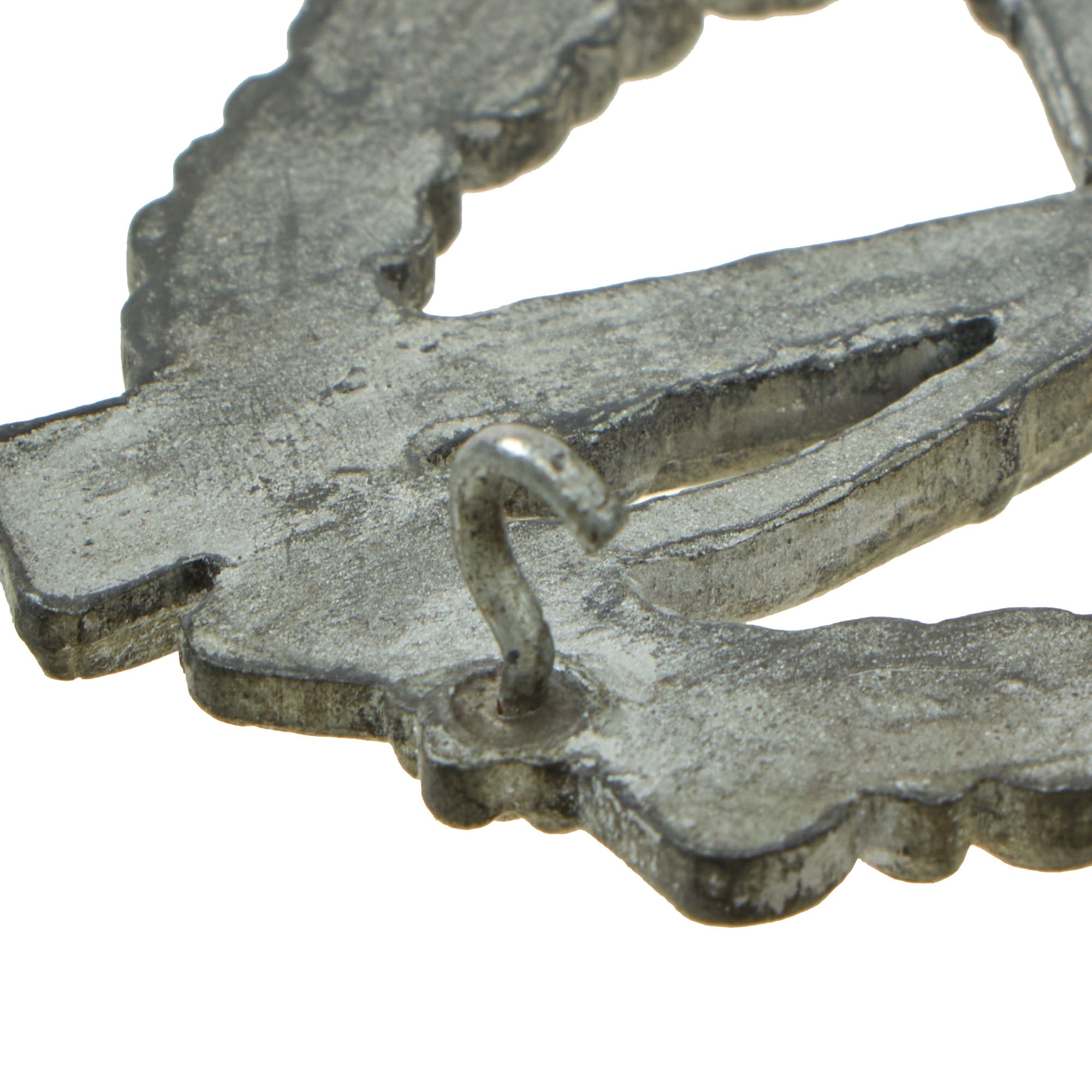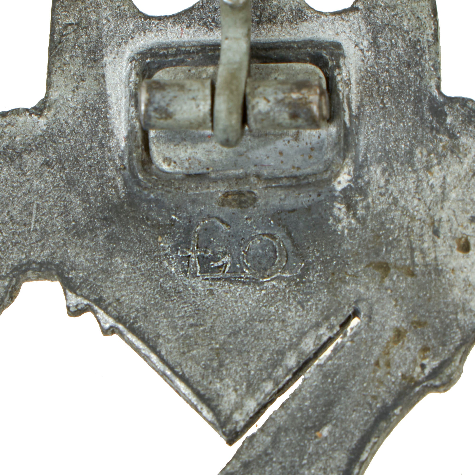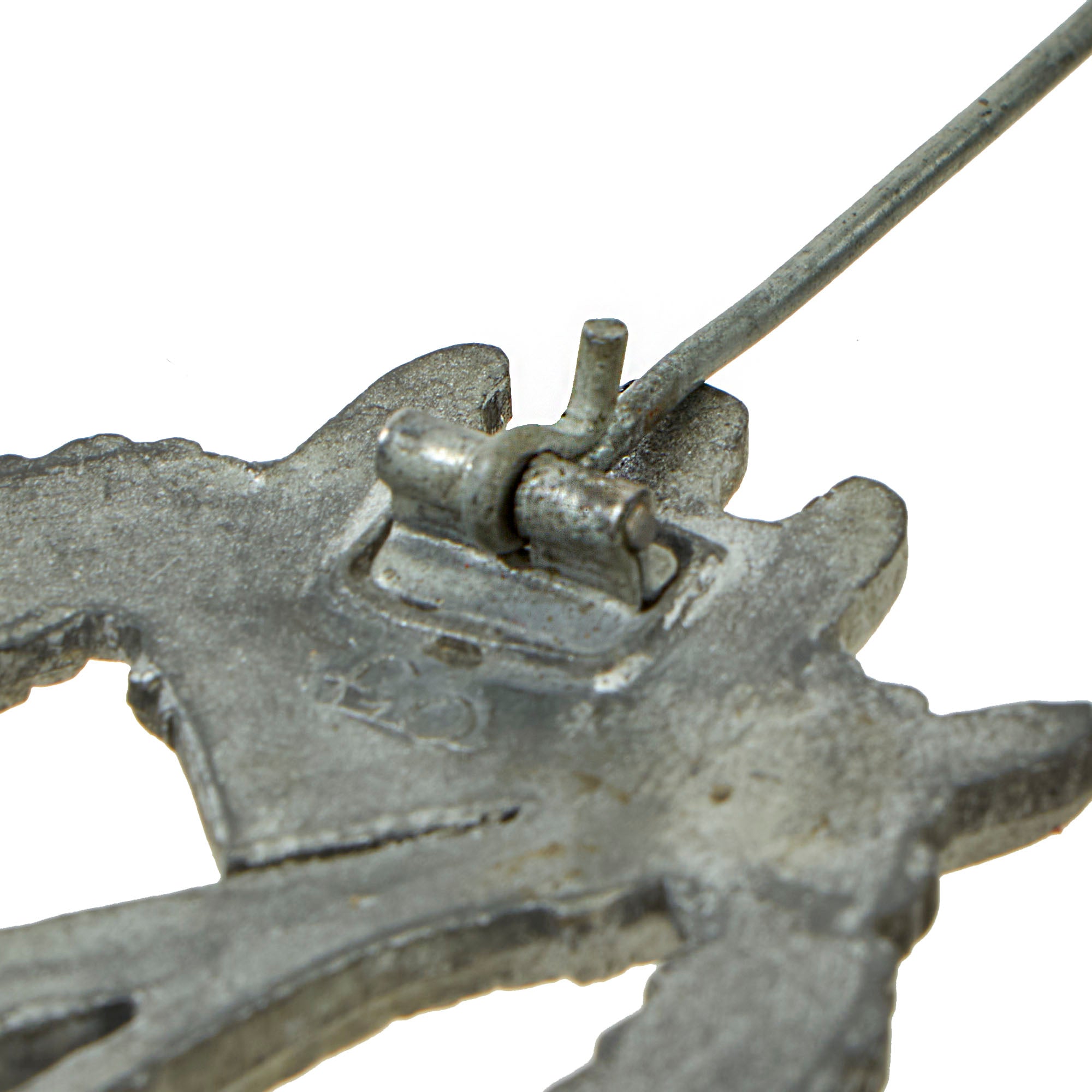The back of the eagle is marked with f. o. just under the hinge, the mark for Friedrich Orth of Wien (Vienna), Austria. This is definitely one of the rarer makers of the Infantry Assault Badge, and this is the only example we have ever had by this maker.