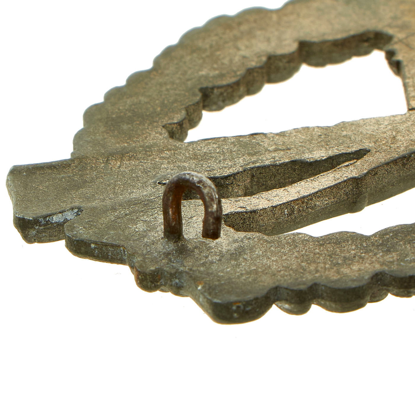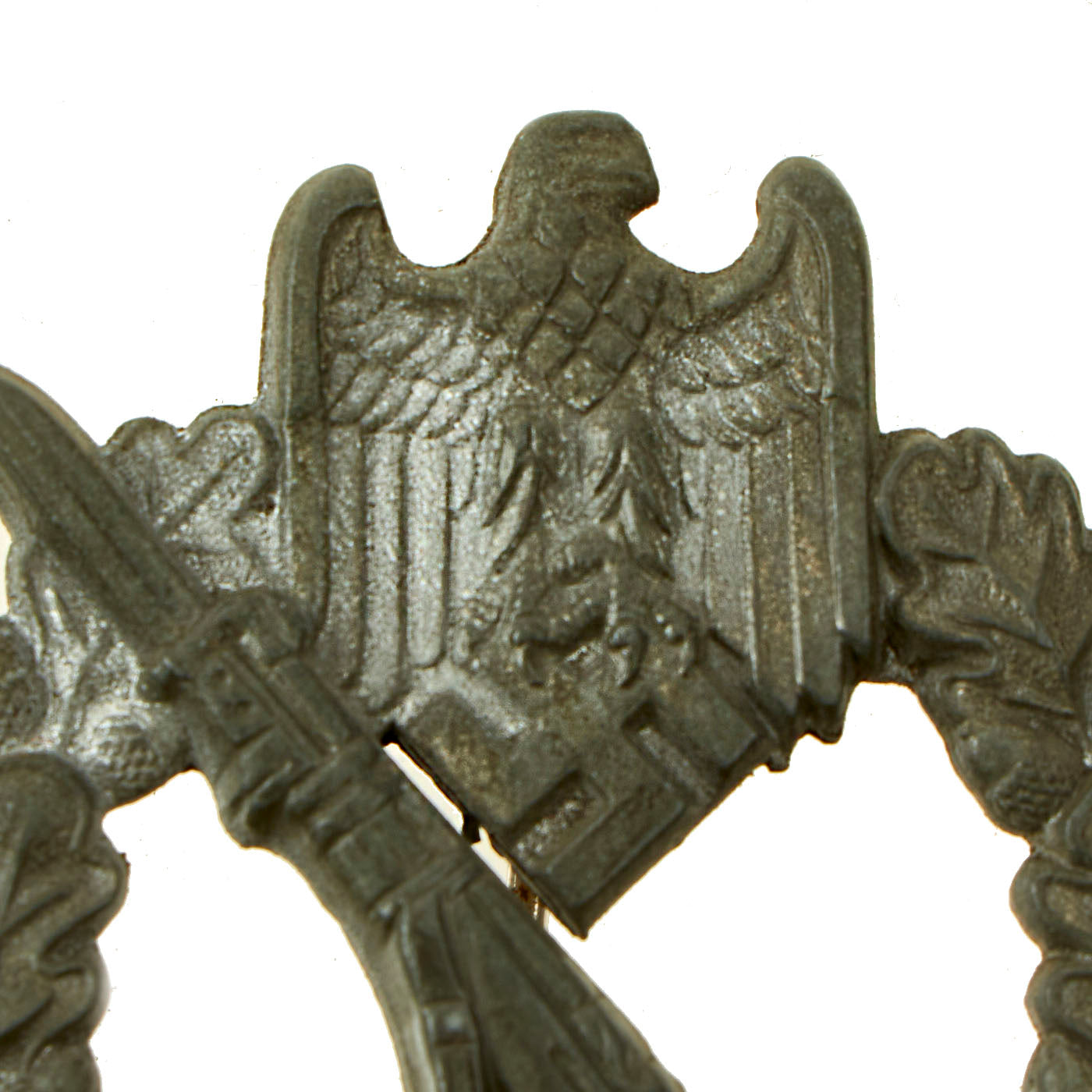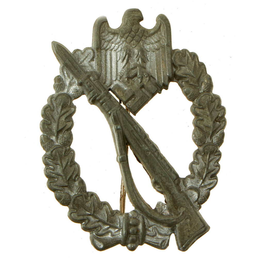 Original Items: Only One Available. Called in German a Infanterie-Sturmabzeichen in Silber, this genuine badge is constructed of silvered die-struck zinc. Over time, the silvering can wear and flake off, showing the oxidized base metal, which is grayish. This example still shows about 25% of the silver wash on the front, with 50% on the back. Considering that many examples we receive have it completely missing, this is definitely a better than average example.