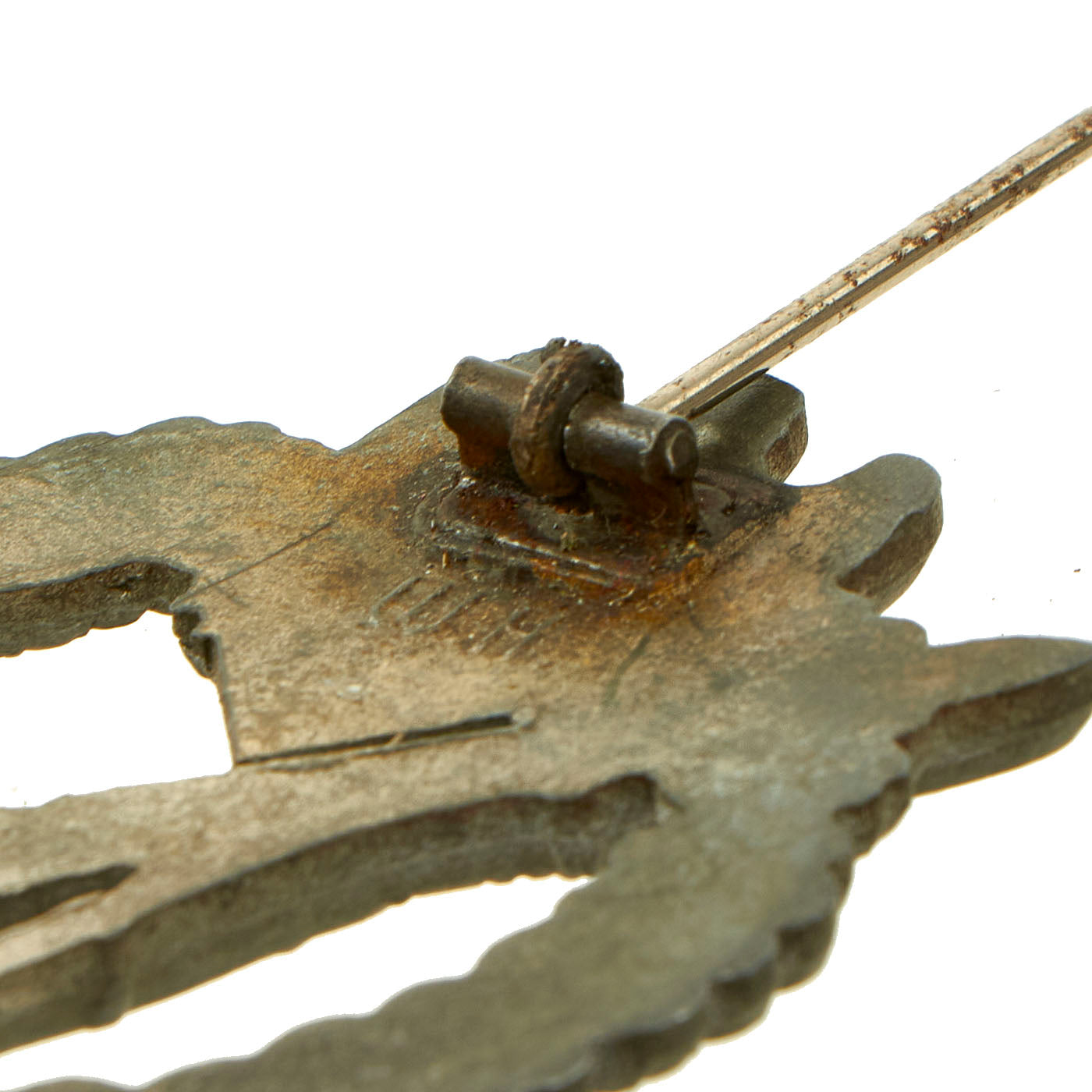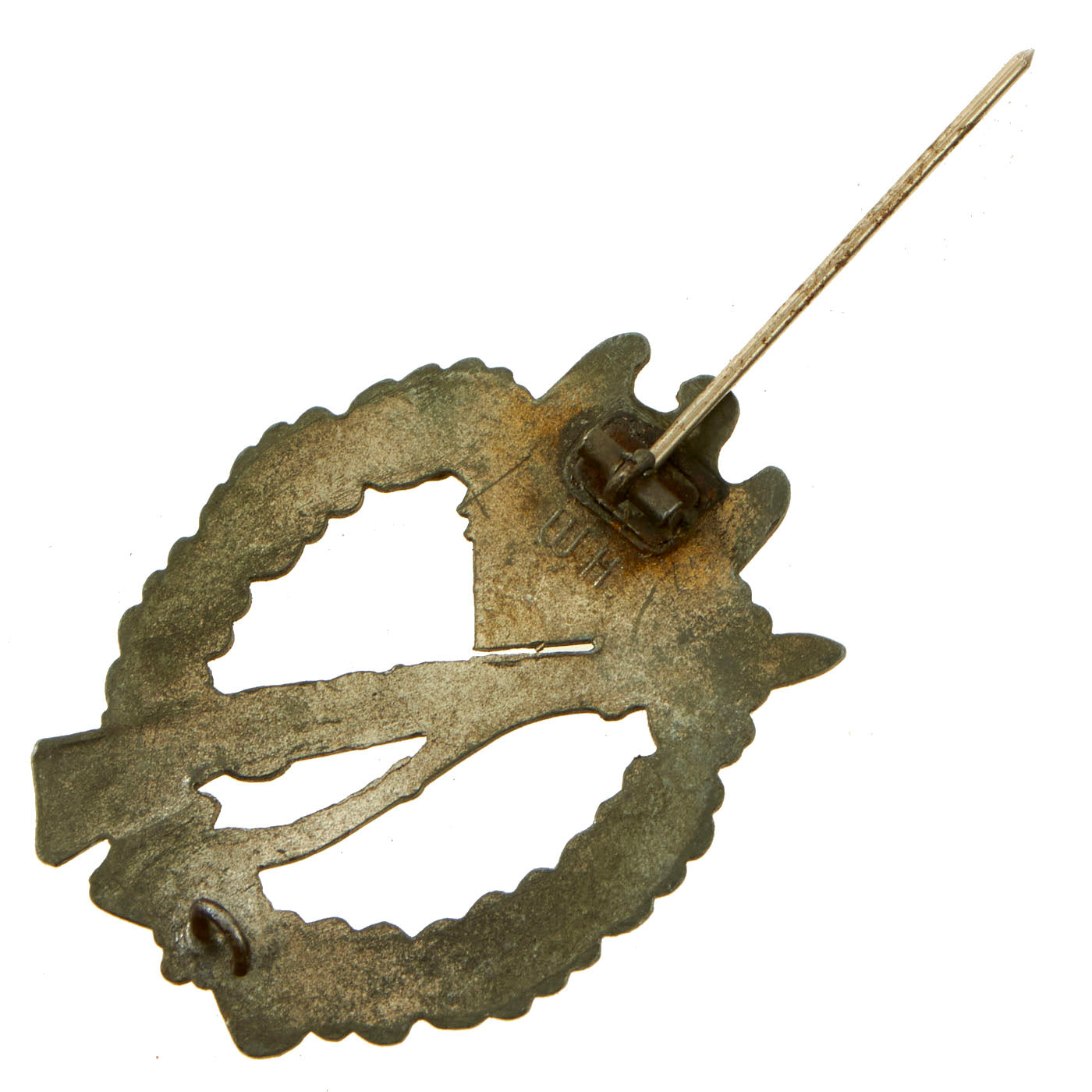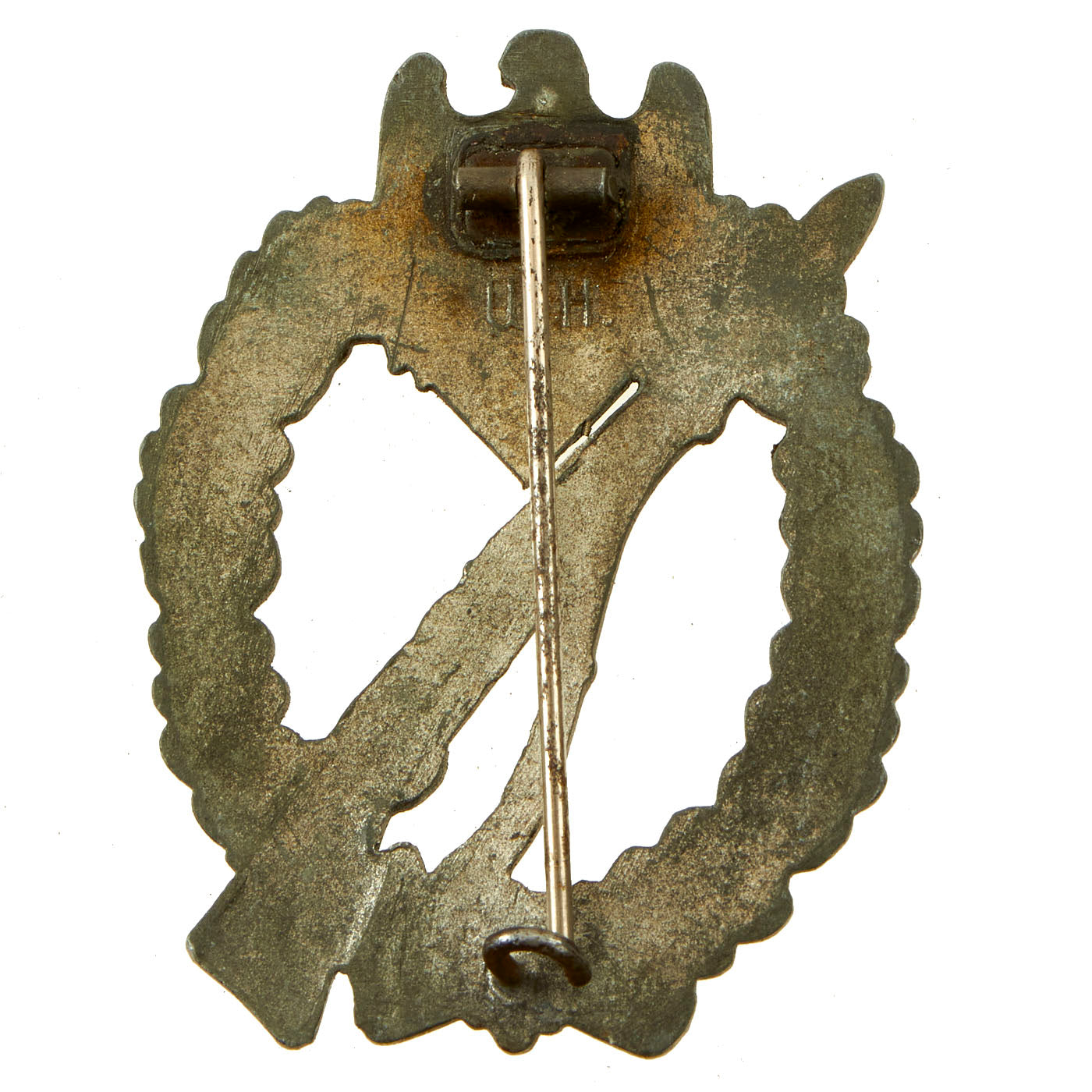 Original Items: Only One Available. Called in German a Infanterie-Sturmabzeichen in Silber, this genuine badge is constructed of silvered die-struck zinc. Over time, the silvering can wear and flake off, showing the oxidized base metal, which is grayish. This example still shows about 25% of the silver wash on the front, with 50% on the back. Considering that many examples we receive have it completely missing, this is definitely a better than average example.