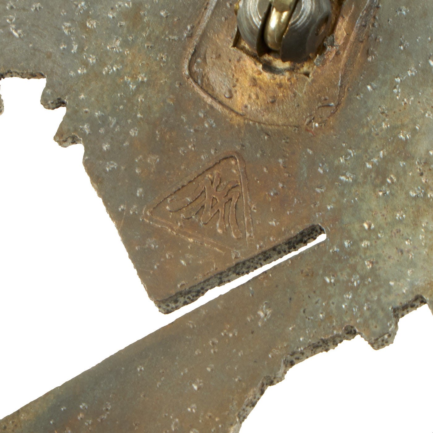 The design of the badge consists of an oval oak wreath tied together at the base via a ribbon, with a national eagle clutching a mobile swas (hook cross), with a vertically oriented Karabiner 98k with the bayonet attached to the front of the barrel and the carrying sling hanging from the rifle superimposed on the wreath. The reverse of the award is maker marked with an overlapping MK inside a triangle, a known maker mark that has yet to be identified. We have seen other examples much like this one.