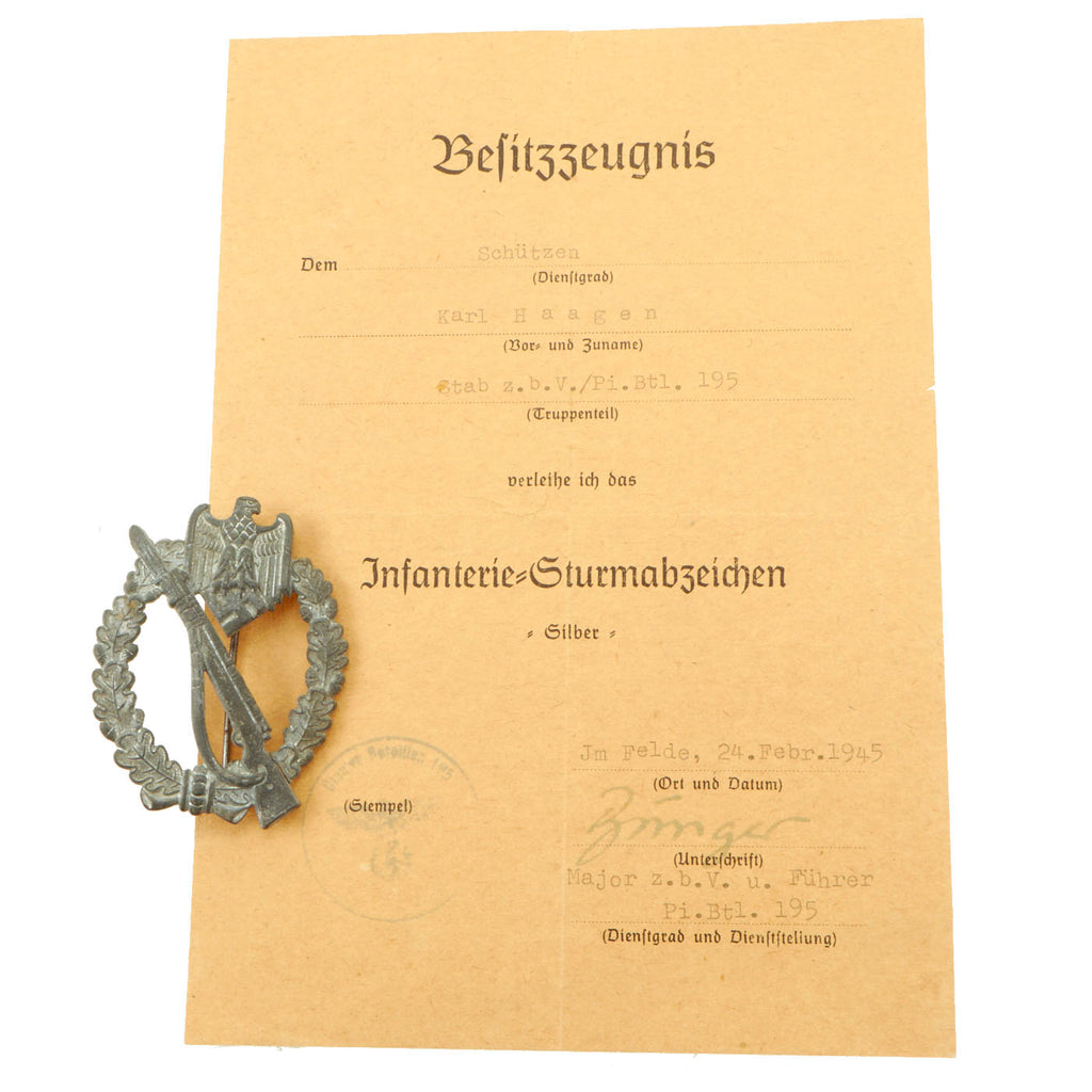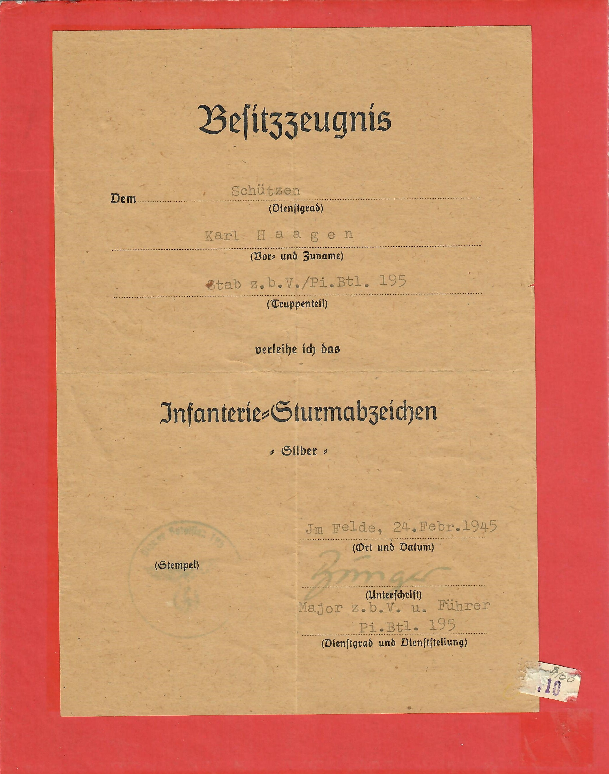The award document indicates that it was awarded to Schützen Karl Haagen of Stab z.b.V. / Pi.Btl. 195 (Infantryman Haagen, Headquarters, Pioneer Battalion 195). We have not been able to locate service information on Schützen Karl Haagen or specifics on the 195th Pioneer Battalion. We were able to find out that the 195th Pioneer Battalion operated under the 95th Infanterie-Division during the war.